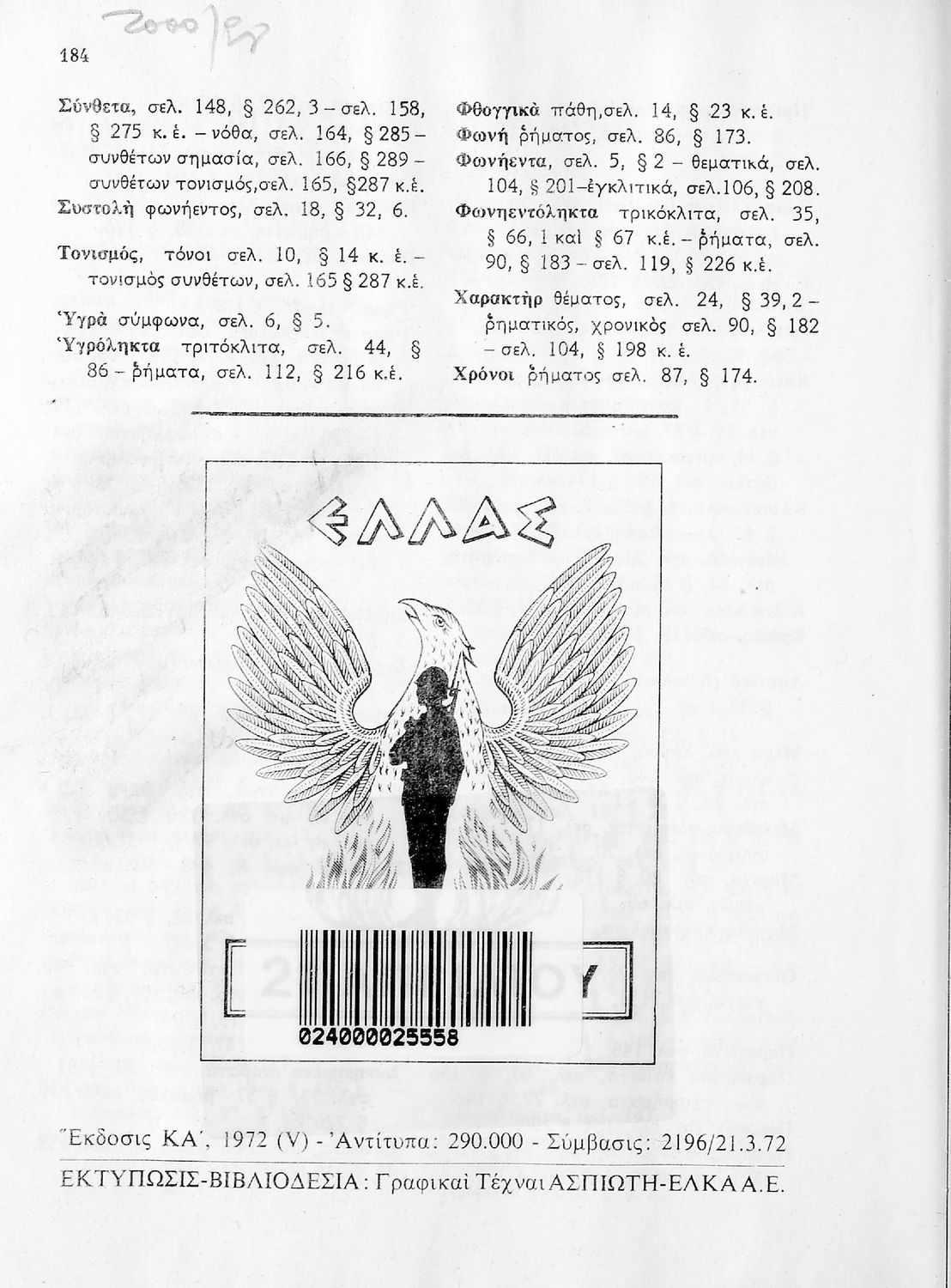 Σχολικό εγχειρίδιο Αρχαίων Ελληνικών Α', Β', Γ' και Δ' Γυμνασίου που περιέχει τους κανόνες γραμματικής και είναι χωρισμένο σε φθογγολογικό, τυπολογικό και ετυμολογικό μέρος. Περιέχει και κατάλογο ανωμάλων ρημάτων. Φέρει το σύμβολο της δικτατορίας.
