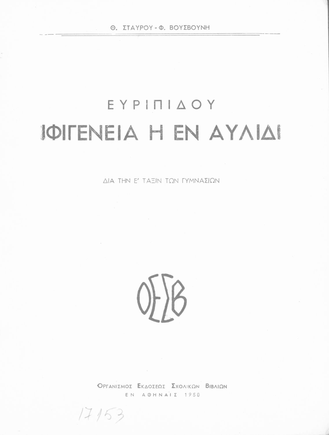 Τίτλος: Ευριπίδου Ιφιγένεια η εν Αυλίδι δια την Ε΄ Τάξιν των Γυμνασίων