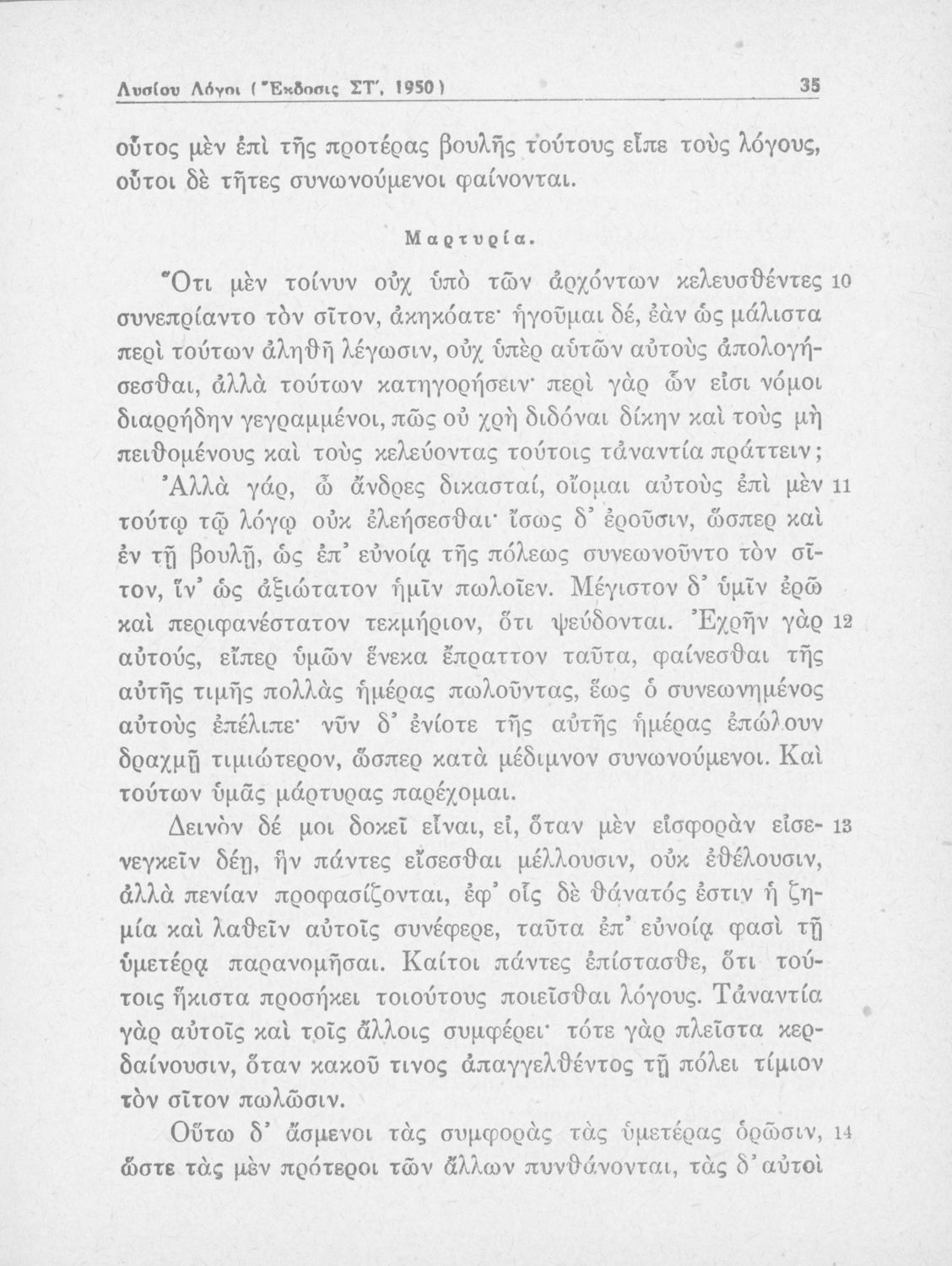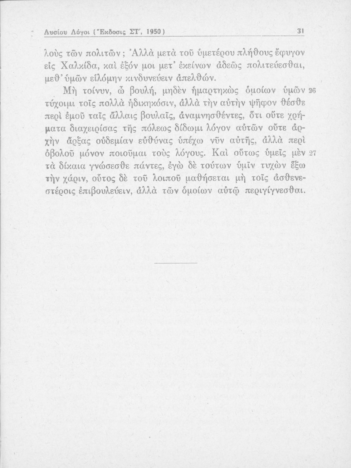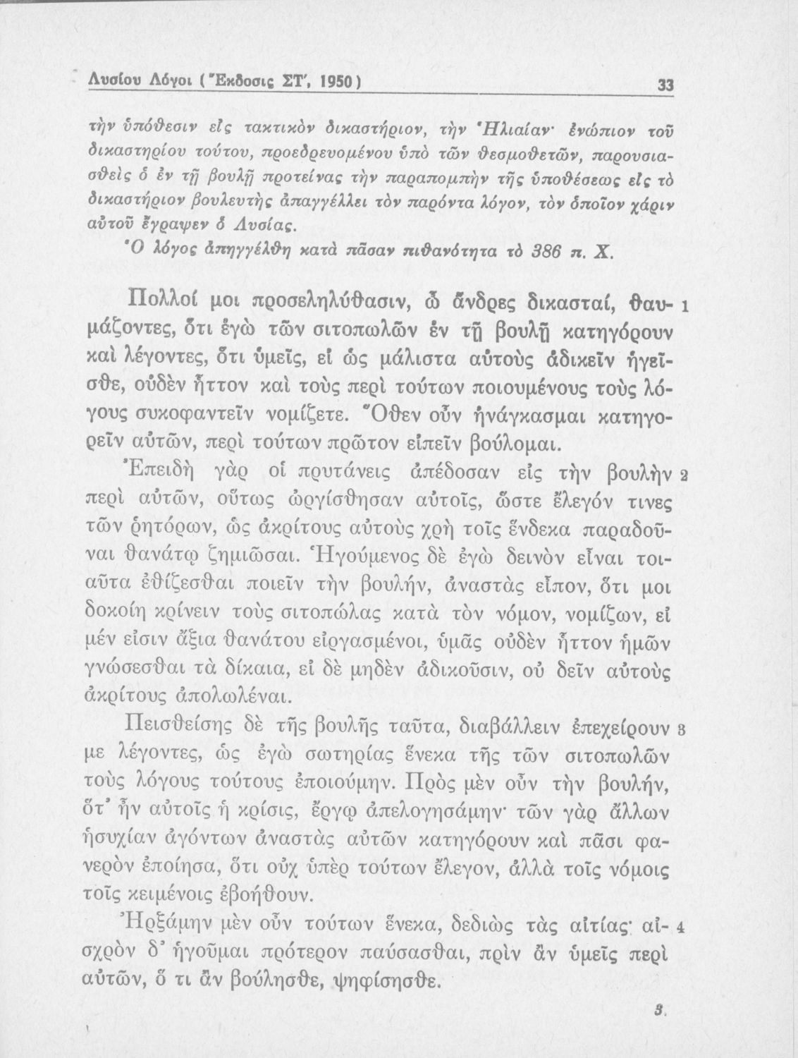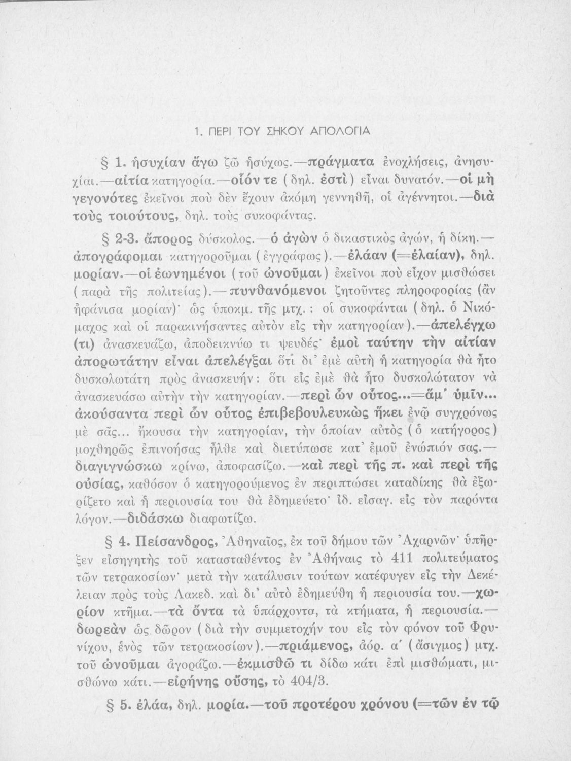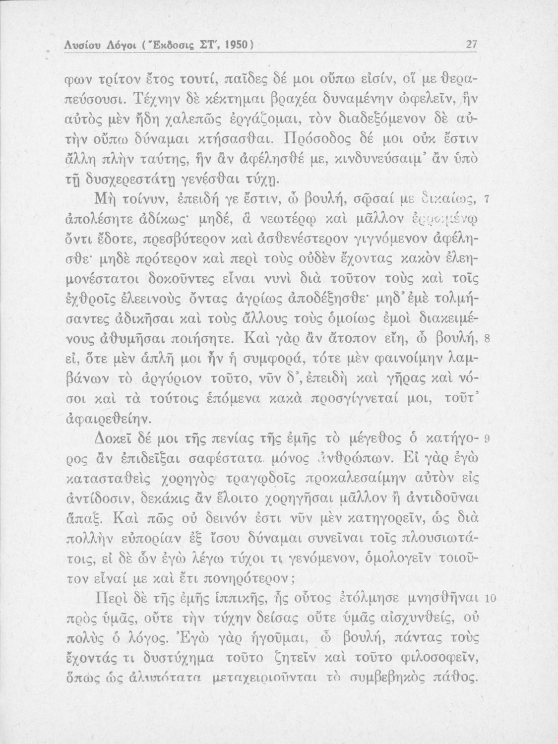 Σχολικό εγχειρίδιο Αρχαίων Ελληνικών που περιλαμβάνει τους Λόγους του Λυσία Περί του σηκού απολογία, Υπέρ του αδυνάτου, Κατά των σιτοπωλών και του Ισοκράτη Προς Δημόνικον, Προς Νικοκλέα και Ευαγόρας, εισαγωγή στους Λόγους και ερμηνευτικά σχόλια.
