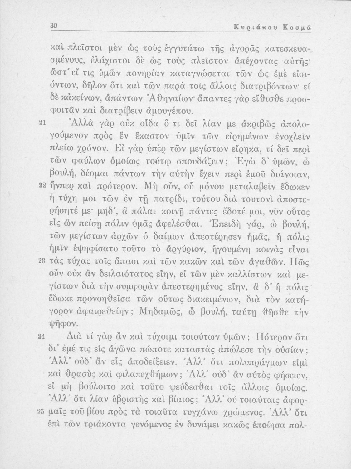 Βαθμίδα εκπαίδευσης: Δευτεροβάθμια Μάθημα: Αρχαία Ελληνικά Γλώσσα: Απλή καθαρεύουσα Παρουσίαση περιεχομένου: Σχολικό εγχειρίδιο Αρχαίων Ελληνικών που περιλαμβάνει τους Λόγους του Λυσία Περί του σηκού απολογία, Υπέρ του αδυνάτου, Κατά των σιτοπωλών και του Ισοκράτη Προς Δημόνικον, Προς Νικοκλέα και Ευαγόρας, εισαγωγή στους Λόγους και ερμηνευτικά σχόλια. |