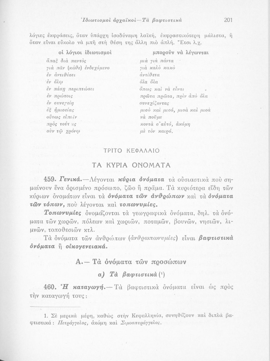 Μαθητικό βοήθημα Δημοτικού που περιλαμβάνει τη γραμματική και το συντακτικό της καθαρεύουσας και πίνακες παραδειγμάτων.