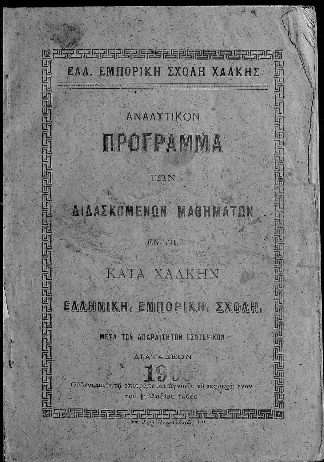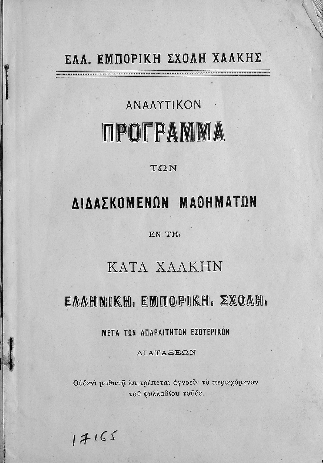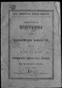 Τίτλος: Αναλυτικόν πρόγραμμα των διδασκομένων μαθημάτων εν τη κατά Χάλκη ελληνική εμπορική σχολή