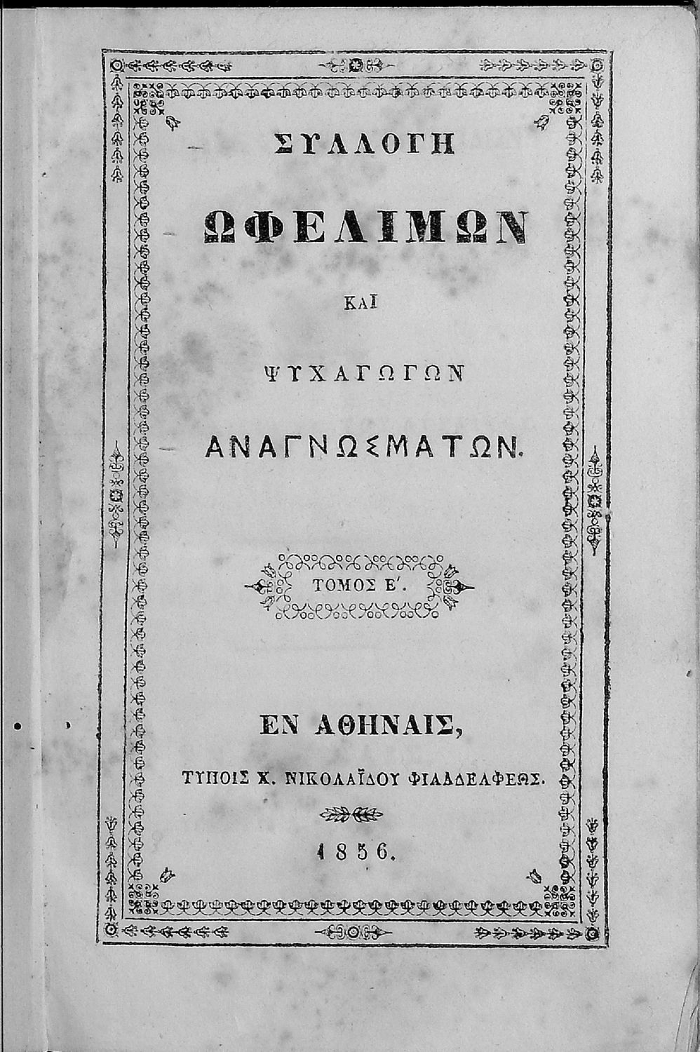 Τίτλος: Συλλογή ωφελίμων και ψυχαγωγών αναγνωσμάτων: Ψυχολογία προς διδασκαλίαν των παίδων (Γαλλωδέτος), Σύντομες παρατηρήσεις περί της ιστορίας, του κύρους και του σκοπού του Σαββάτου του, Ευλογία προς το ανθρώπινο γένος Η Κυριακή (Γούρνεϊ), Περί μετάνοιας (Γαλλωδέτος)