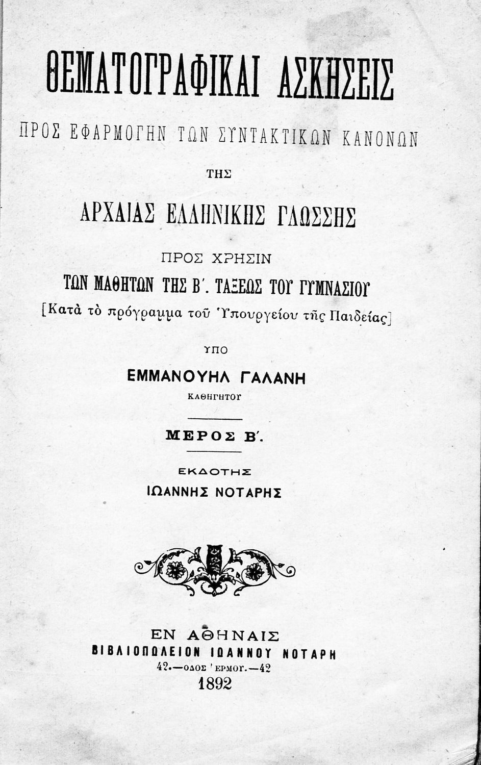 Τίτλος: Θεματογραφικαί ασκήσεις προς εφαρμογήν των Συντακτικών κανόνων της αρχαίας ελληνικής γλώσσης, Μέρος Β΄ προς χρήσιν των μαθητών της Β΄ και Γ΄ τάξεως των Γυμνασίων