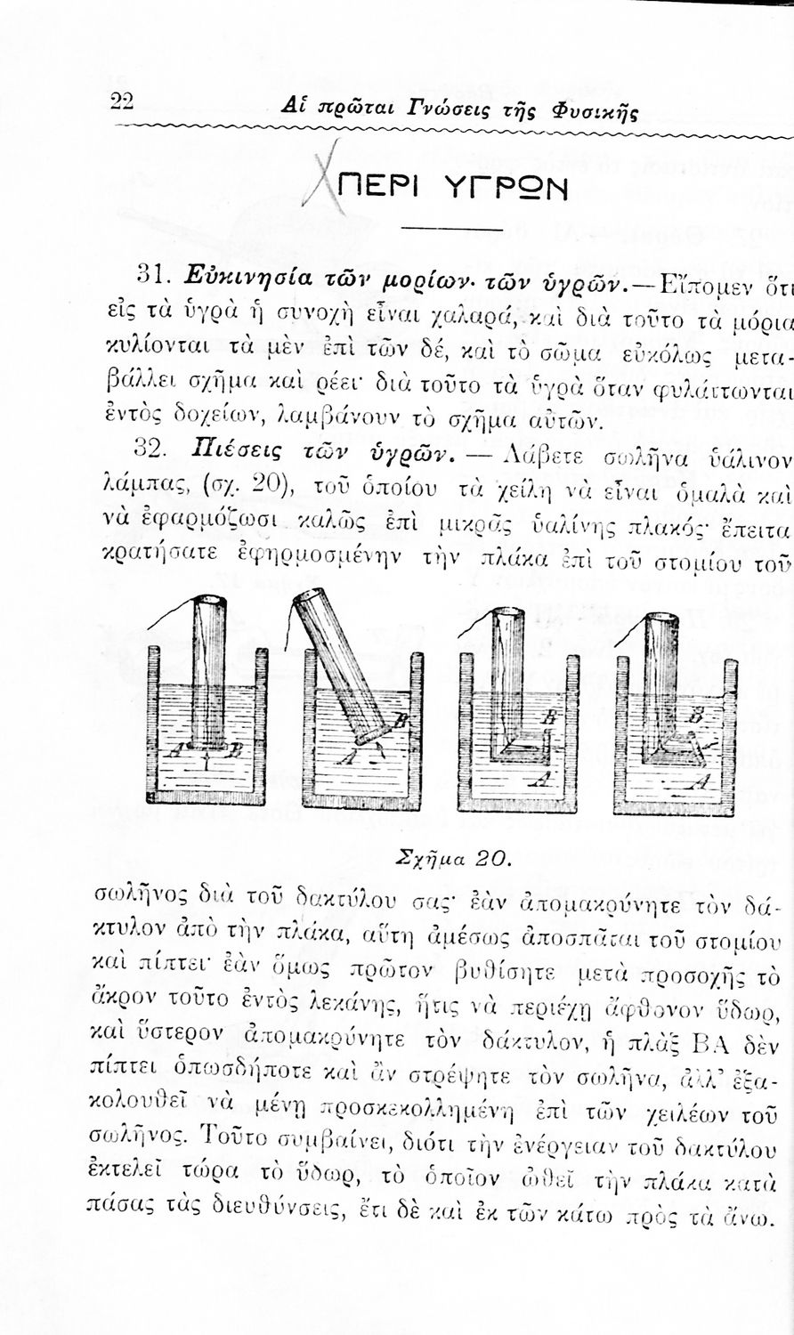 Παρουσίαση περιεχομένου: Μαθητικό βοήθημα Φυσικής και Χημείας Δημοτικού που περιέχει στοιχειώδεις γνώσεις για τα φυσικά και χημικά φαινόμενα. Ο συγγραφέας ήταν διδάκτορας της Ιατρικής και των Φυσικομαθηματικών.
