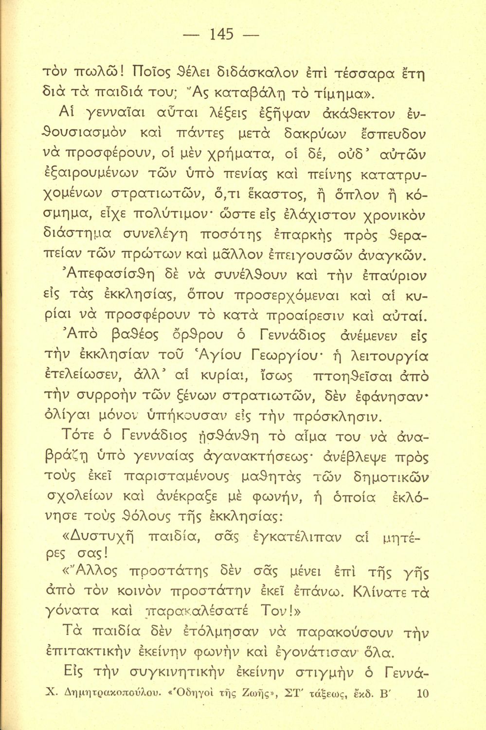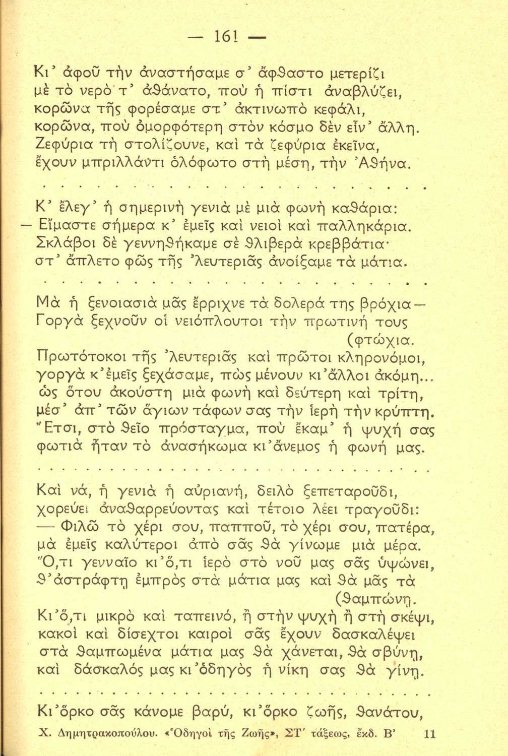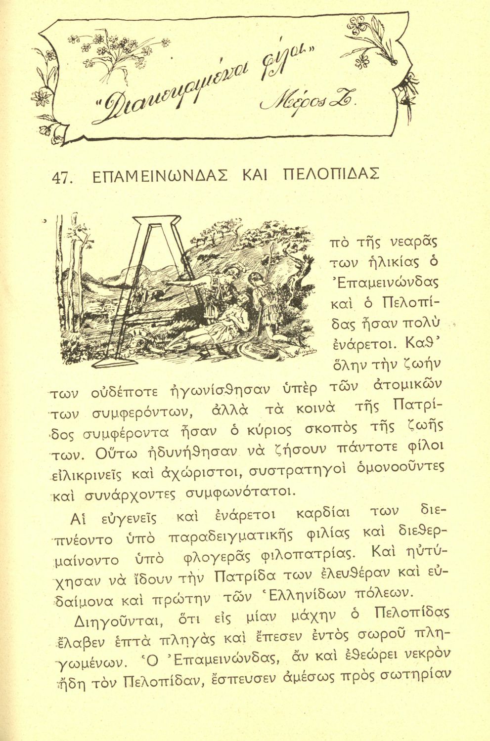 Βαθμίδα εκπαίδευσης: Πρωτοβάθμια Τάξη: ΣΤ' Δημοτικού Μάθημα: Νέα Ελληνικά Γλώσσα: Καθαρεύουσα Παρουσίαση περιεχομένου: Αναγνωστικό της ΣΤ΄ Δημοτικού που κυκλοφόρησε σε 7.000 αντίτυπα 25 ημέρες πριν την 4η Αυγούστου 1936, οπότε κατά την επόμενη σχολική χρονιά διδάχτηκε ελάχιστα και η έκδοσή του με αυτή την μορφή σταμάτησε. |