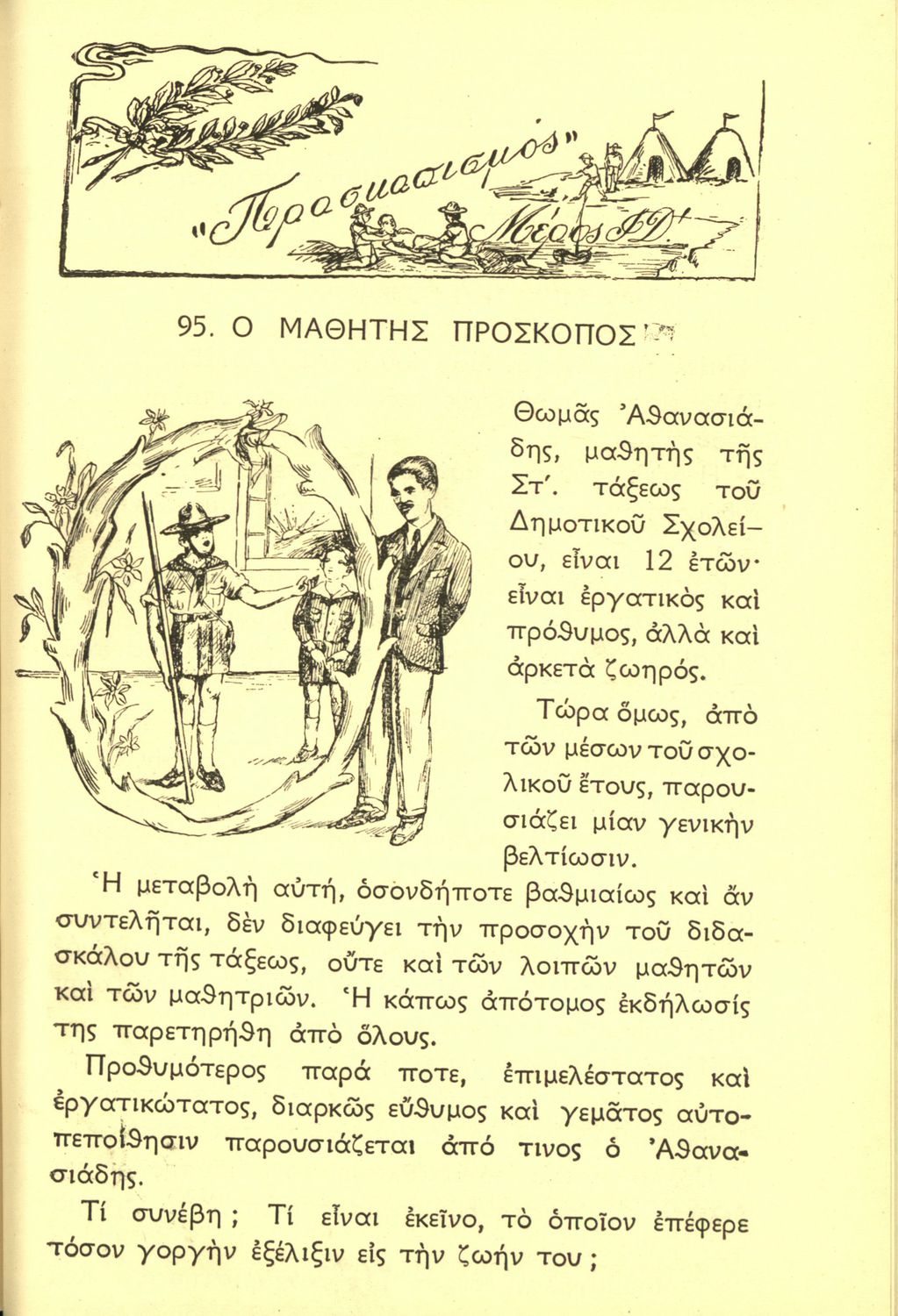 Αναγνωστικό της ΣΤ΄ Δημοτικού που κυκλοφόρησε σε 7.000 αντίτυπα 25 ημέρες πριν την 4η Αυγούστου 1936, οπότε κατά την επόμενη σχολική χρονιά διδάχτηκε ελάχιστα και η έκδοσή του με αυτή την μορφή σταμάτησε.