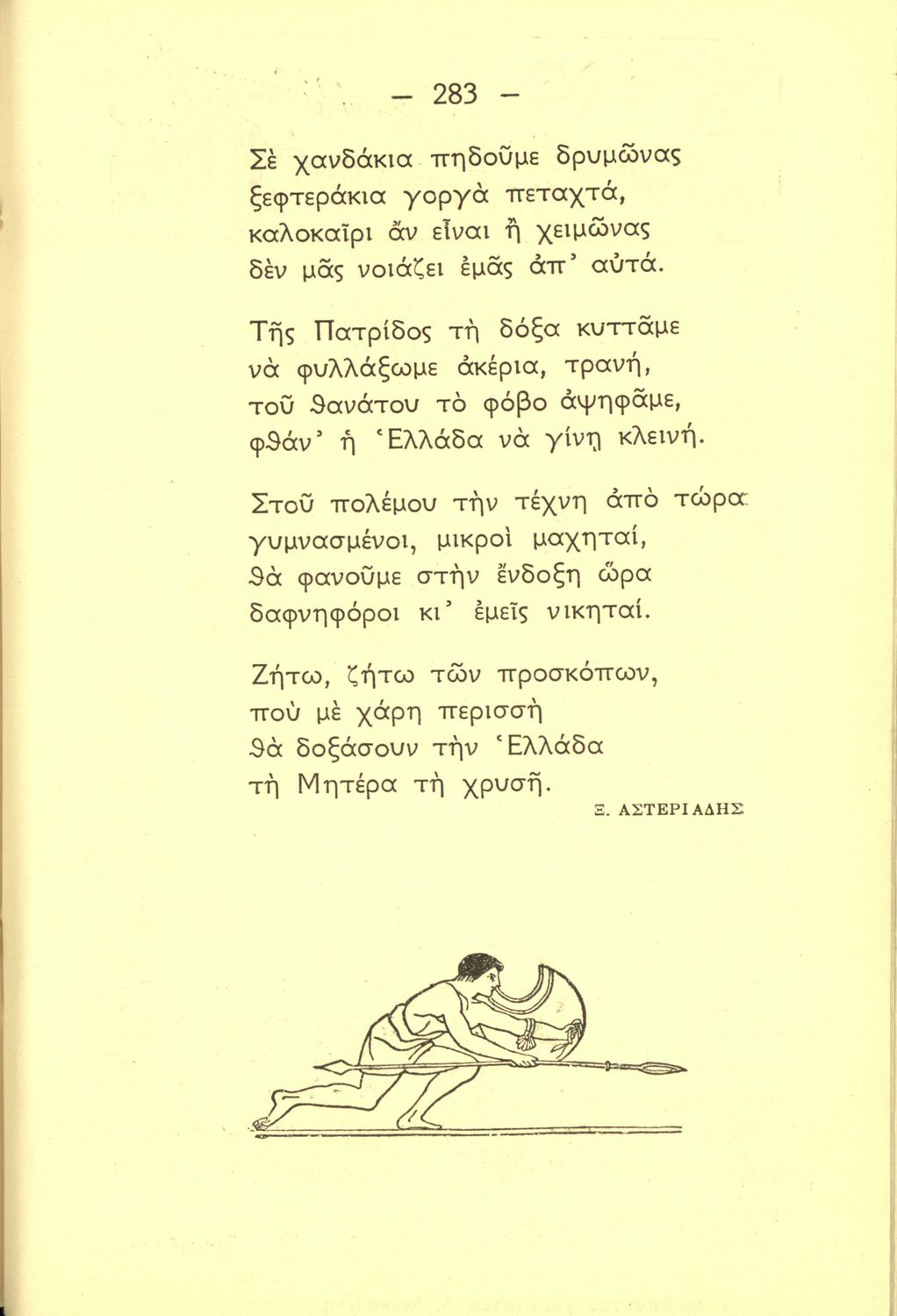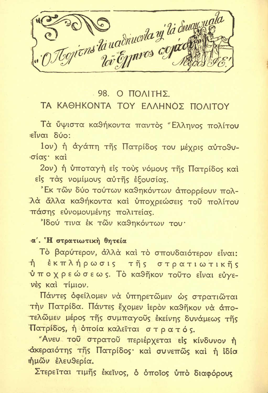 Αναγνωστικό της ΣΤ΄ Δημοτικού που κυκλοφόρησε σε 7.000 αντίτυπα 25 ημέρες πριν την 4η Αυγούστου 1936, οπότε κατά την επόμενη σχολική χρονιά διδάχτηκε ελάχιστα και η έκδοσή του με αυτή την μορφή σταμάτησε.