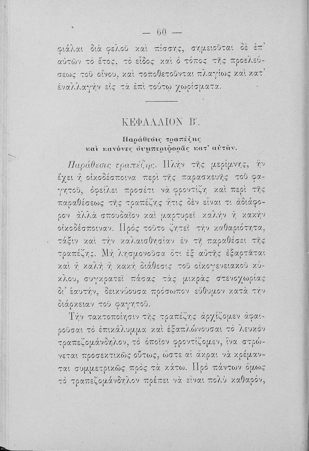 Σχολικό εγχειρίδιο για τις τάξεις του Παρθεναγωγείου για το μάθημα της Οικιακής Οικονομίας. Το εγχειρίδιο περιλαμβάνει τις βασικές γνώσεις οργάνωσης και διοίκησης της κατοικίας, του κανονισμού χρόνου εργασίας ...