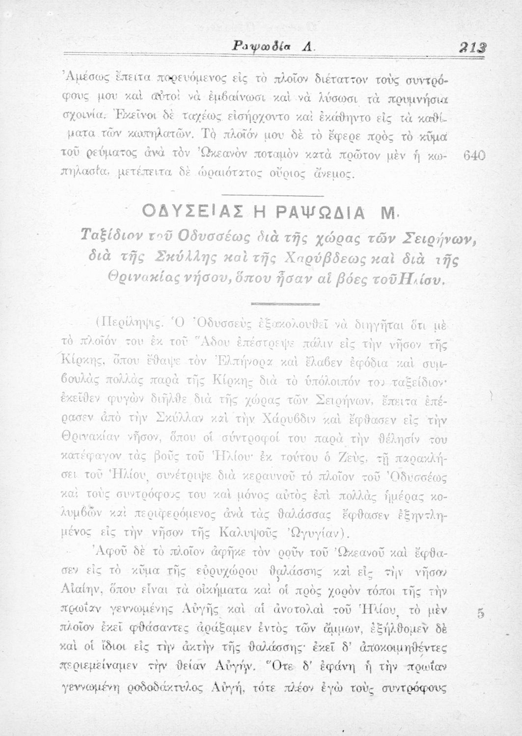 Παιδαγωγικό βοήθημα Αρχαίων Ελληνικών που περιλαμβάνει μετάφραση της Ομήρου Οδύσσειας στη νέα ελληνική, εισαγωγή στην επική ποίηση και στην Οδύσσεια, περιλήψεις και σημειώσεις.