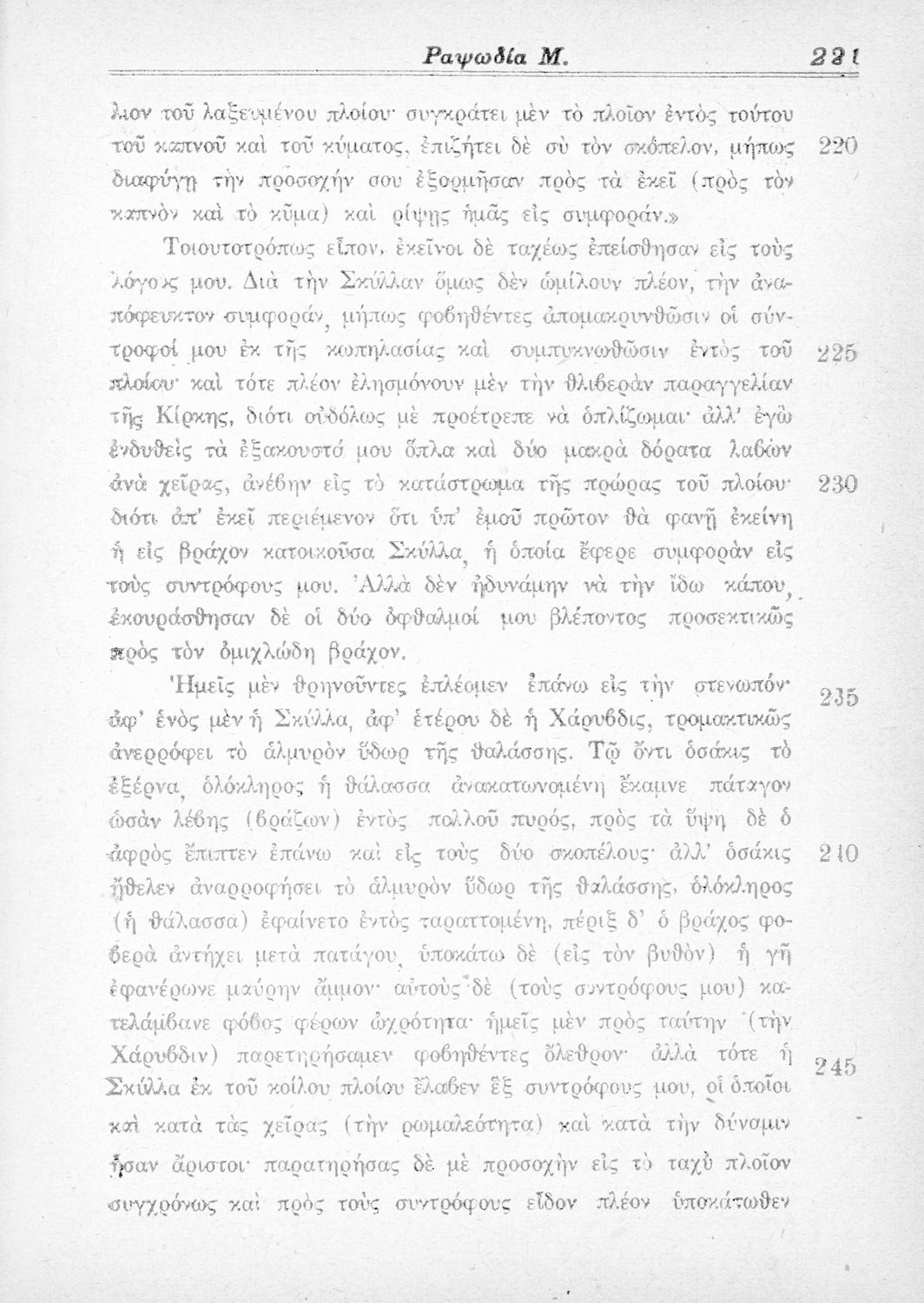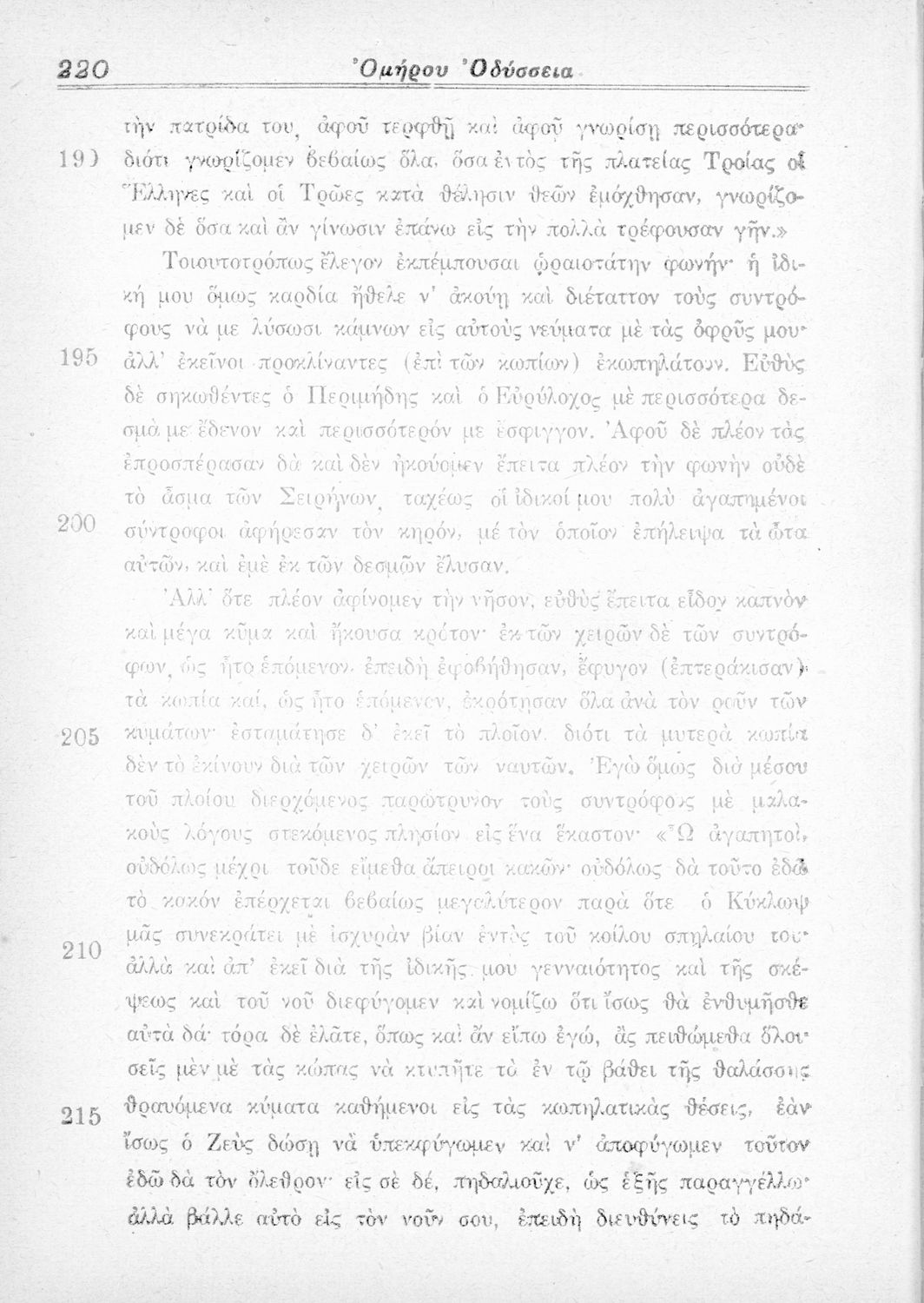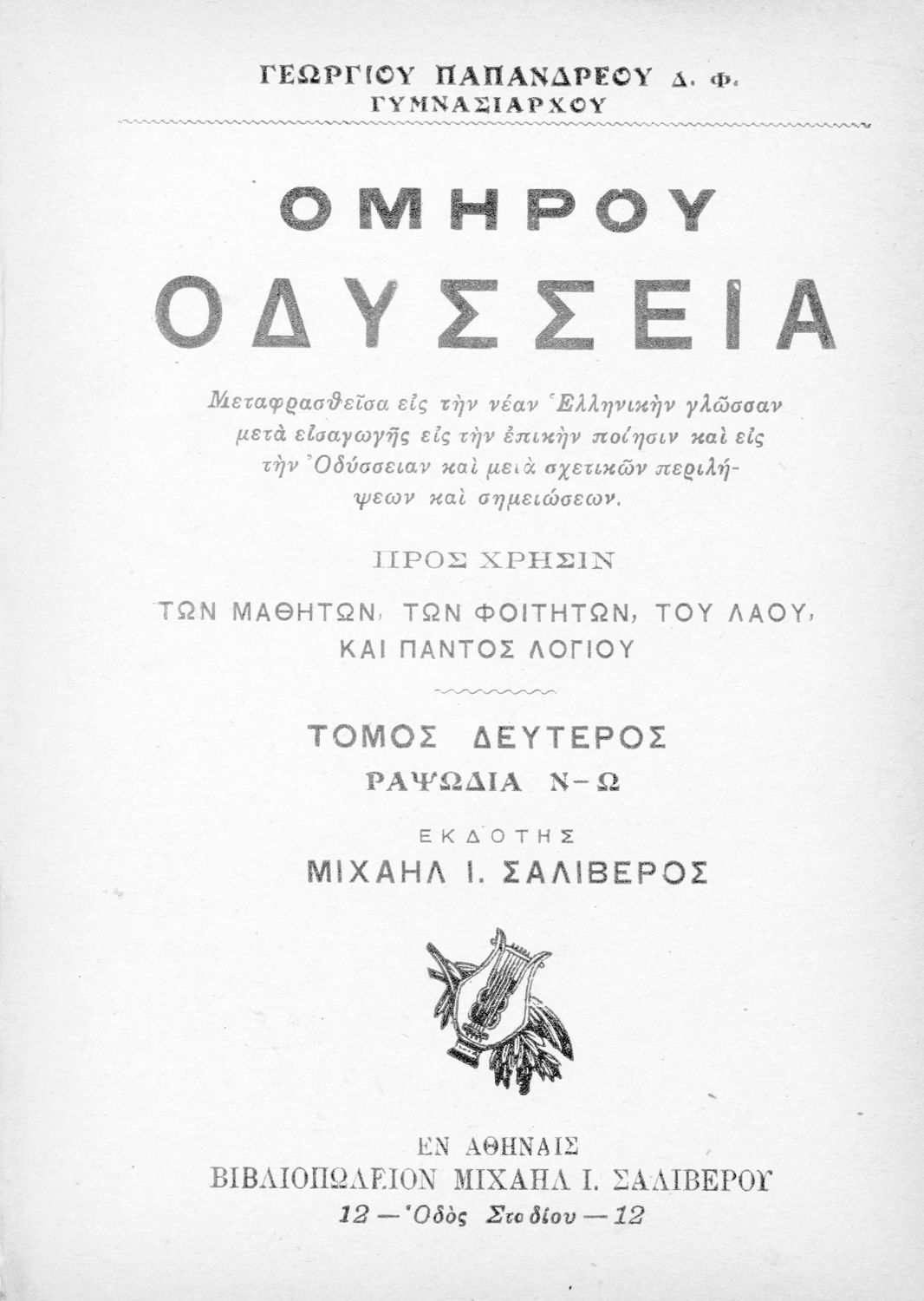 Παιδαγωγικό βοήθημα Αρχαίων Ελληνικών που περιλαμβάνει μετάφραση της Ομήρου Οδύσσειας στη νέα ελληνική, εισαγωγή στην επική ποίηση και στην Οδύσσεια, περιλήψεις και σημειώσεις.