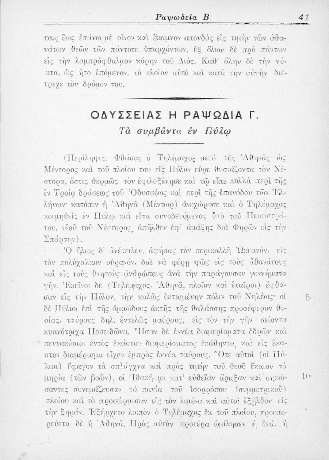 Μαθητικό βοήθημα εγκεκριμένο για το μάθημα των Αρχαίων. Περιλαμβάνει ραψωδίες της Οδύσσειας με ερμηνευτικές του συγγραφέα.