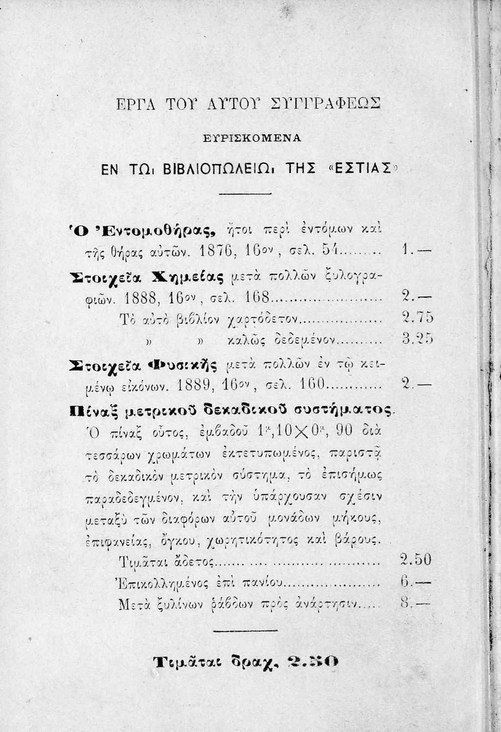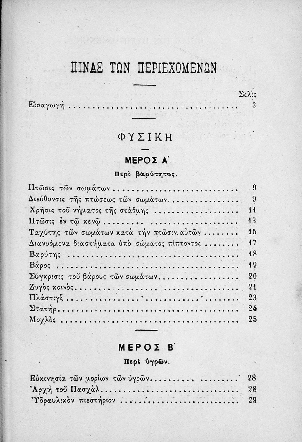 Τίτλος: Φυσιογνωσία ήτοι στοιχειώδεις γνώσεις Φυσικής, Χημείας και Κοσμογραφίας προς χρήσιν των μαθητών της Γ΄ τάξεως Ελληνικών Σχολείων