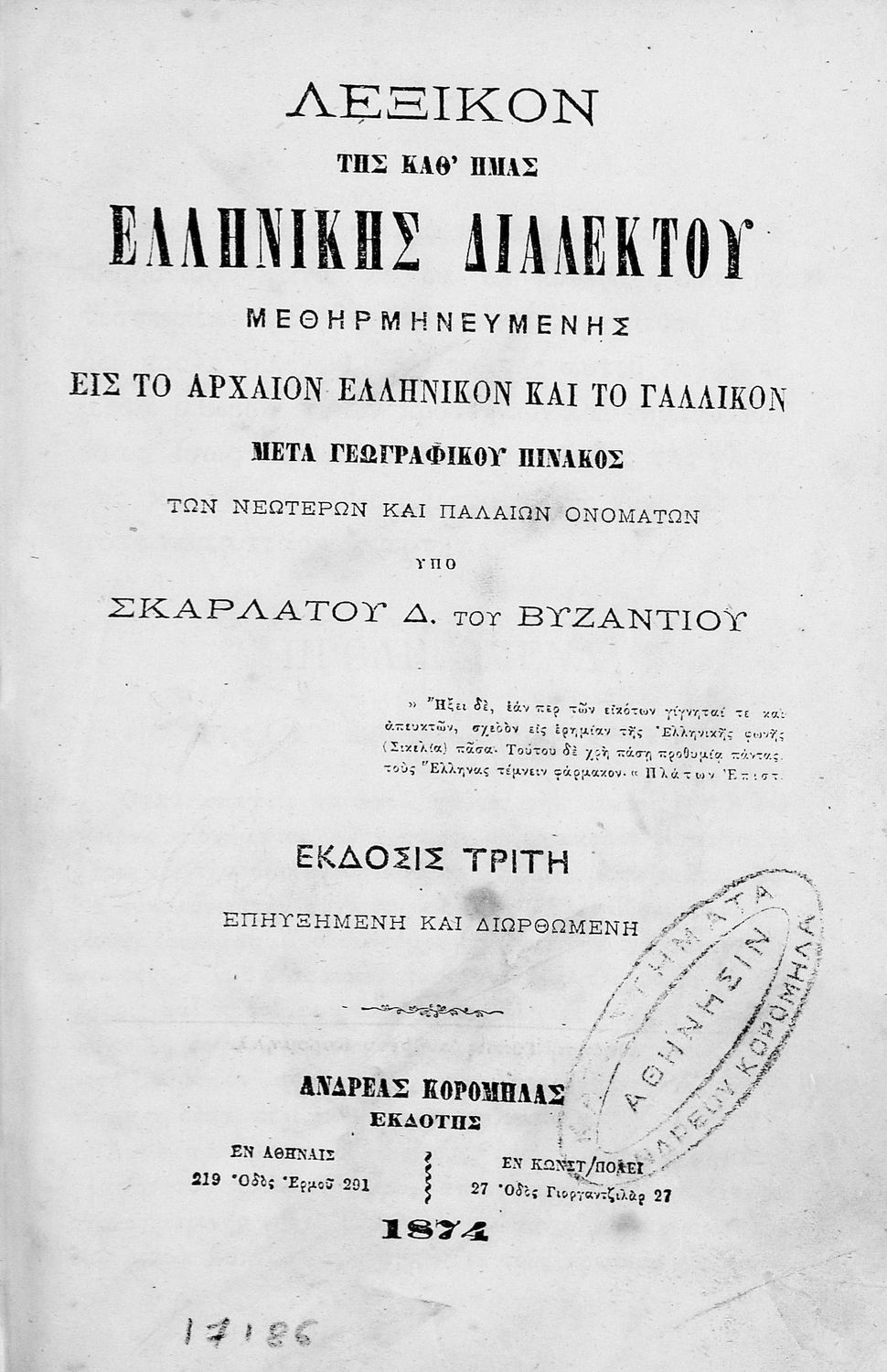 Τίτλος: Λεξικόν της καθ’ημάς ελληνικής διαλέκτου μεθηρμηνευμένης εις το αρχαίον ελληνικόν και το γαλλικόν