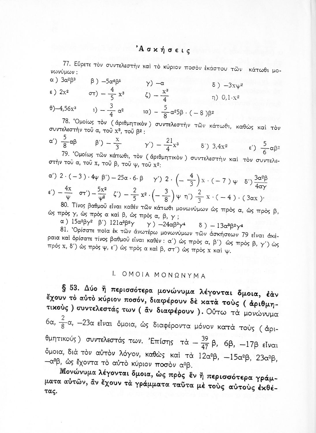 Σχολικό εγχειρίδιο Άλγεβρας Γυμνασίου που εστιάζει στις αλγεβρικές πράξεις και παραστάσεις και είναι χωρισμένο σε θεωρία και ασκήσεις.