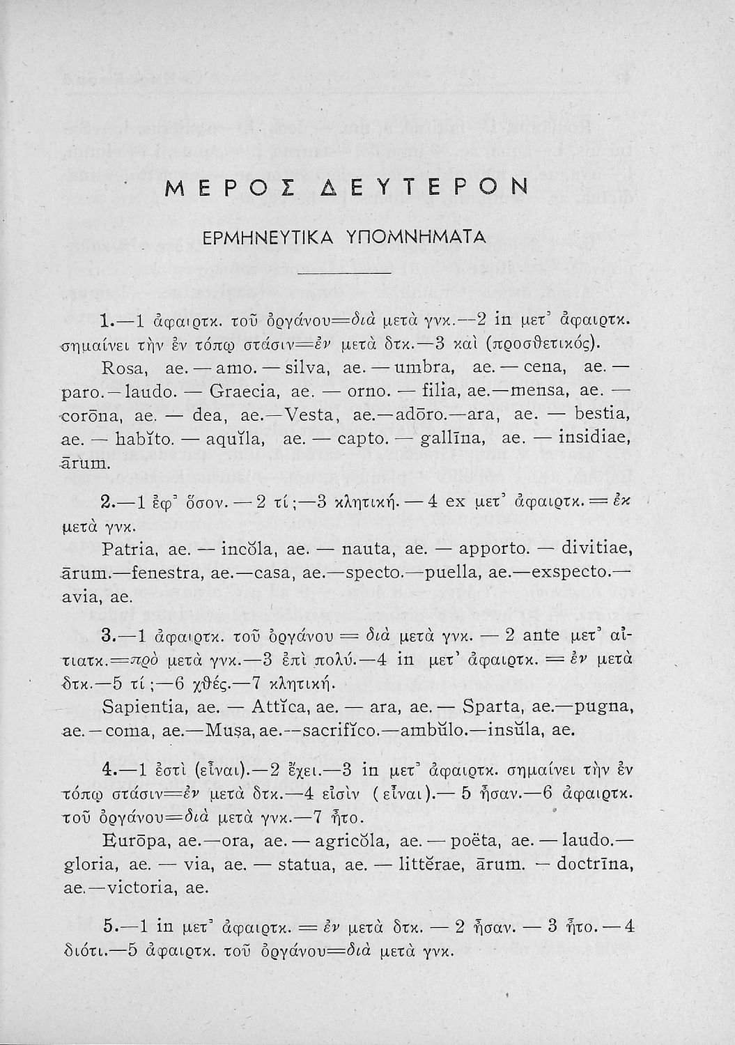 Σχολικό εγχειρίδιο Λατινικών Δ΄ Γυμνασίου που περιέχει 54 κείμενα/περικοπές για τη διδασκαλία της γραμματικής, ερμηνευτικά υπομνήματα, λεξιλόγιο και κατάλογο με τα συντακτικά φαινόμενα (αφαιρετική, προθέσεις, ...