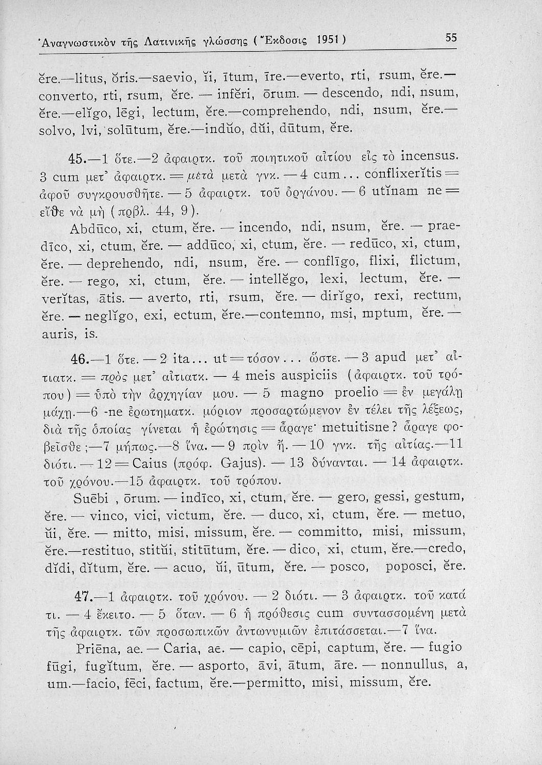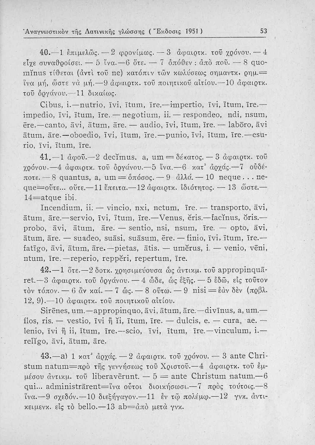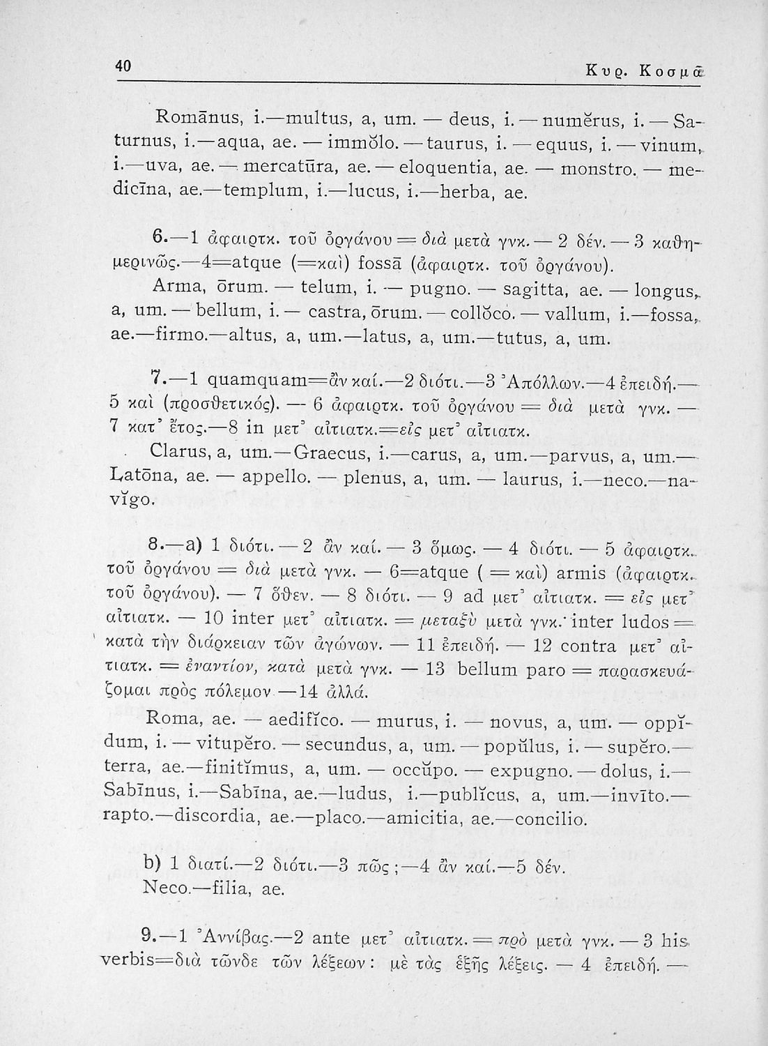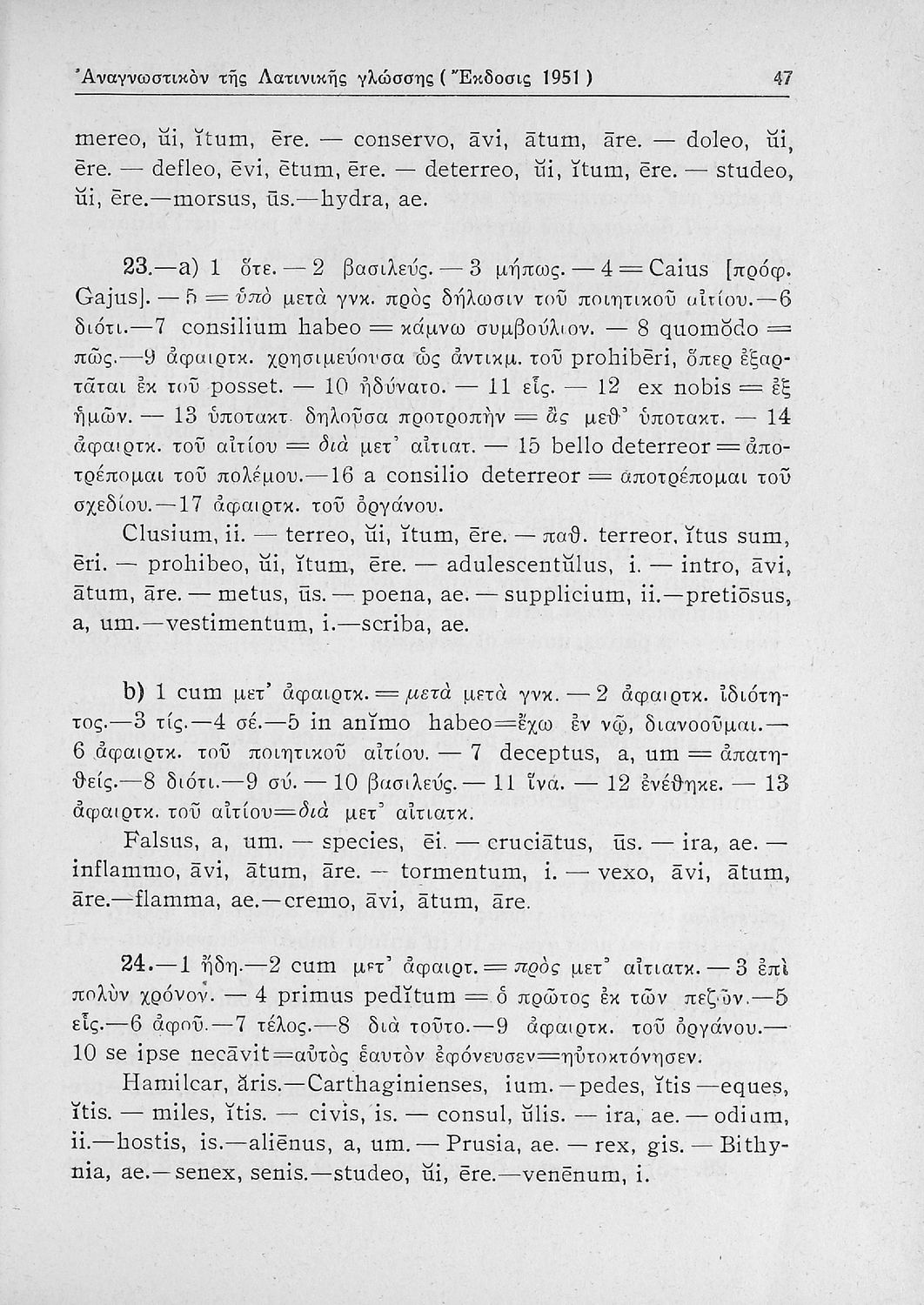 Σχολικό εγχειρίδιο Λατινικών για τη Γ΄ Γυμνασίου που περιέχει 54 κείμενα/περικοπές στα λατινικά, ερμηνευτικά υπομνήματα, λεξιλόγιο και κατάλογο με τα συντακτικά φαινόμενα (αφαιρετική, προθέσεις, σύνδεσμοι) που