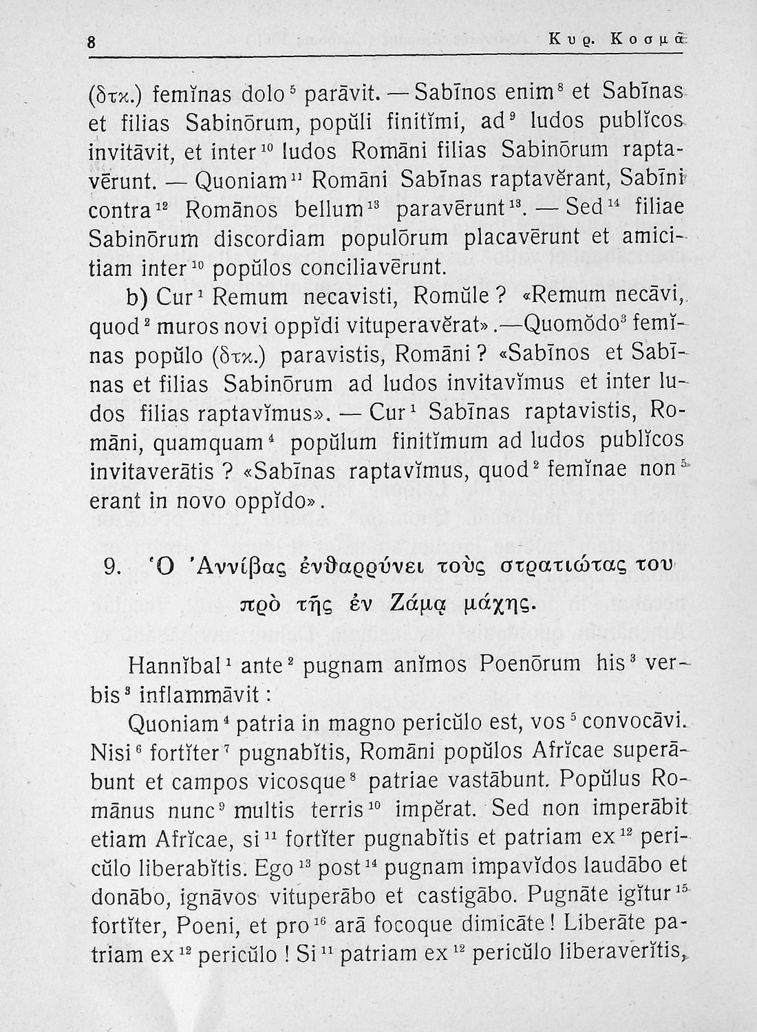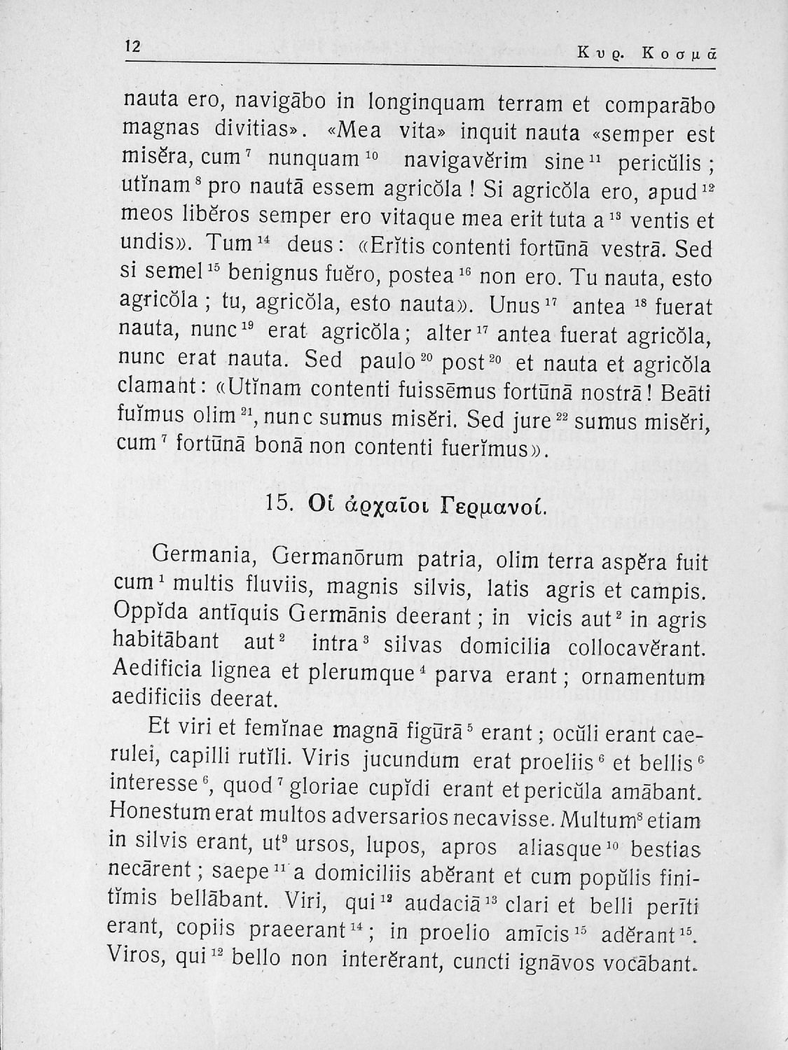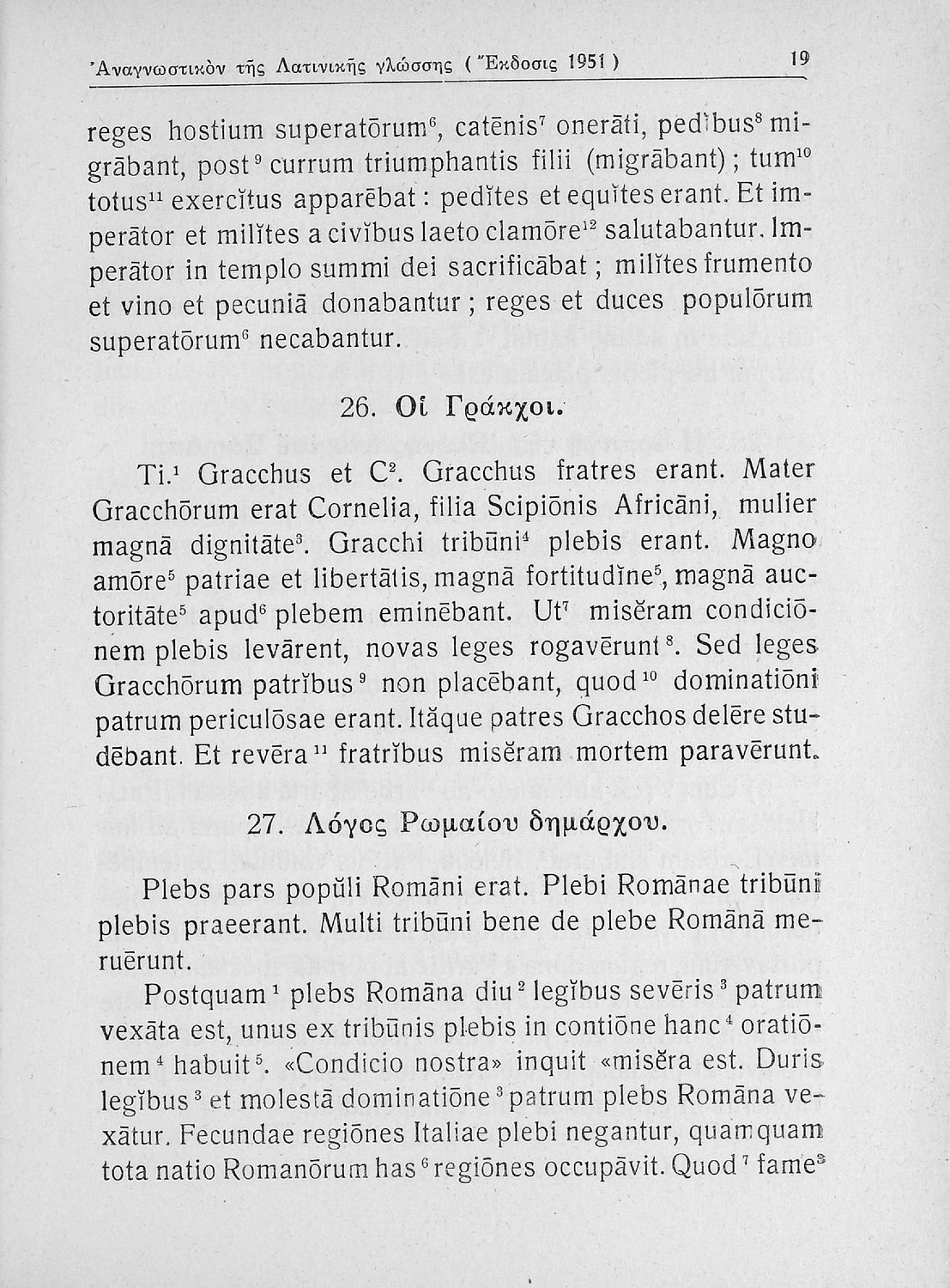 Σχολικό εγχειρίδιο Λατινικών για τη Γ΄ Γυμνασίου που περιέχει 54 κείμενα/περικοπές στα λατινικά, ερμηνευτικά υπομνήματα, λεξιλόγιο και κατάλογο με τα συντακτικά φαινόμενα (αφαιρετική, προθέσεις, σύνδεσμοι) που