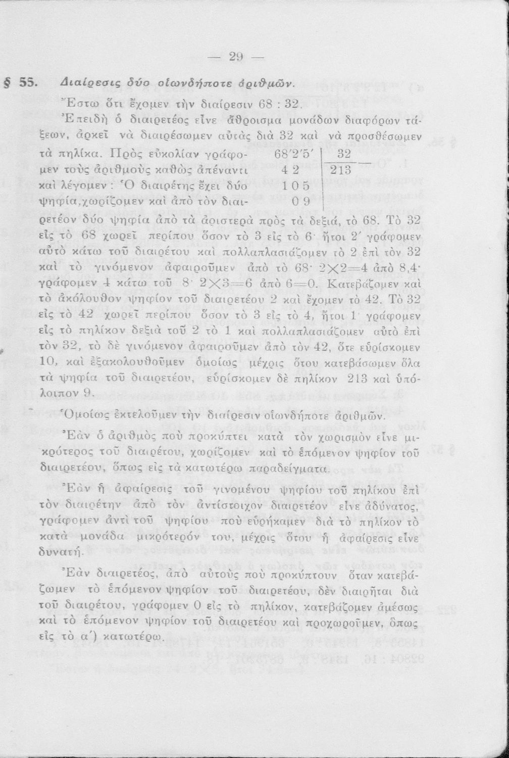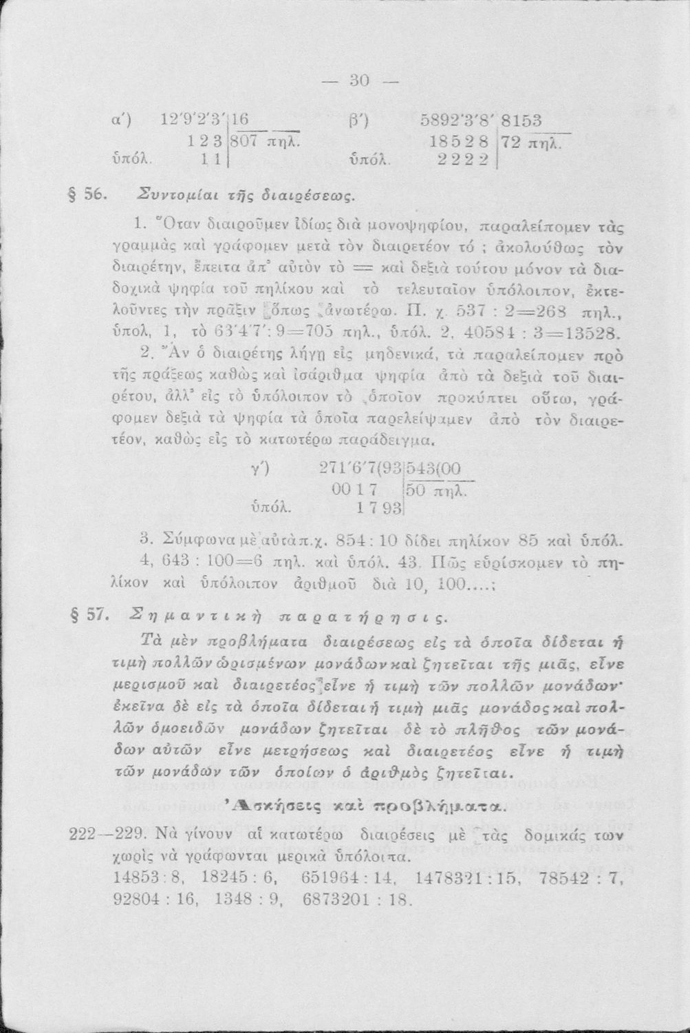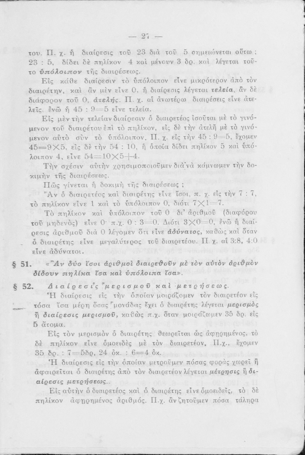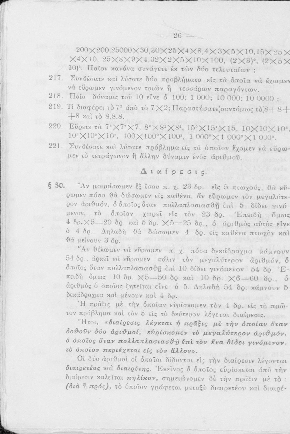 Σχολικό εγχειρίδιο Αριθμητικής για τα Ελληνικά Σχολεία χωρισμένο σε θεωρία και ασκήσεις που εστιάζει στις αριθμητικές πράξεις και τα κλάσματα. Περιέχει και παράρτημα λογιστικής.