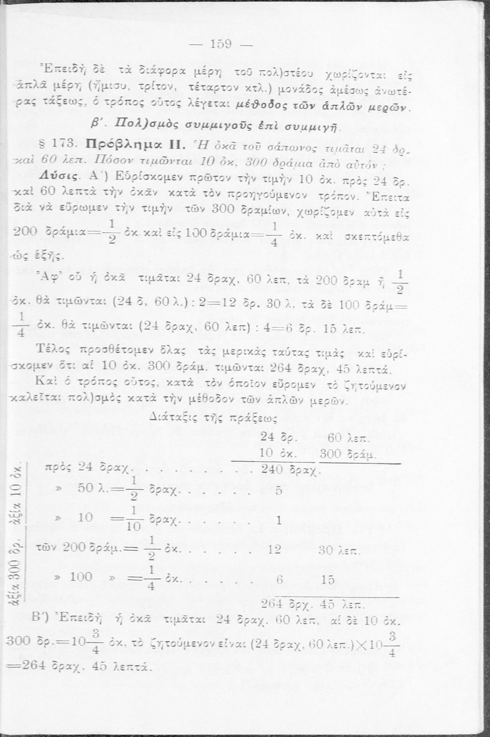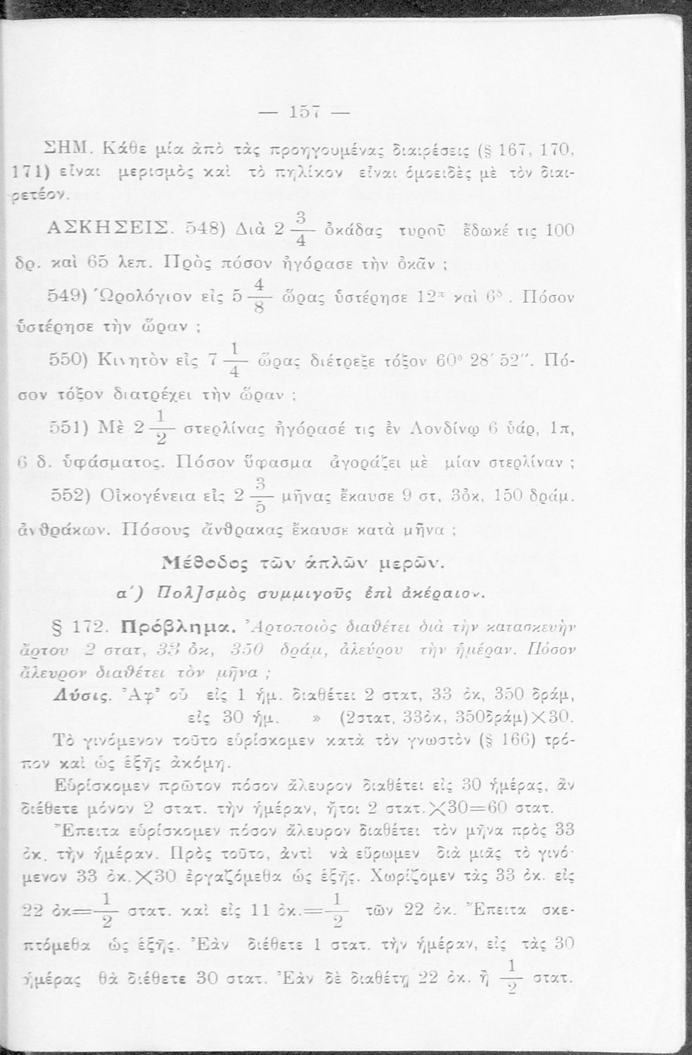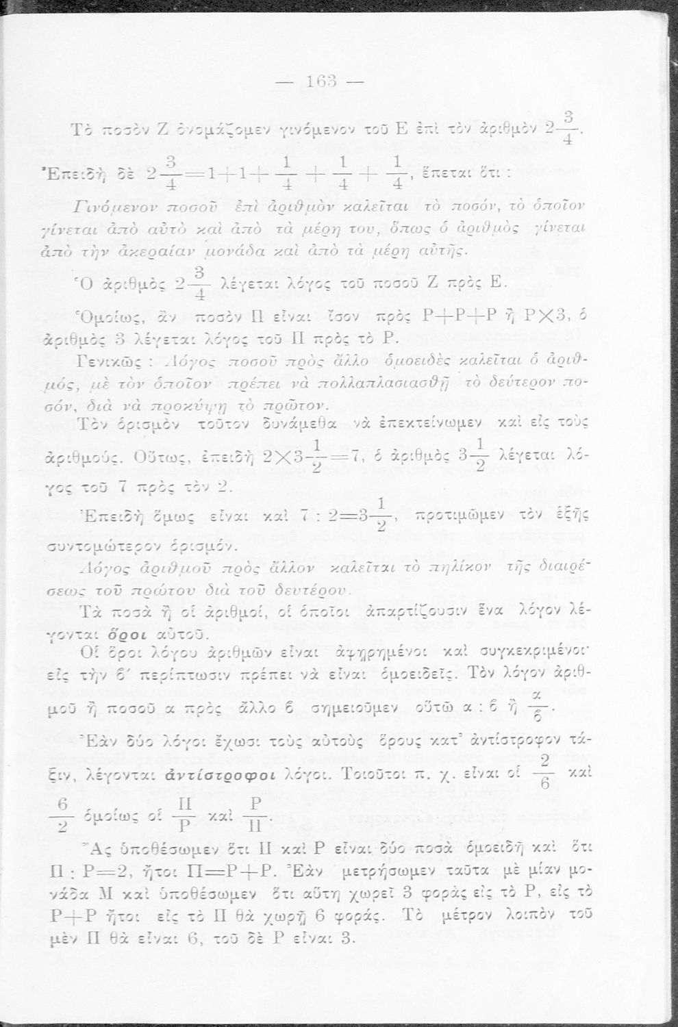 Σχολικό εγχειρίδιο Αριθμητικής για τις Α΄, Β΄, Γ΄ Γυμνασίου και τα Ανώτερα Παρθεναγωγεία που είναι χωρισμένο σε θεωρία και ασκήσεις και εστιάζει στις αριθμητικές πράξεις με κλάσματα και ακέραιους και συμμιγείς