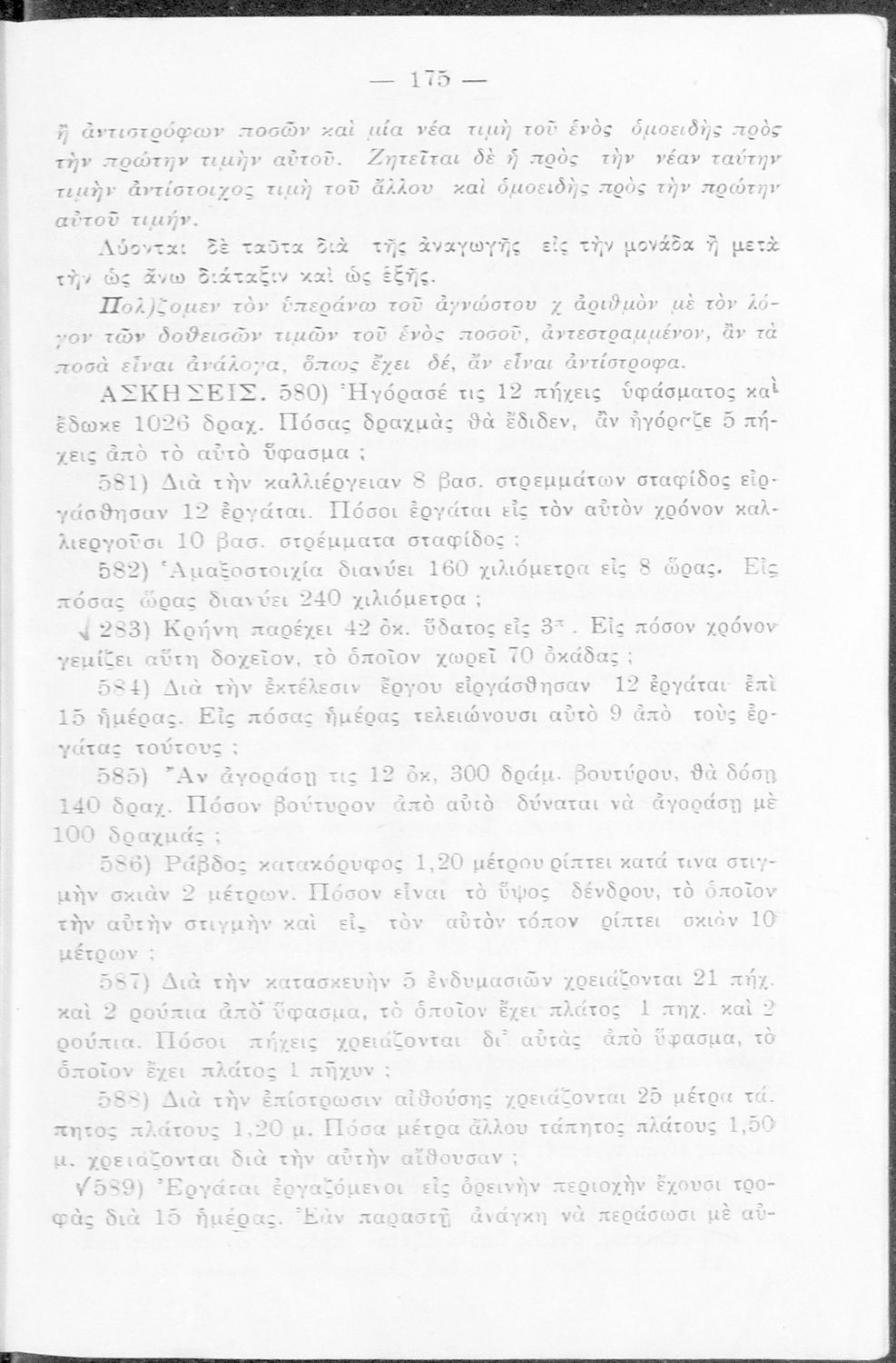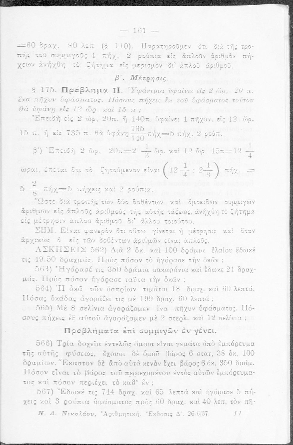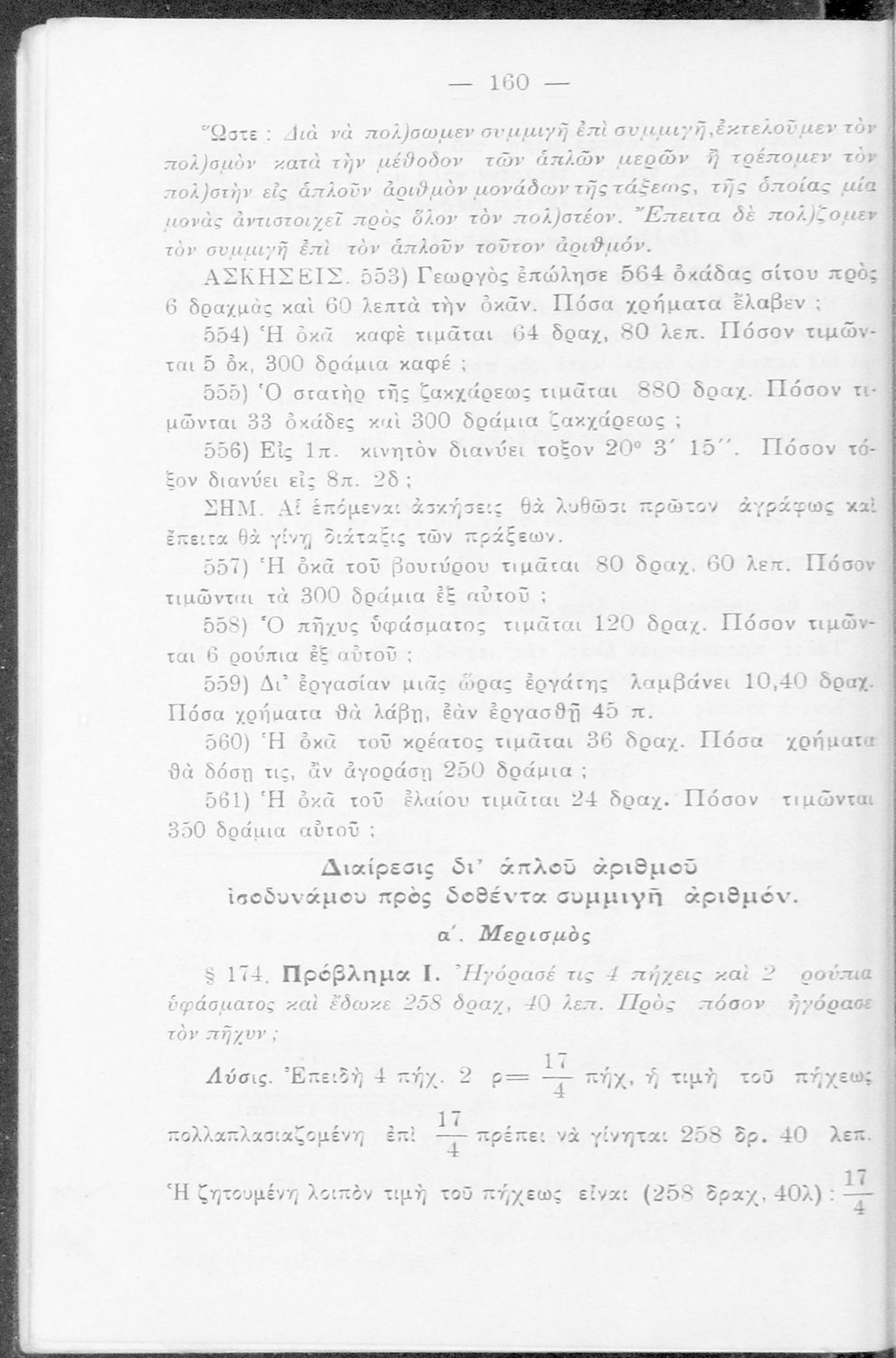 Σχολικό εγχειρίδιο Αριθμητικής για τις Α΄, Β΄, Γ΄ Γυμνασίου και τα Ανώτερα Παρθεναγωγεία που είναι χωρισμένο σε θεωρία και ασκήσεις και εστιάζει στις αριθμητικές πράξεις με κλάσματα και ακέραιους και συμμιγείς