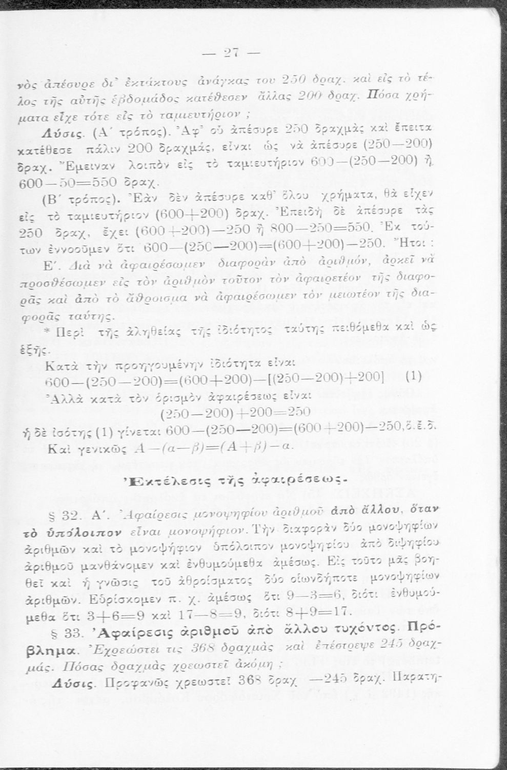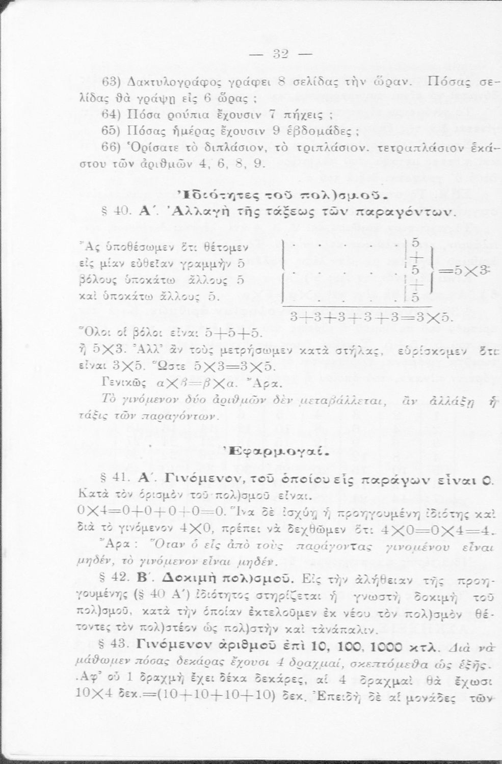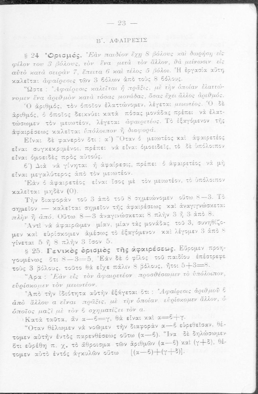 Βαθμίδα εκπαίδευσης: Δευτεροβάθμια Τάξη: Α' Γυμνασίου / Β' Γυμνασίου / Γ' Γυμνασίου Μάθημα: Μαθηματικά Γλώσσα: Απλή καθαρεύουσα Παρουσίαση περιεχομένου: Σχολικό εγχειρίδιο Αριθμητικής για τις Α΄, Β΄, Γ΄ Γυμνασίου που είναι χωρισμένο σε ορισμούς και ασκήσεις και εστιάζει στις ιδιότητες των αριθμητικών πράξεων, τα κλάσματα και την τετραγωνική ρίζα. |