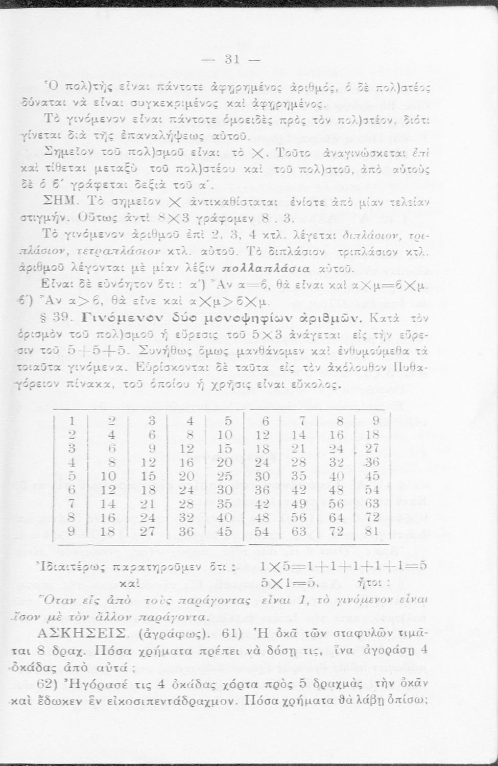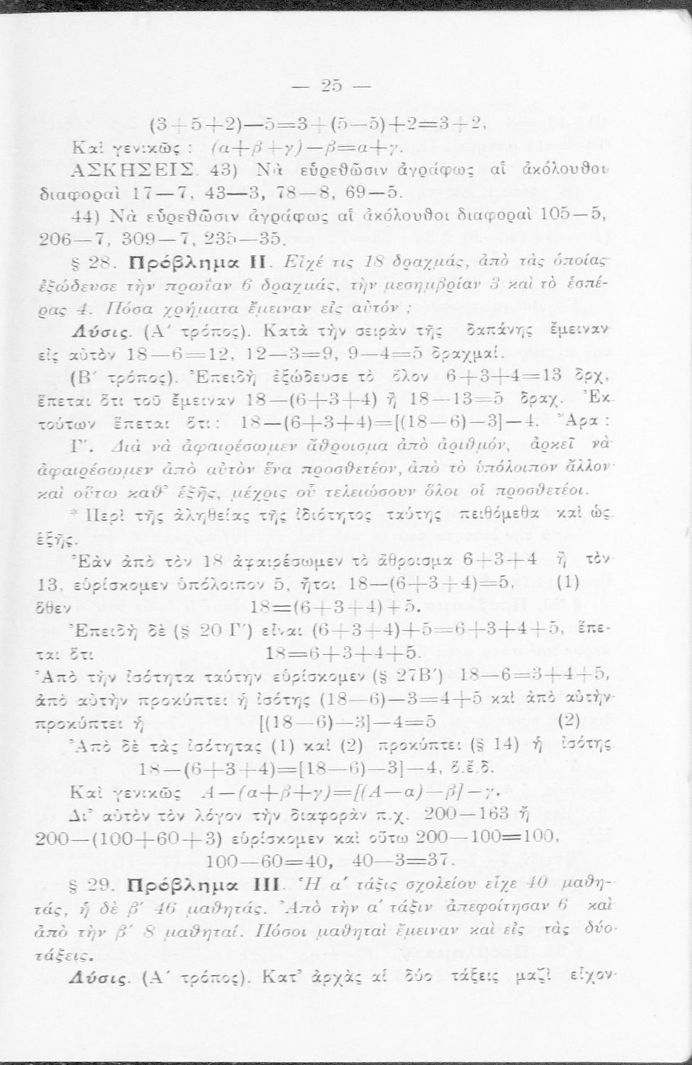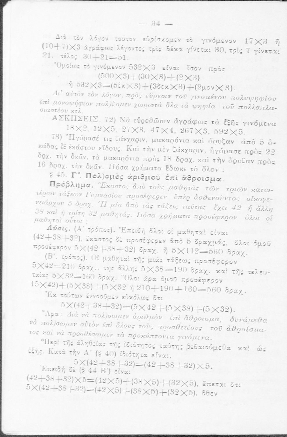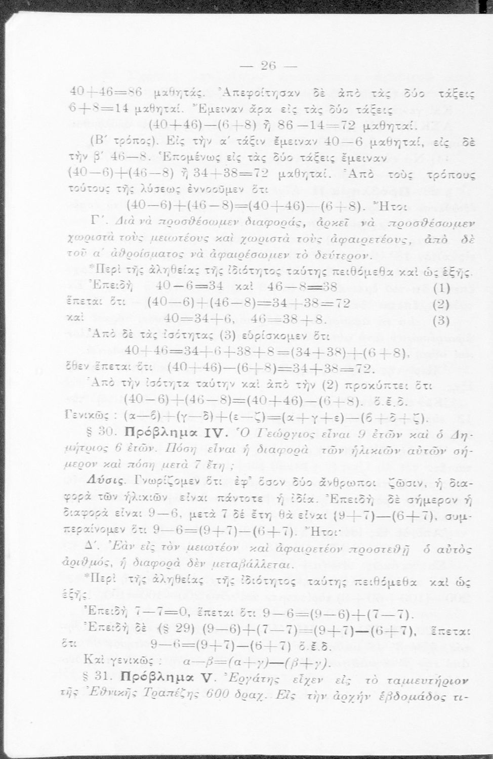 Βαθμίδα εκπαίδευσης: Δευτεροβάθμια Τάξη: Α' Γυμνασίου / Β' Γυμνασίου / Γ' Γυμνασίου Μάθημα: Μαθηματικά Γλώσσα: Απλή καθαρεύουσα Παρουσίαση περιεχομένου: Σχολικό εγχειρίδιο Αριθμητικής για τις Α΄, Β΄, Γ΄ Γυμνασίου που είναι χωρισμένο σε ορισμούς και ασκήσεις και εστιάζει στις ιδιότητες των αριθμητικών πράξεων, τα κλάσματα και την τετραγωνική ρίζα. |