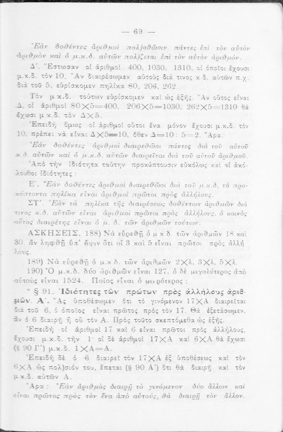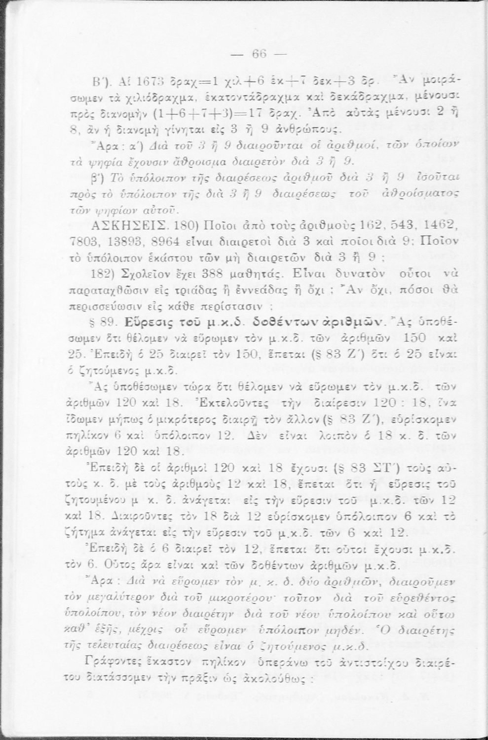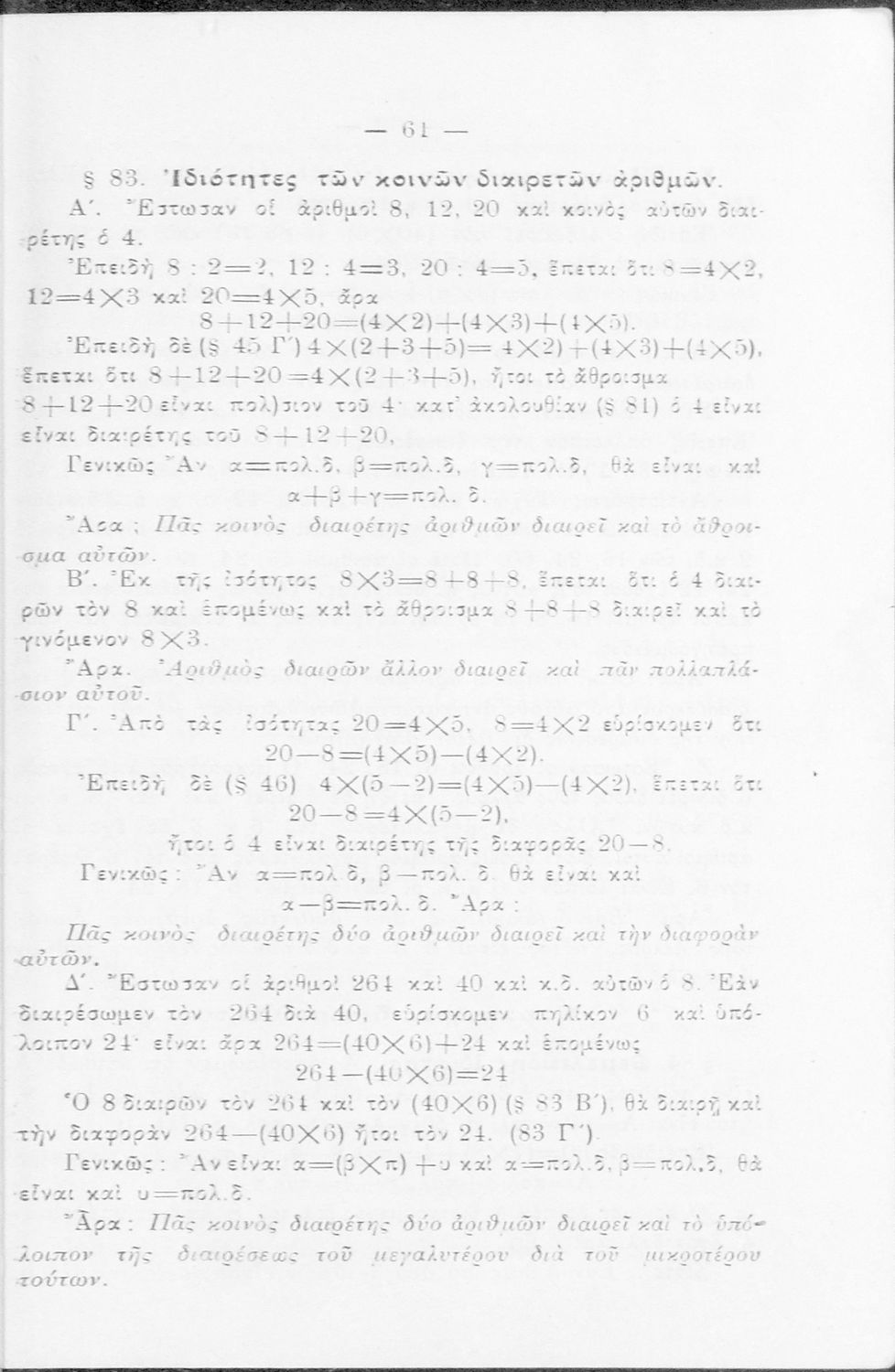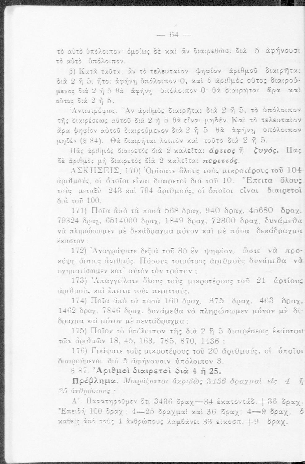 Σχολικό εγχειρίδιο Αριθμητικής για τις Α΄, Β΄, Γ΄ Γυμνασίου και τα Ανώτερα Παρθεναγωγεία που είναι χωρισμένο σε θεωρία και ασκήσεις και εστιάζει στις αριθμητικές πράξεις με κλάσματα και ακέραιους και συμμιγείς