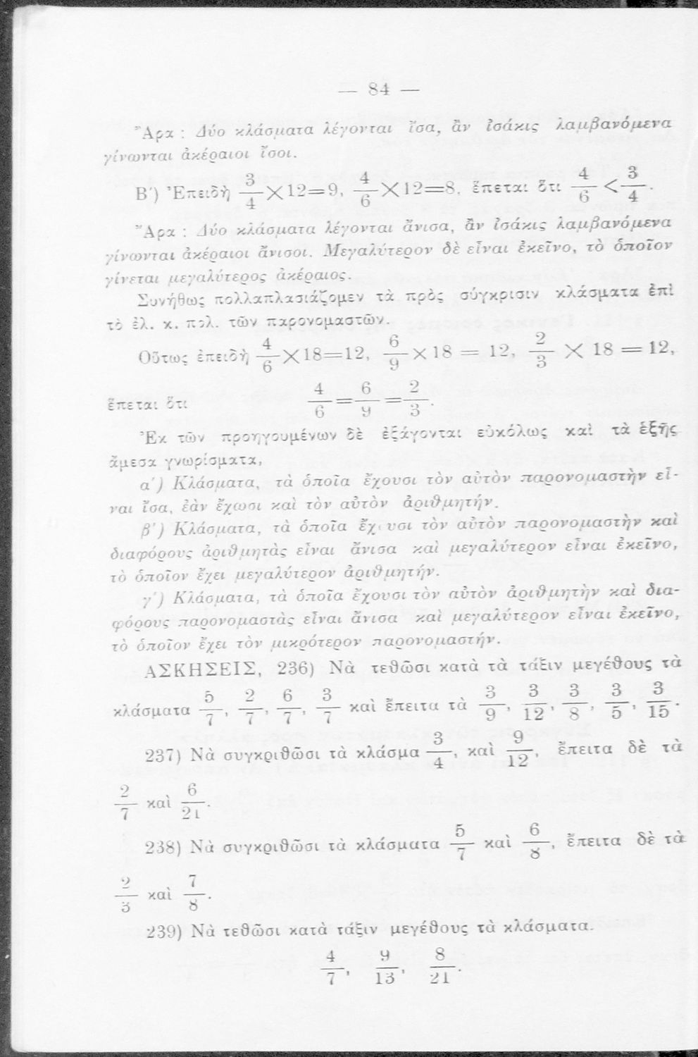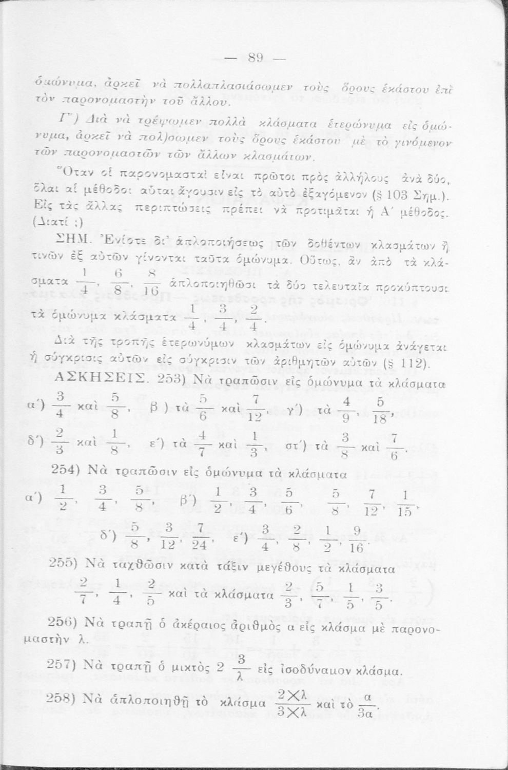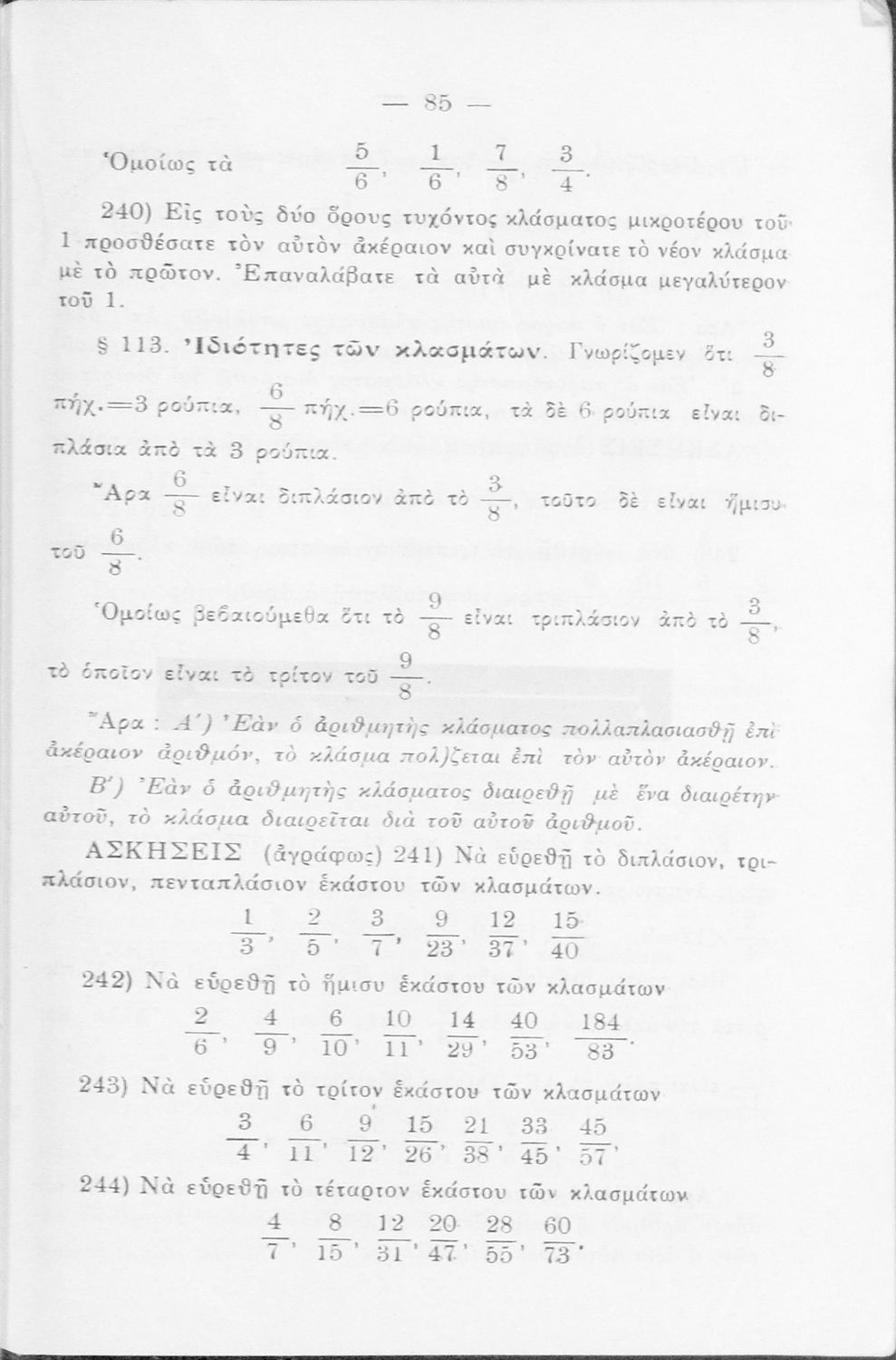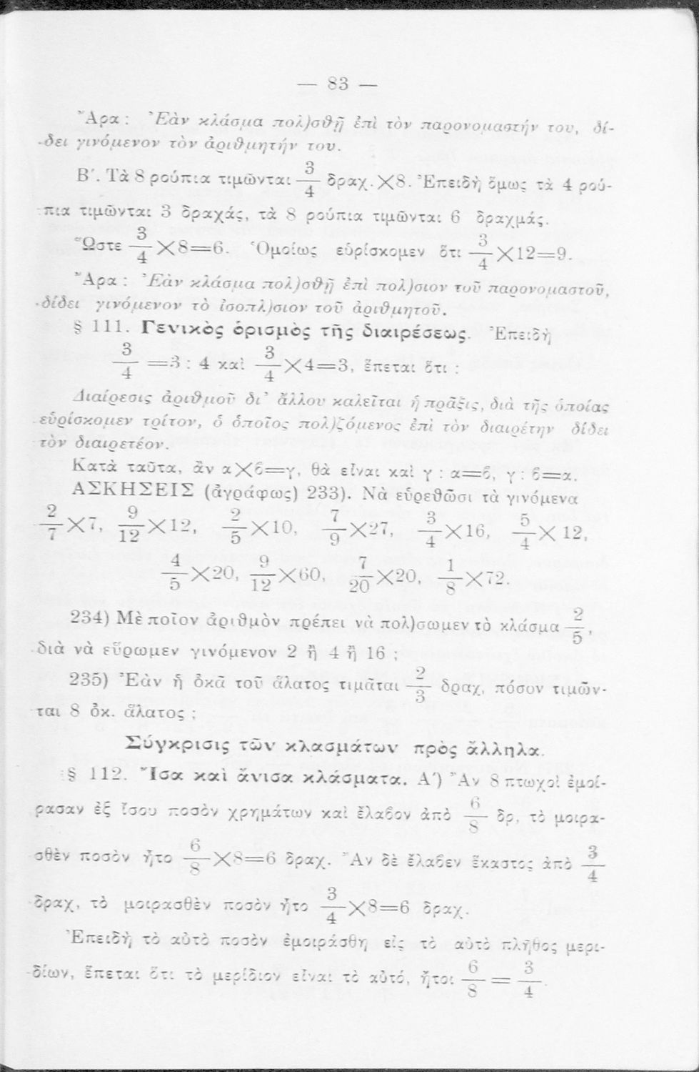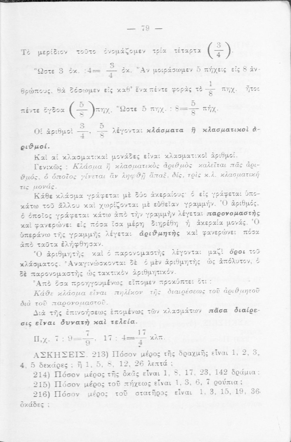 Σχολικό εγχειρίδιο Αριθμητικής για τις Α΄, Β΄, Γ΄ Γυμνασίου και τα Ανώτερα Παρθεναγωγεία που είναι χωρισμένο σε θεωρία και ασκήσεις και εστιάζει στις αριθμητικές πράξεις με κλάσματα και ακέραιους και συμμιγείς