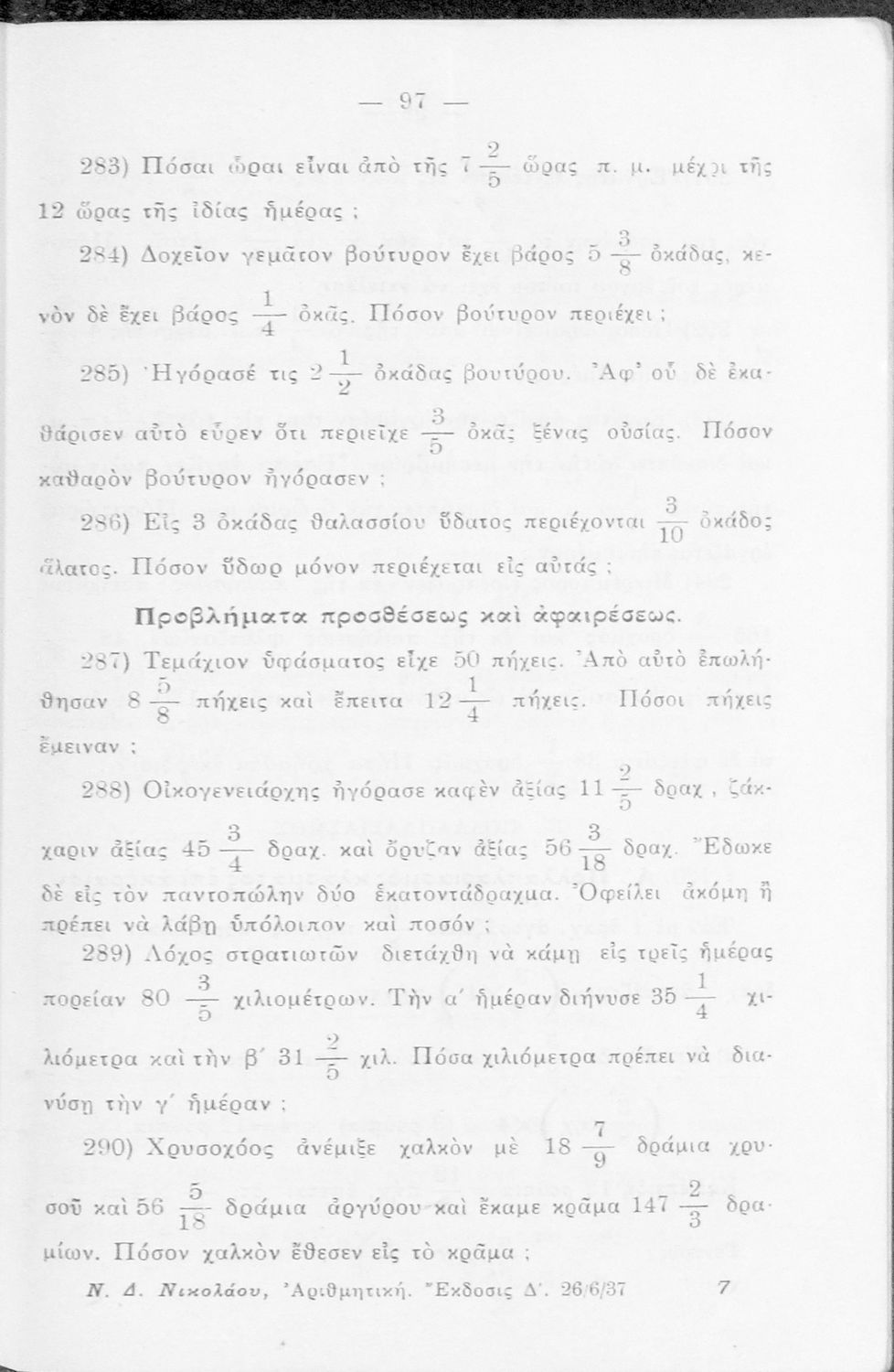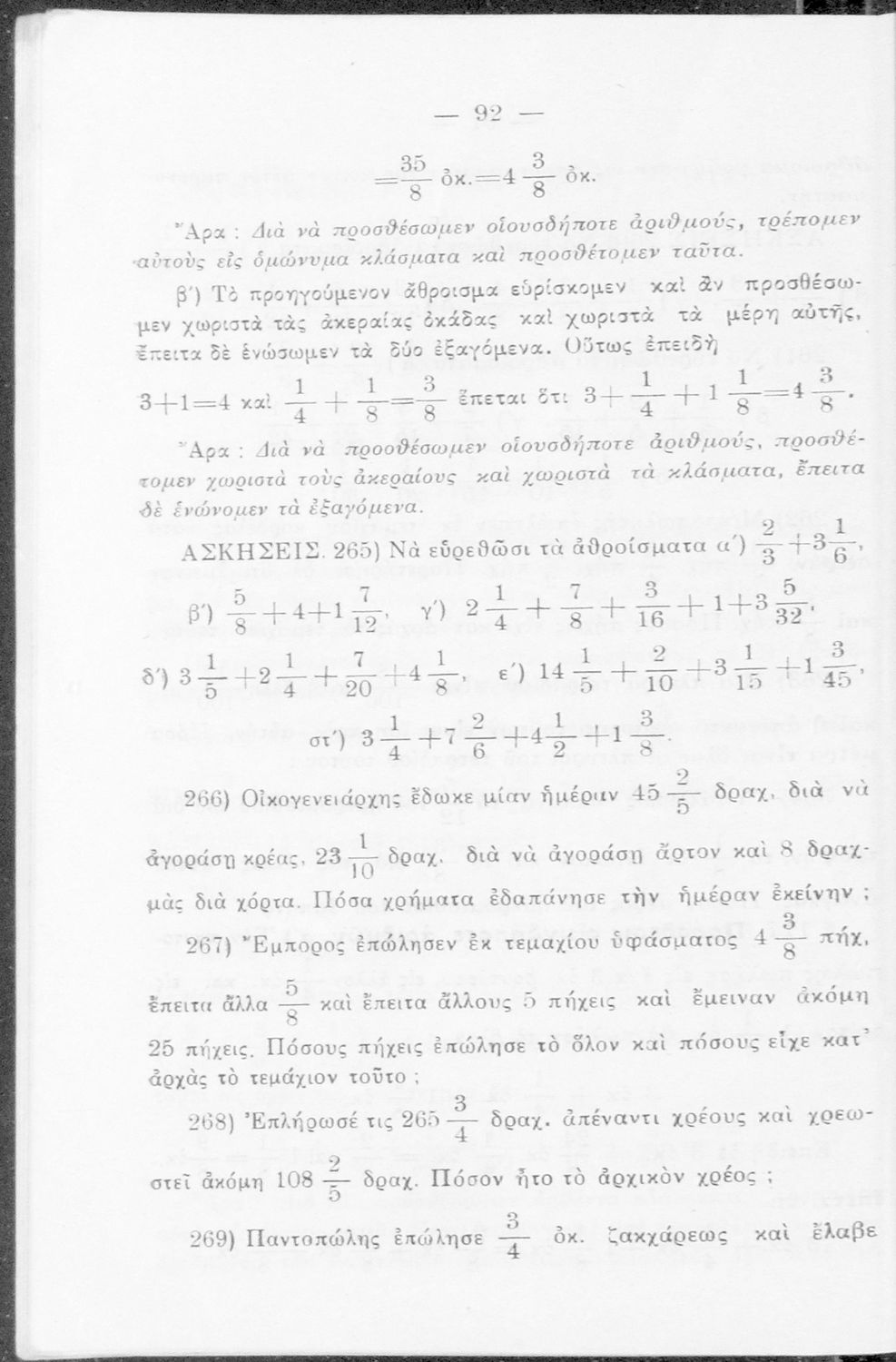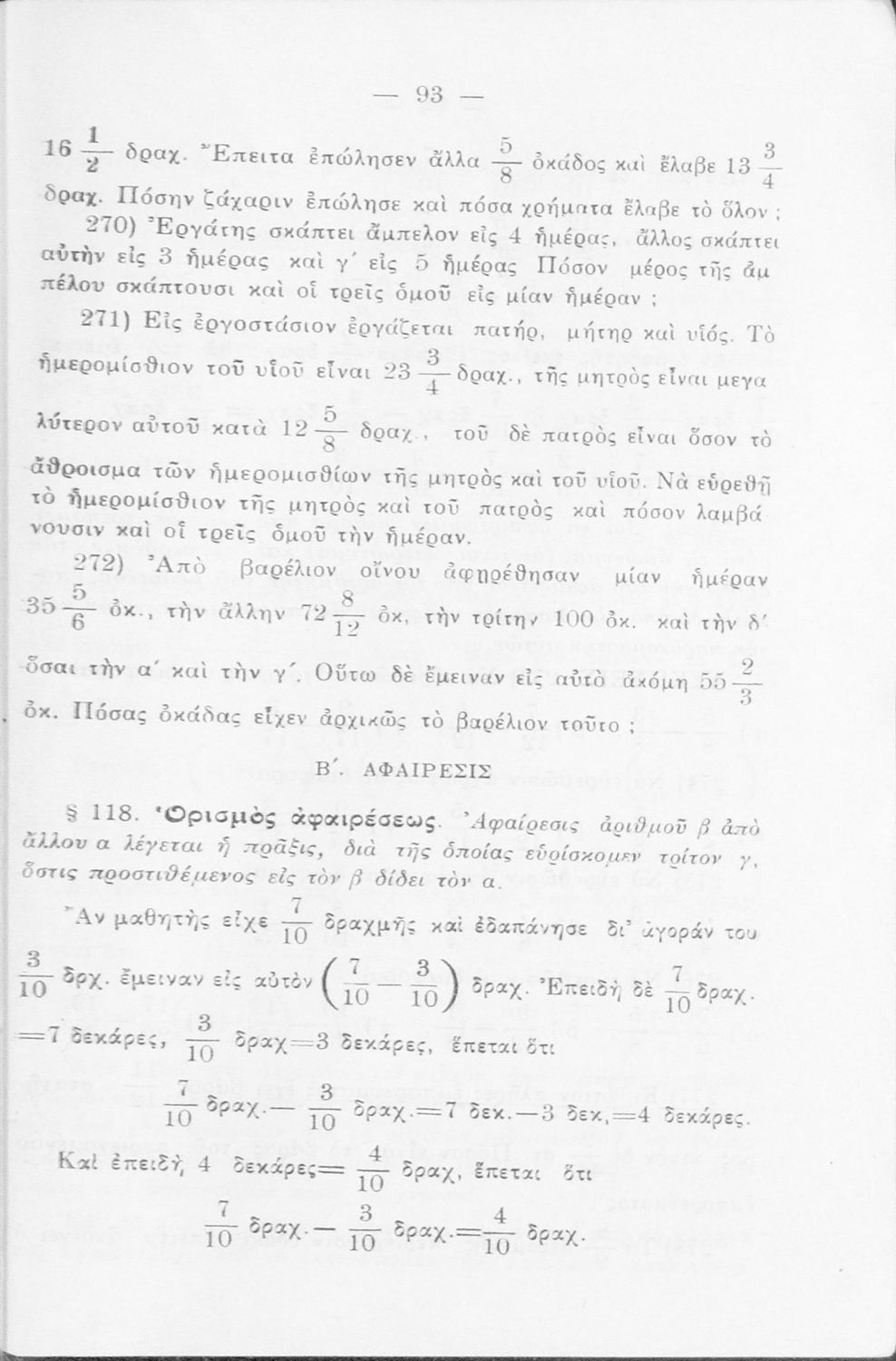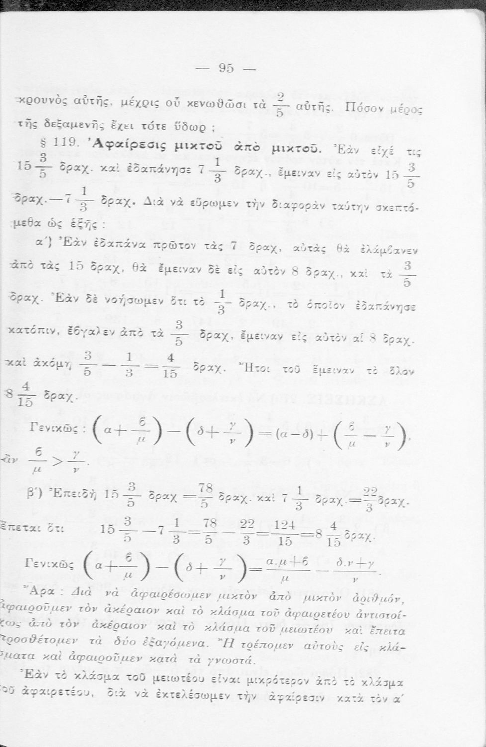 Σχολικό εγχειρίδιο Αριθμητικής για τις Α΄, Β΄, Γ΄ Γυμνασίου και τα Ανώτερα Παρθεναγωγεία που είναι χωρισμένο σε θεωρία και ασκήσεις και εστιάζει στις αριθμητικές πράξεις με κλάσματα και ακέραιους και συμμιγείς