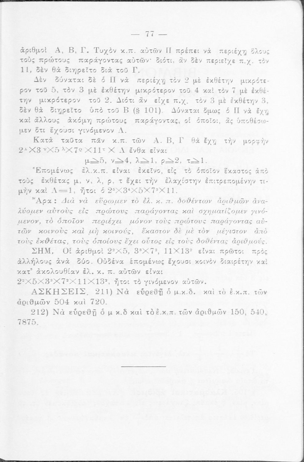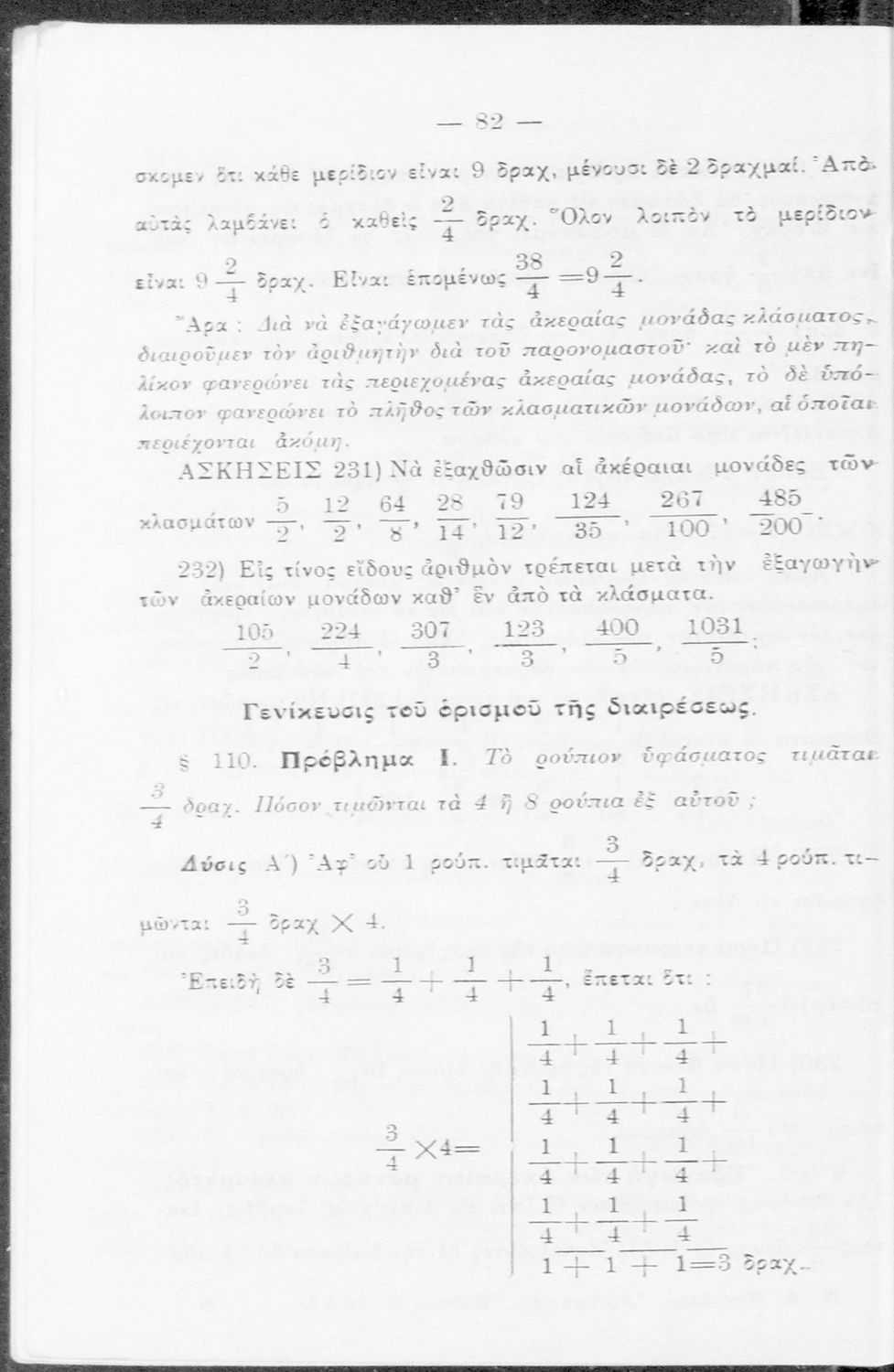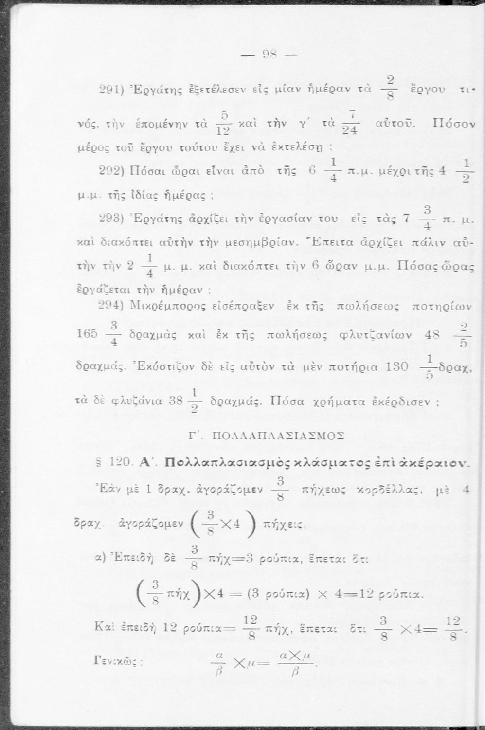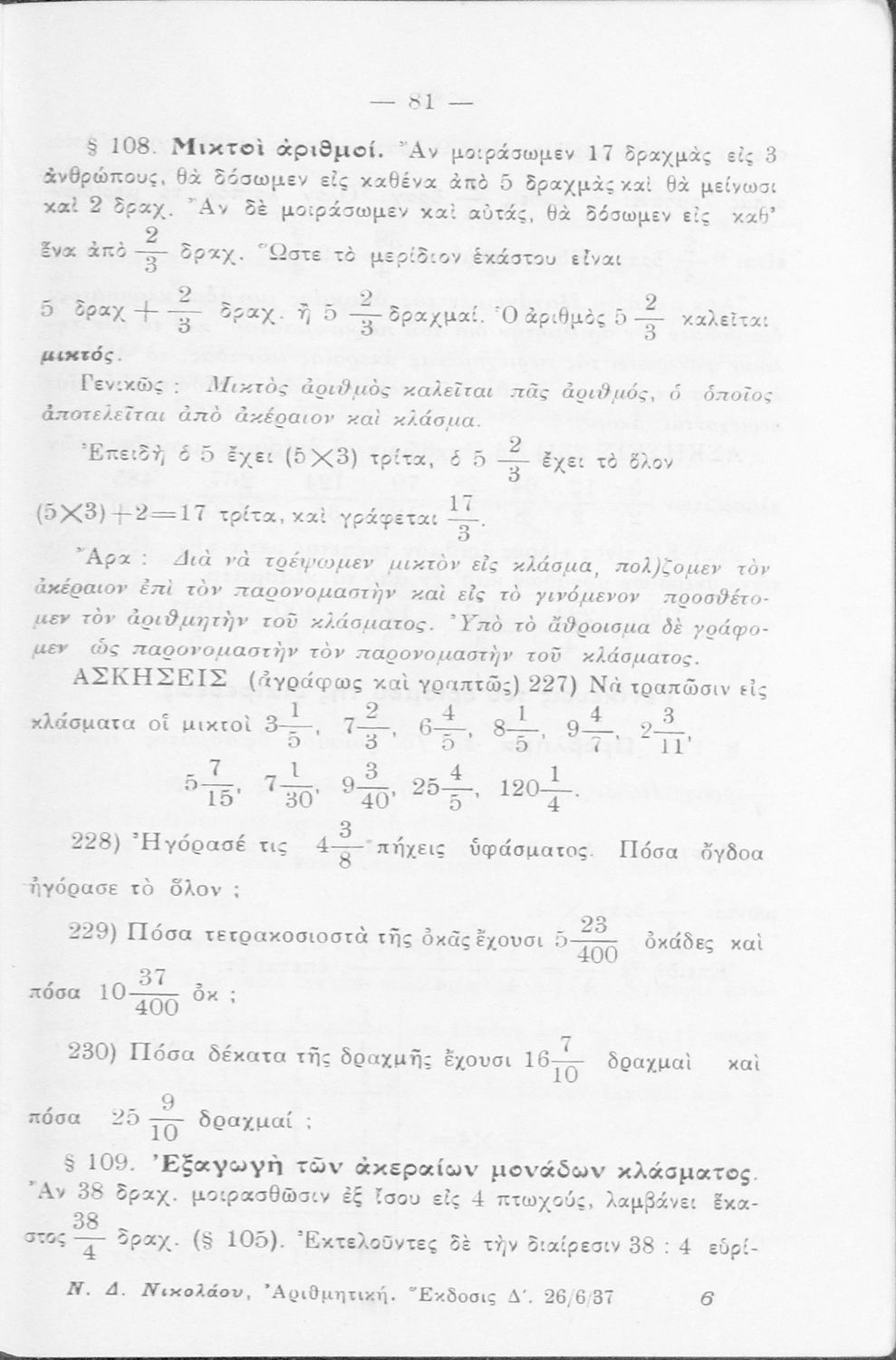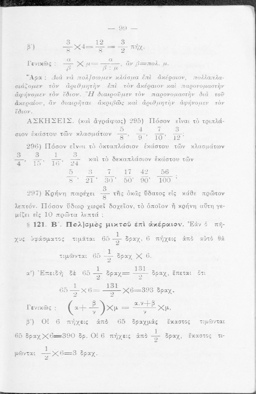 Σχολικό εγχειρίδιο Αριθμητικής για τις Α΄, Β΄, Γ΄ Γυμνασίου και τα Ανώτερα Παρθεναγωγεία που είναι χωρισμένο σε θεωρία και ασκήσεις και εστιάζει στις αριθμητικές πράξεις με κλάσματα και ακέραιους και συμμιγείς