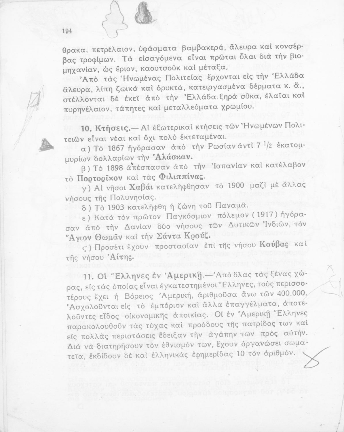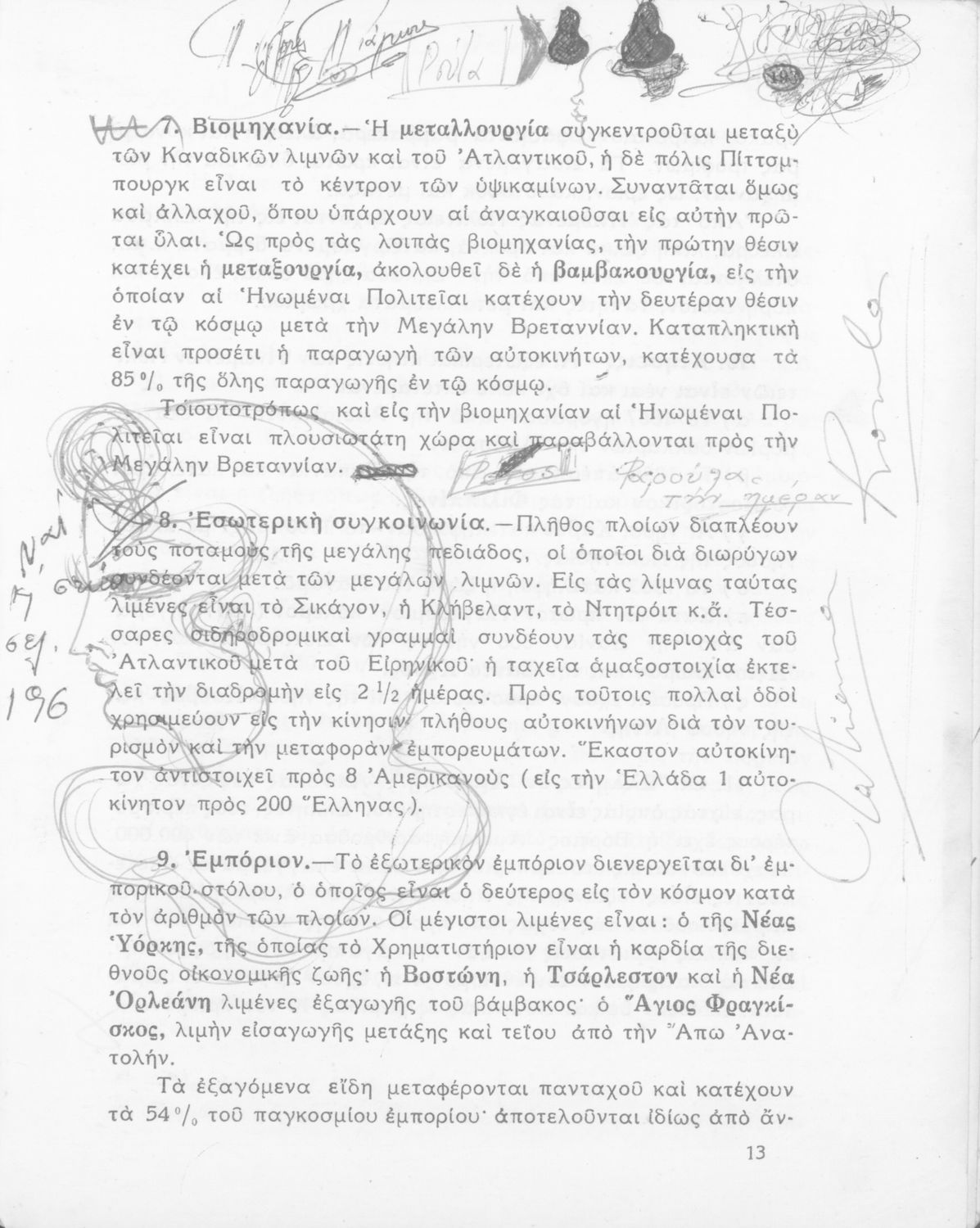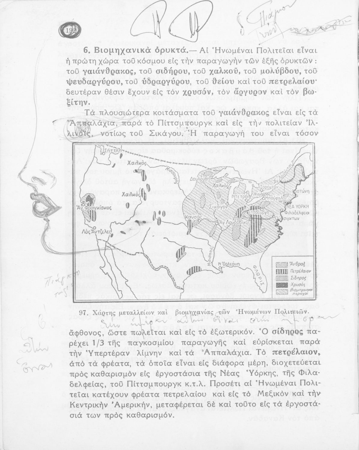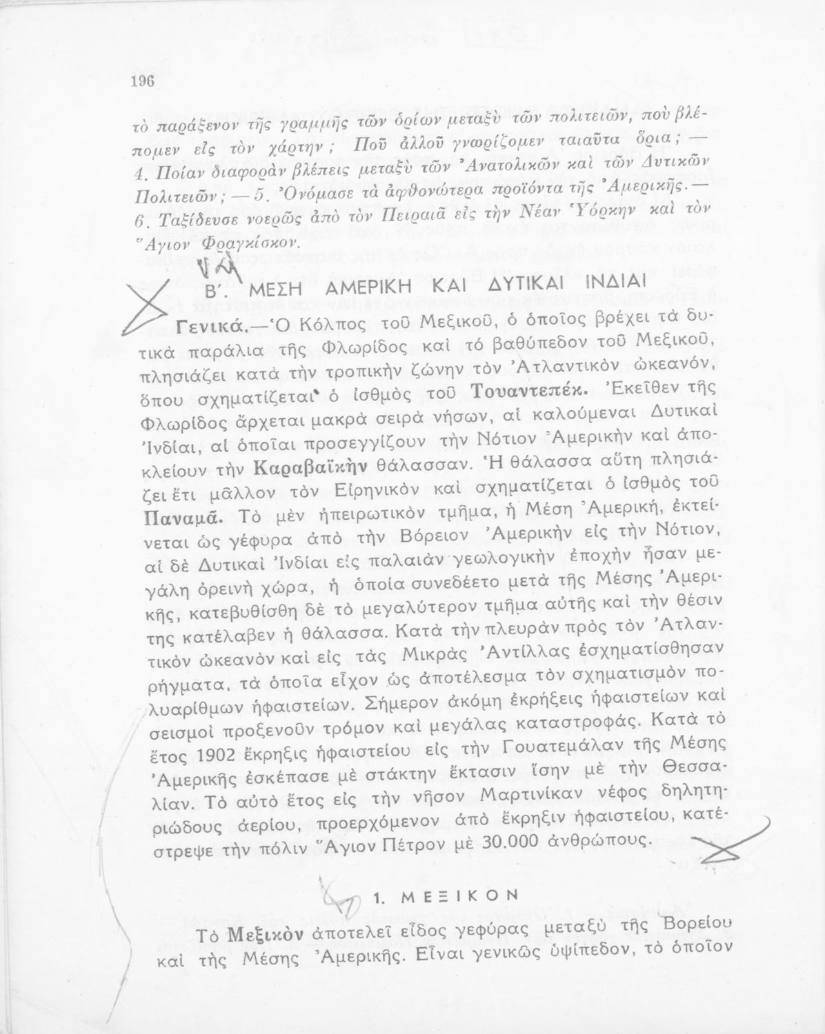 Σχολικό εγχειρίδιο Γεωγραφίας που εξετάζει ενδεικτικές χώρες και περιοχές από τις πέντε ηπείρους εκτός της Ευρώπης από γεωφυσική και οικονομική πλευρά. Φέρει το σύμβολο της δικτατορίας.