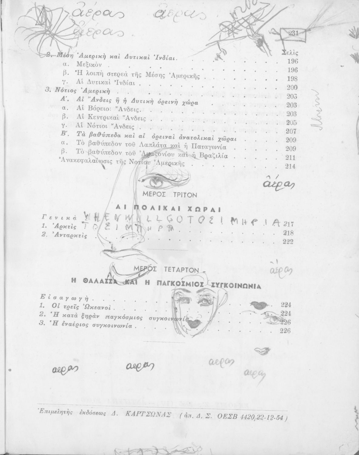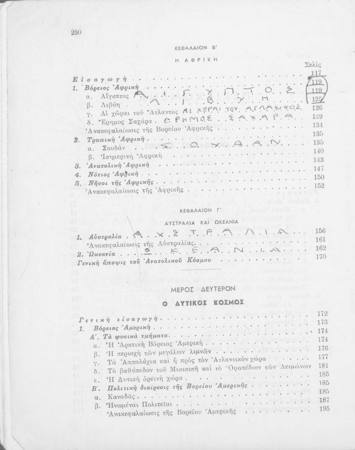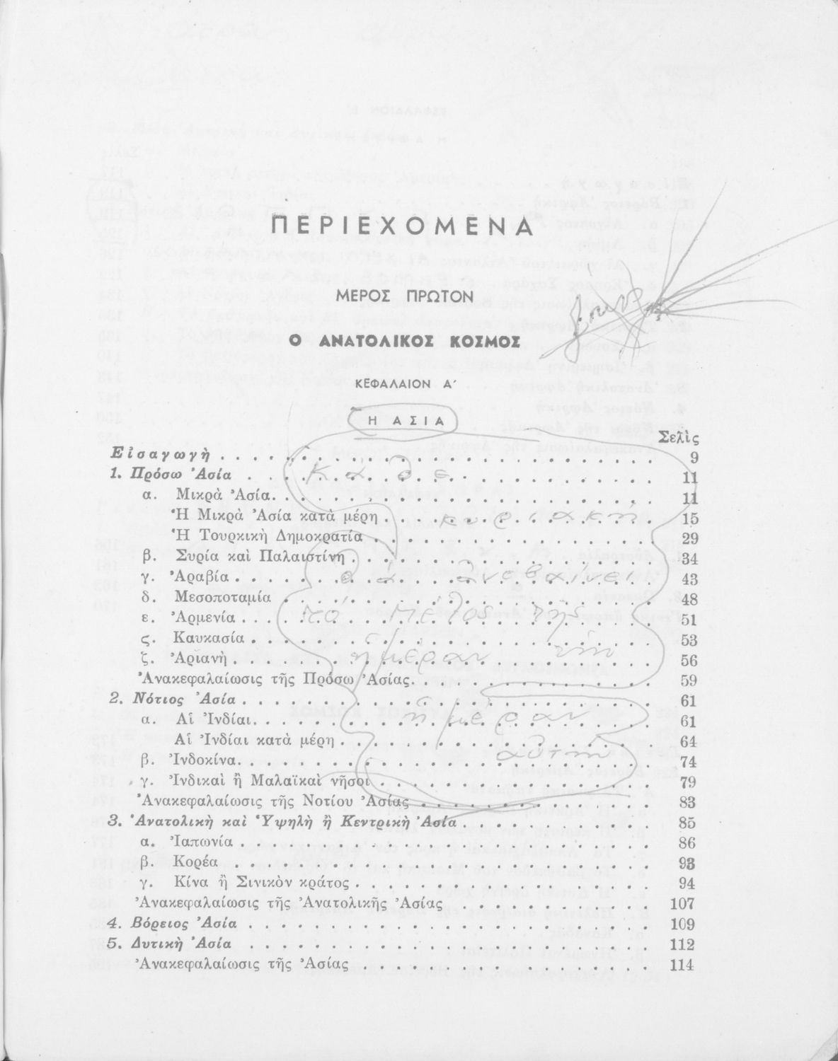 Σχολικό εγχειρίδιο Γεωγραφίας που εξετάζει ενδεικτικές χώρες και περιοχές από τις πέντε ηπείρους εκτός της Ευρώπης από γεωφυσική και οικονομική πλευρά. Φέρει το σύμβολο της δικτατορίας.