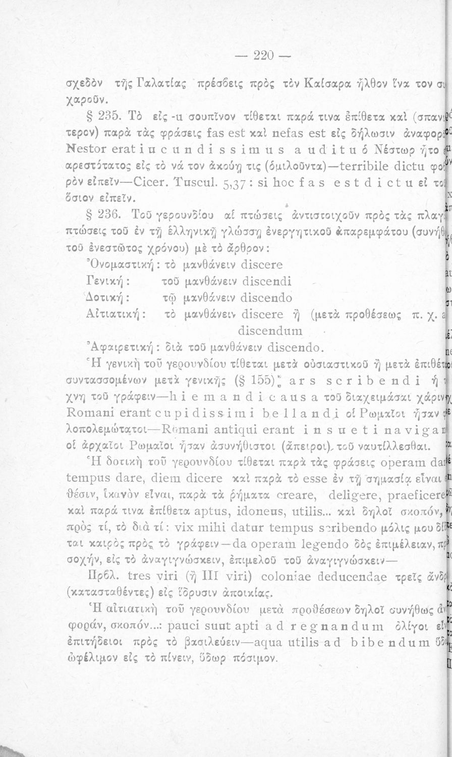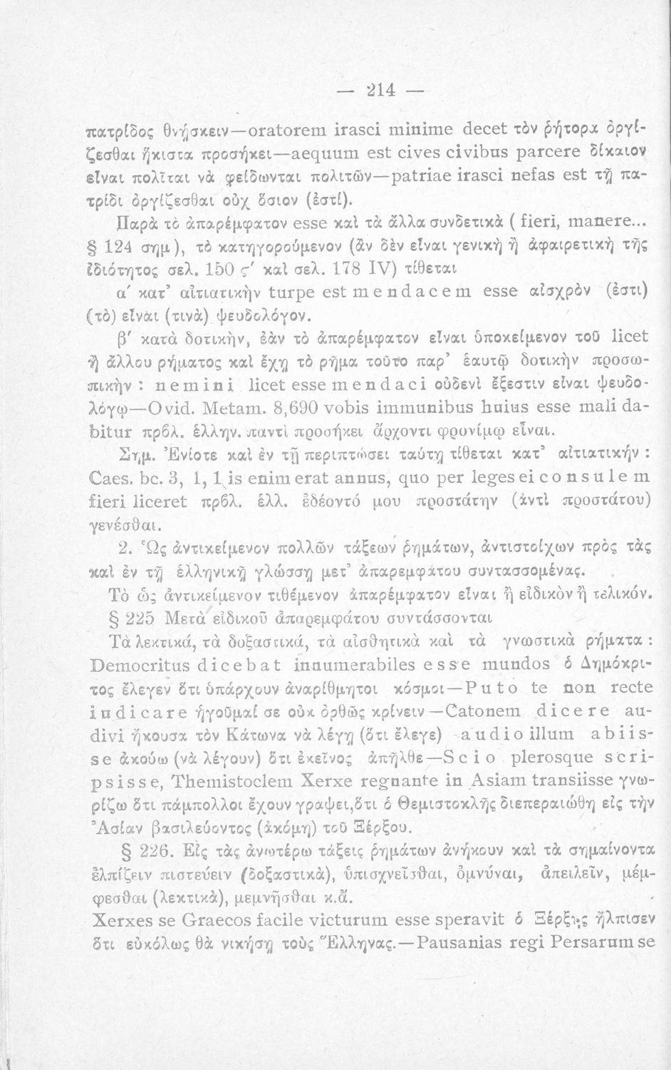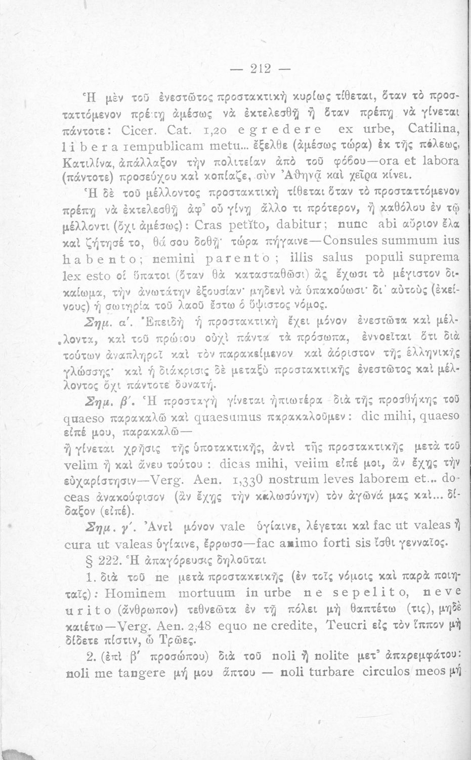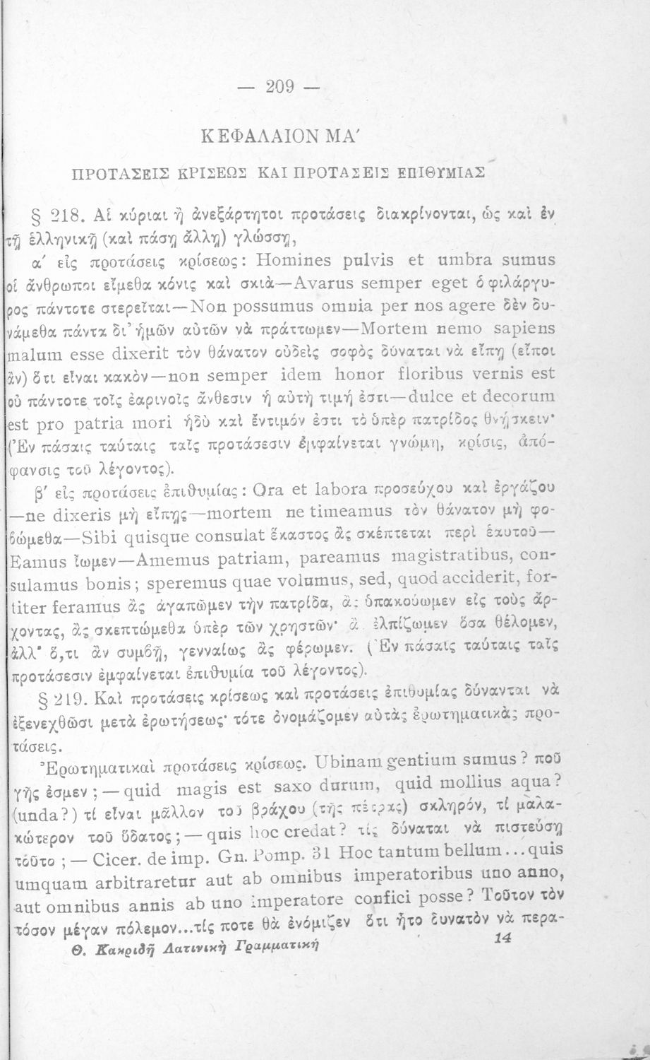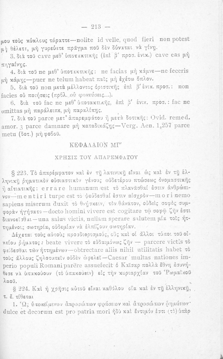 Σχολικό εγχειρίδιο Λατινικών Α΄, Β΄, Γ' Γυμνασίου που περιλαμβάνει γραμματική και συντακτικό και είναι χωρισμένο σε φθογγολογικό, τυπολογικό και ετυμολογικό μέρος.