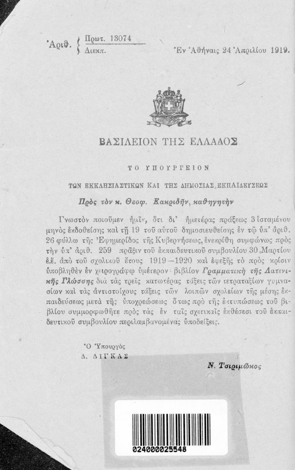 Υπουργική απόφαση / Σύμβαση: 13074/24-4-1919