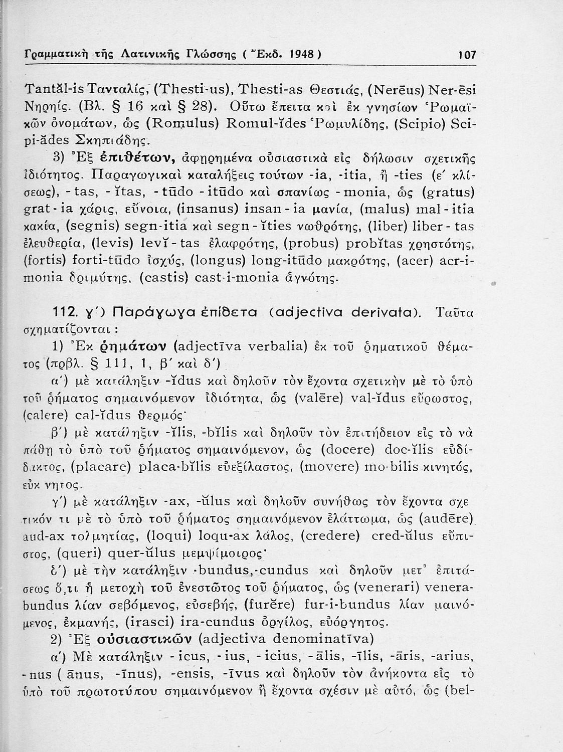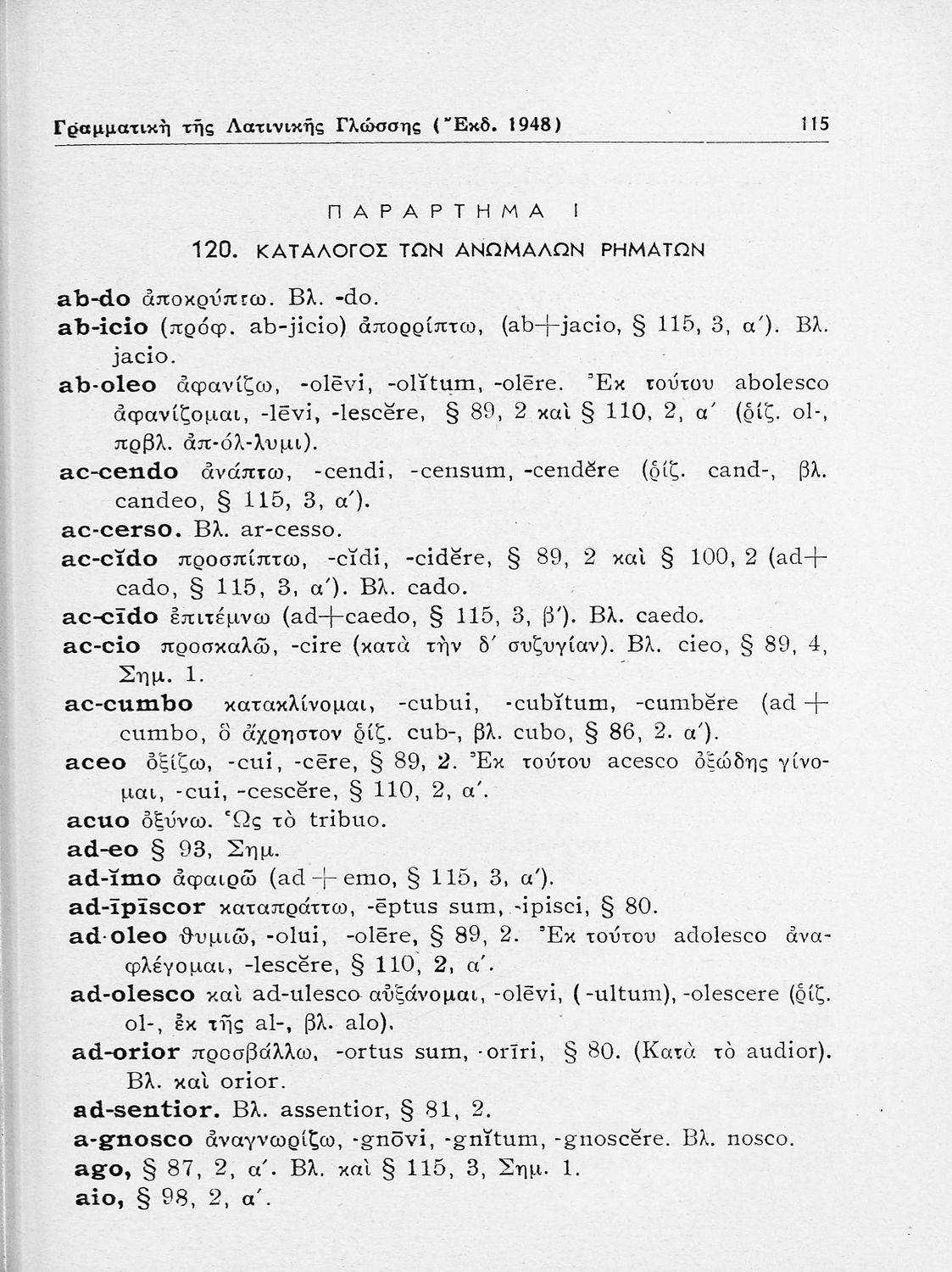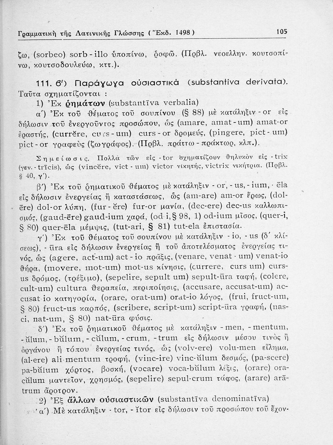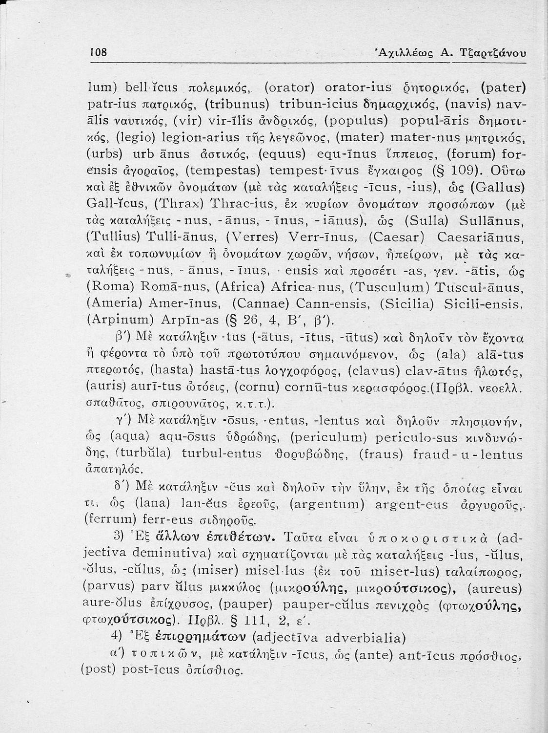Σχολικό εγχειρίδιο Λατινικών Γυμνασίου που περιλαμβάνει γραμματική και συντακτικό και είναι χωρισμένο σε φθογγολογικό, τυπολογικό και ετυμολογικό μέρος.