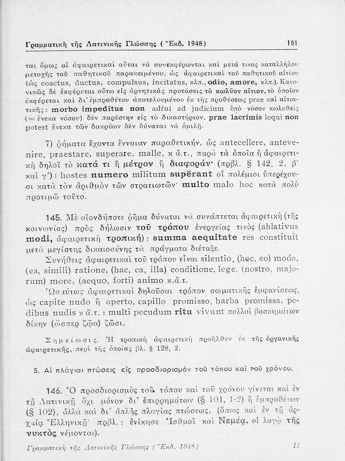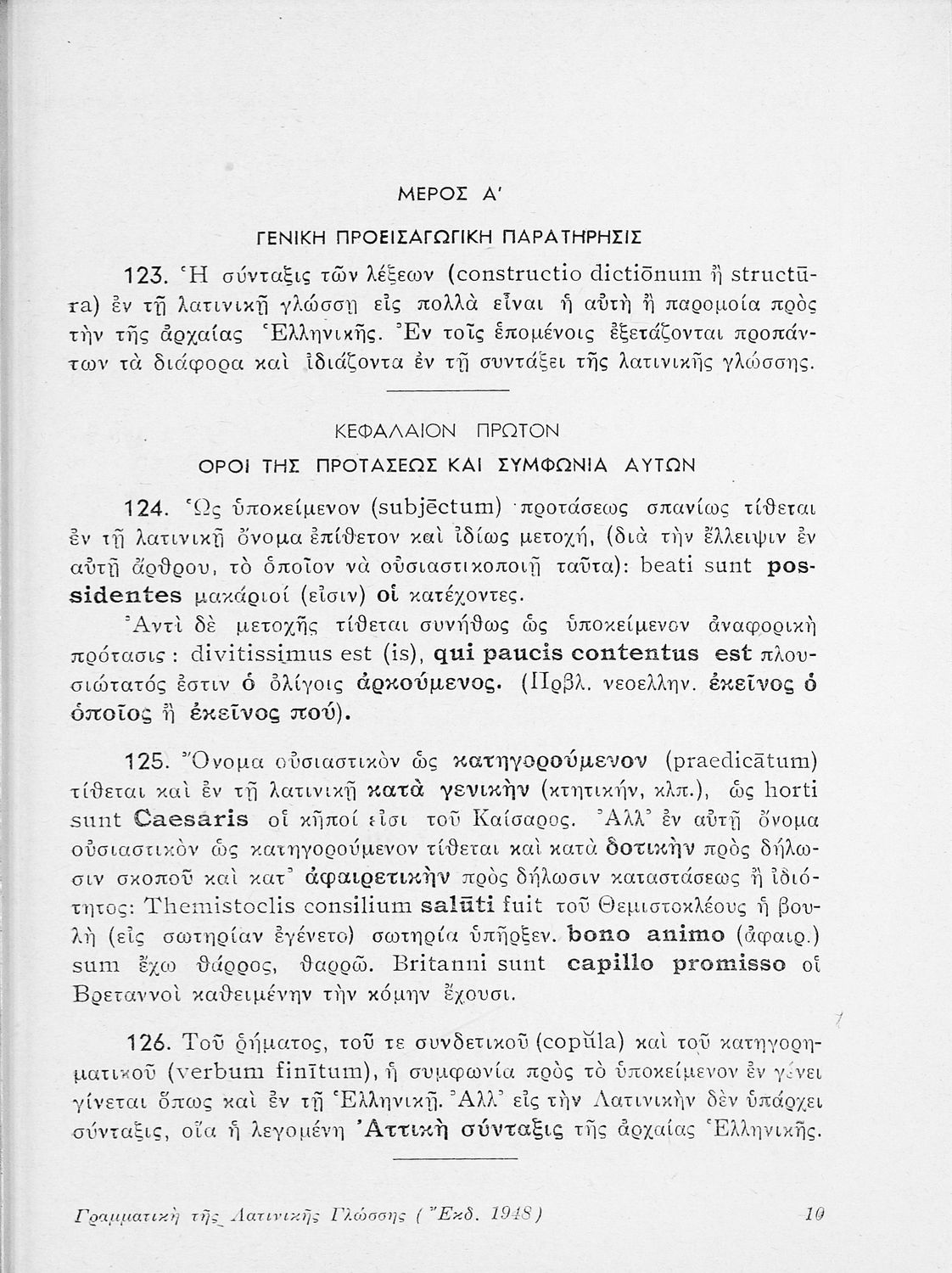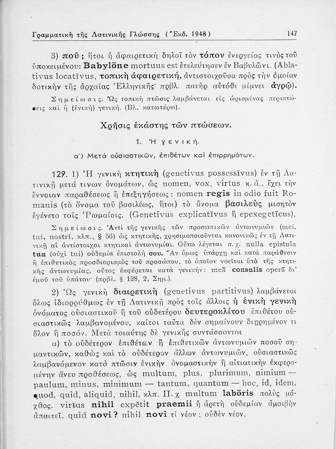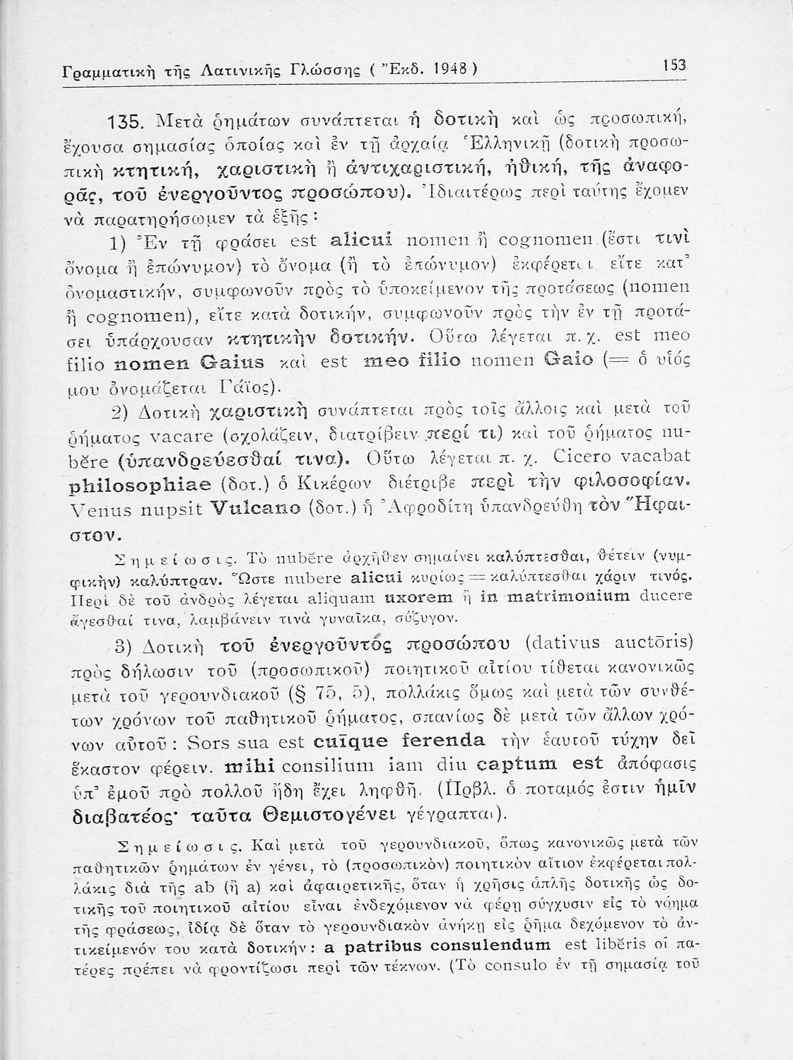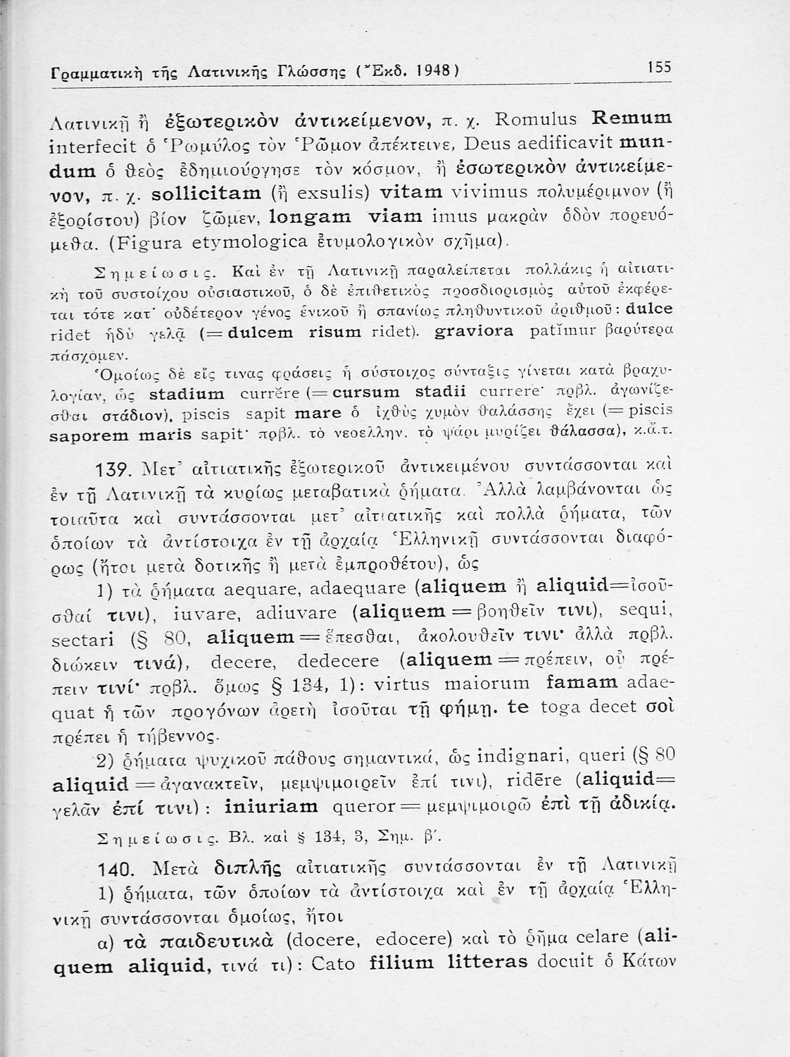 Σχολικό εγχειρίδιο Λατινικών Γυμνασίου που περιλαμβάνει γραμματική και συντακτικό και είναι χωρισμένο σε φθογγολογικό, τυπολογικό και ετυμολογικό μέρος.