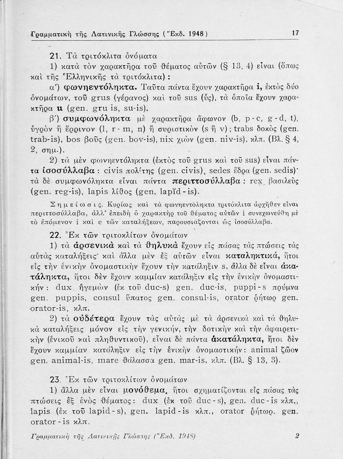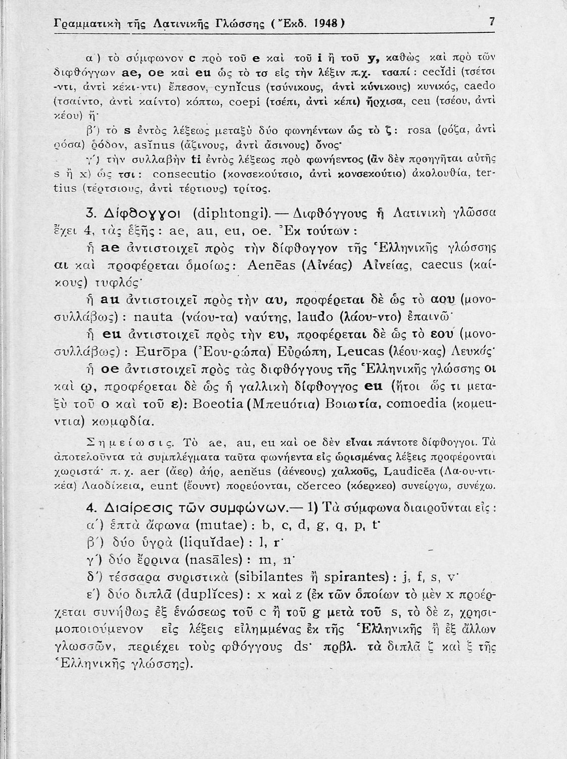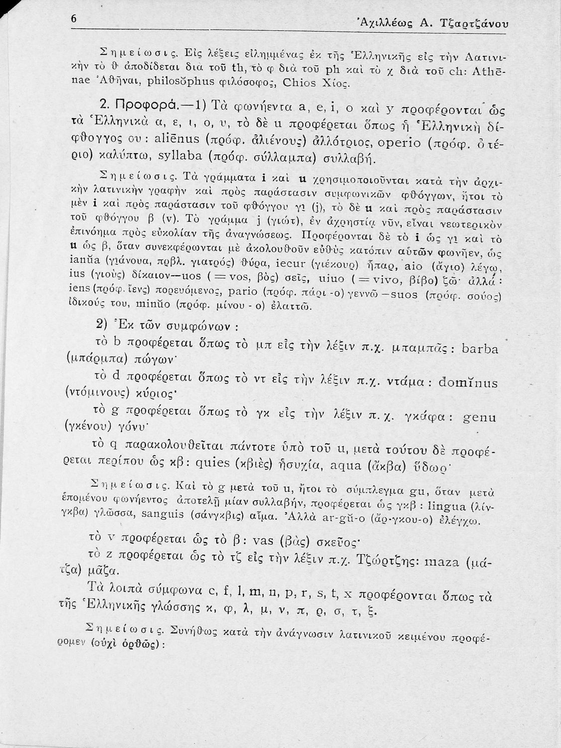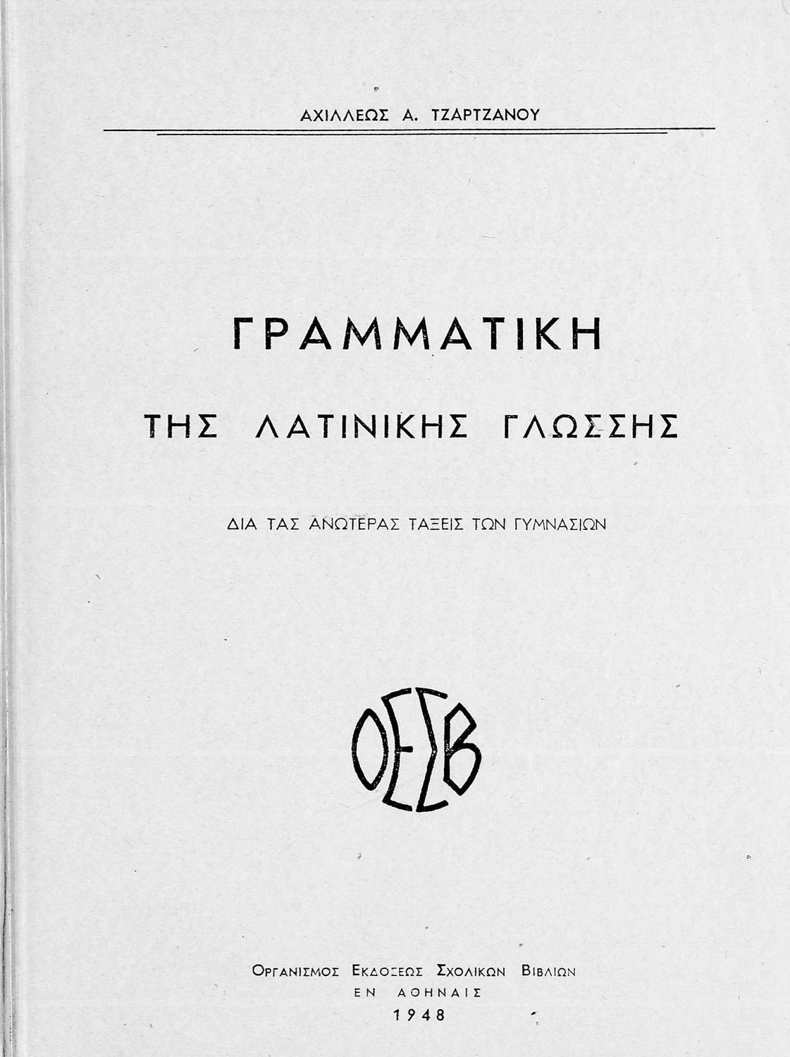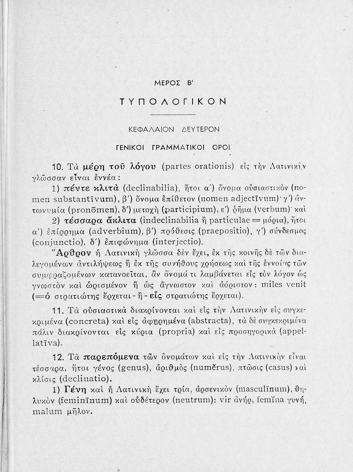 Σχολικό εγχειρίδιο Λατινικών Γυμνασίου που περιλαμβάνει γραμματική και συντακτικό και είναι χωρισμένο σε φθογγολογικό, τυπολογικό και ετυμολογικό μέρος.