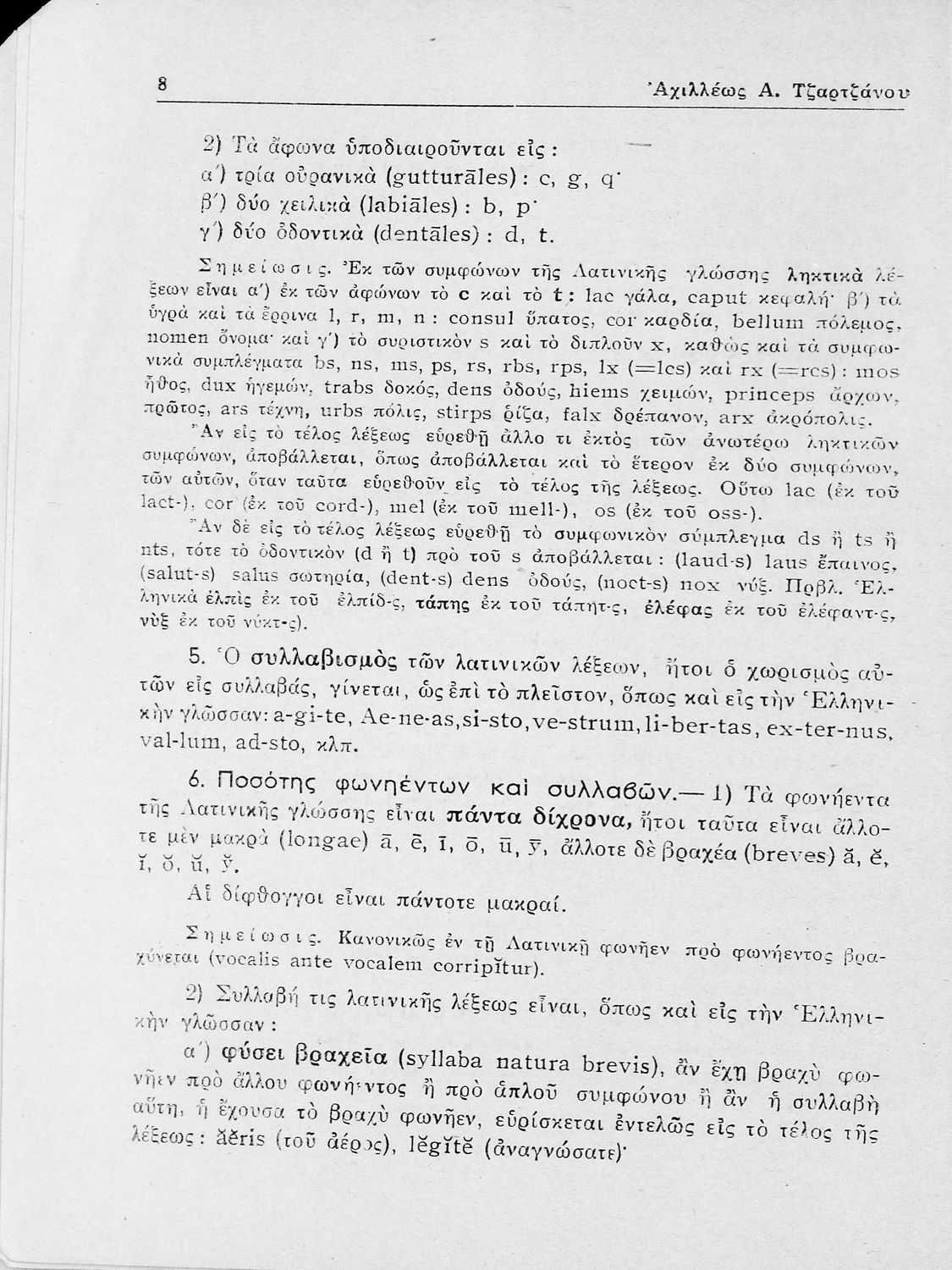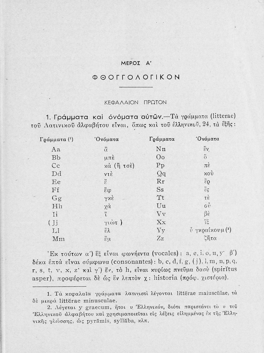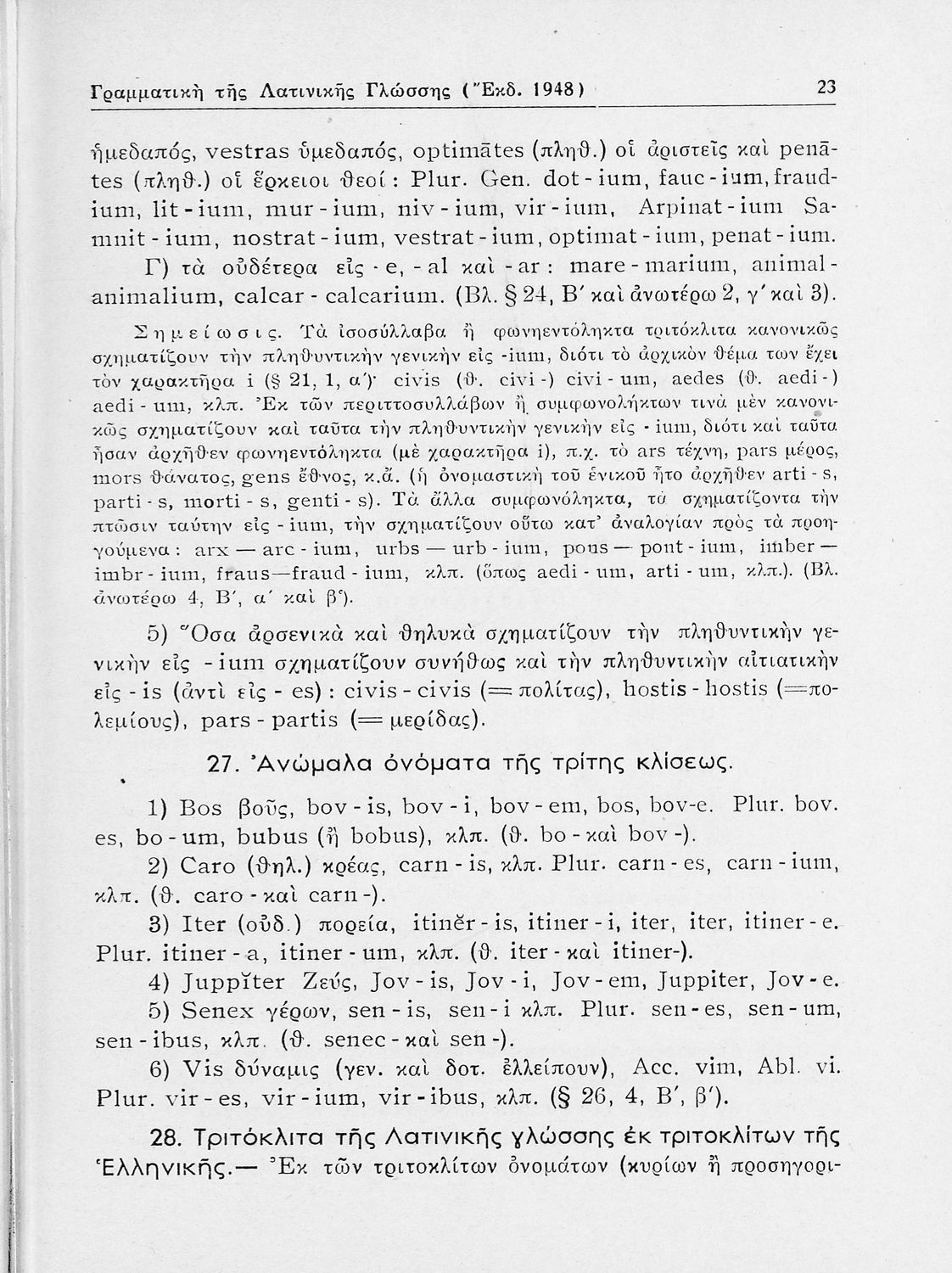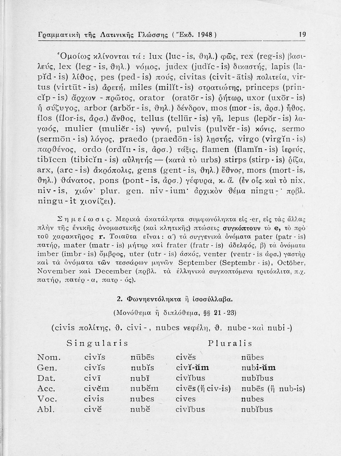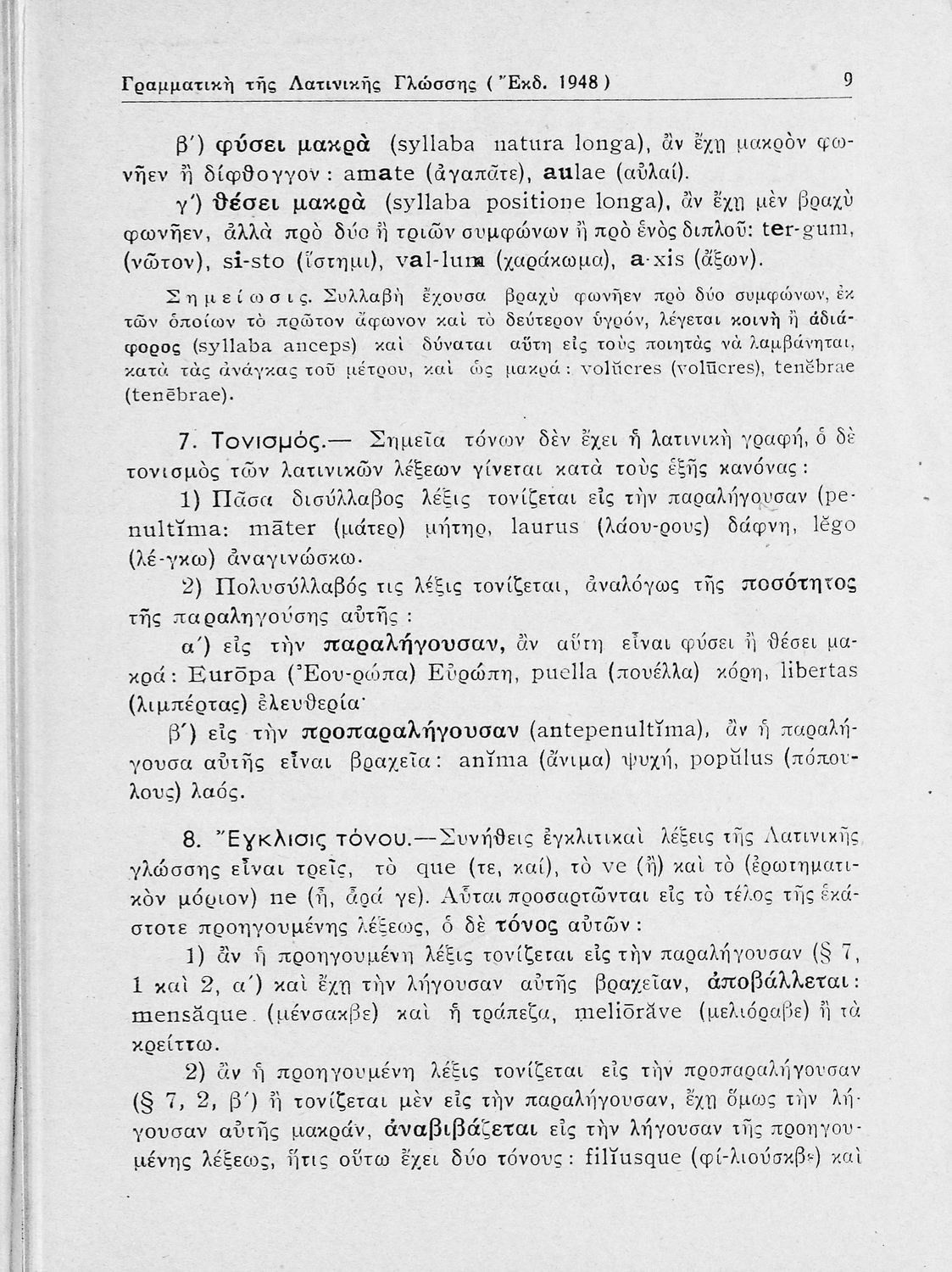 Σχολικό εγχειρίδιο Λατινικών Γυμνασίου που περιλαμβάνει γραμματική και συντακτικό και είναι χωρισμένο σε φθογγολογικό, τυπολογικό και ετυμολογικό μέρος.