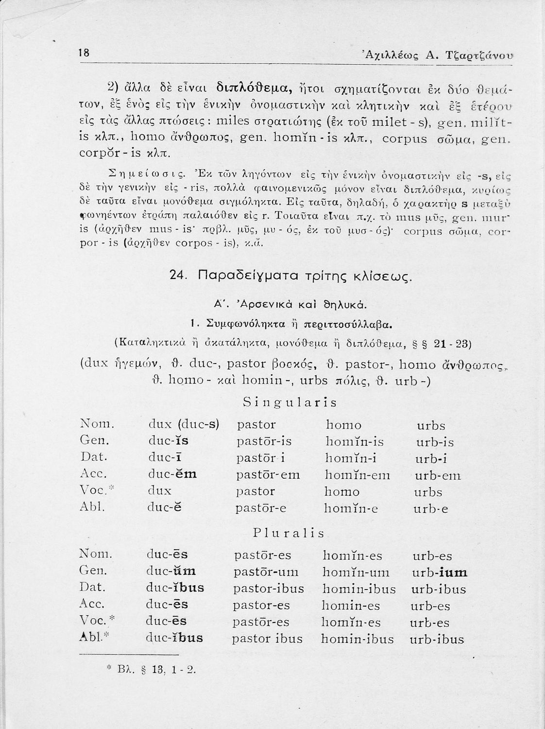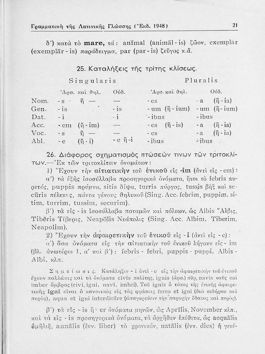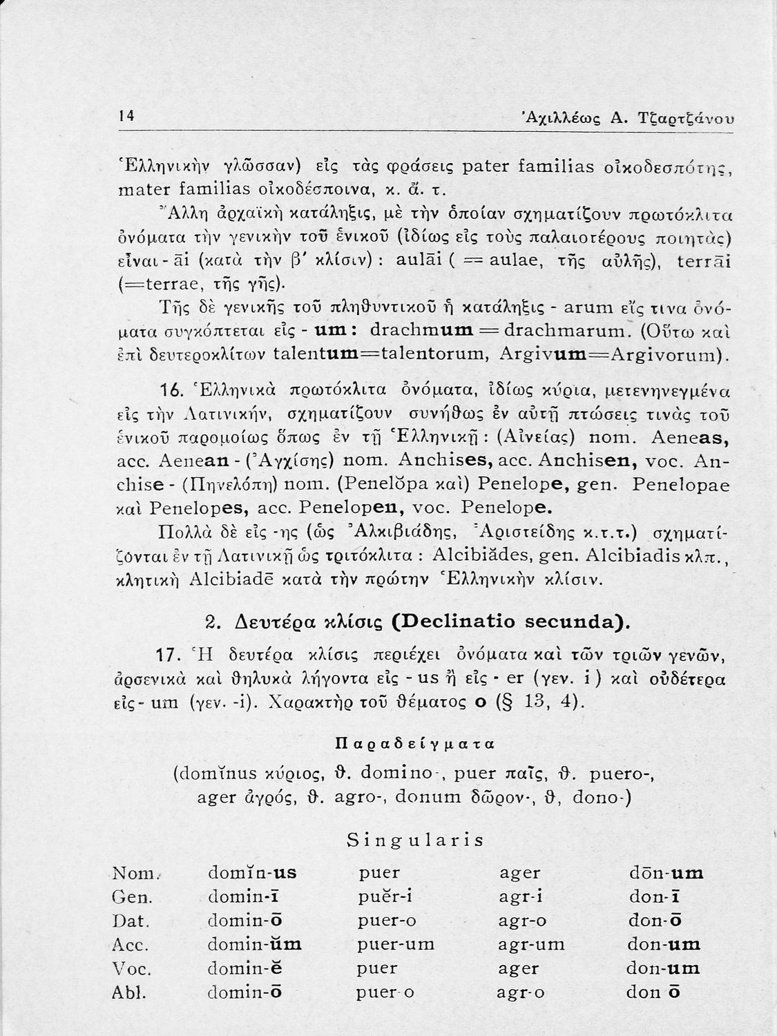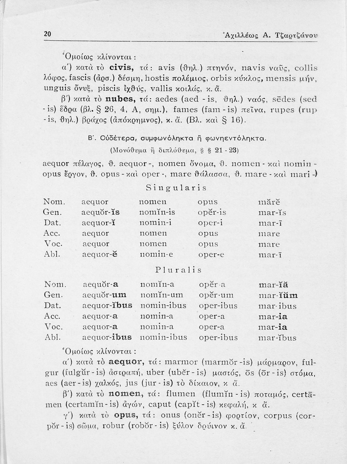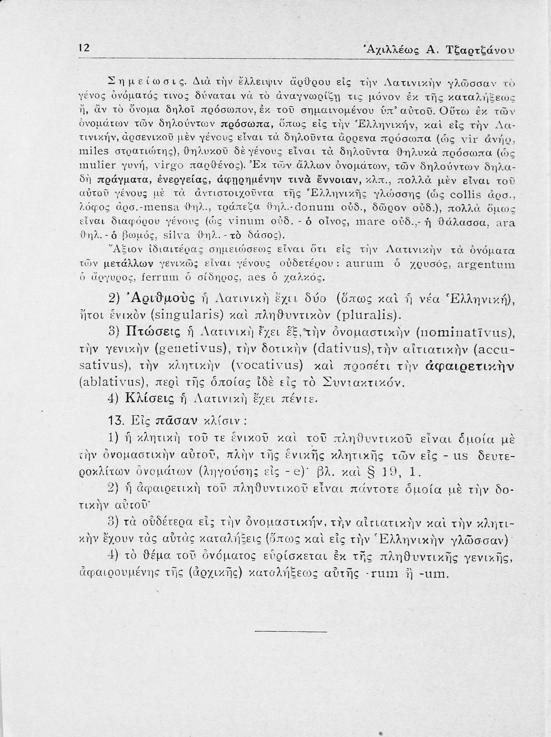 Σχολικό εγχειρίδιο Λατινικών Γυμνασίου που περιλαμβάνει γραμματική και συντακτικό και είναι χωρισμένο σε φθογγολογικό, τυπολογικό και ετυμολογικό μέρος.