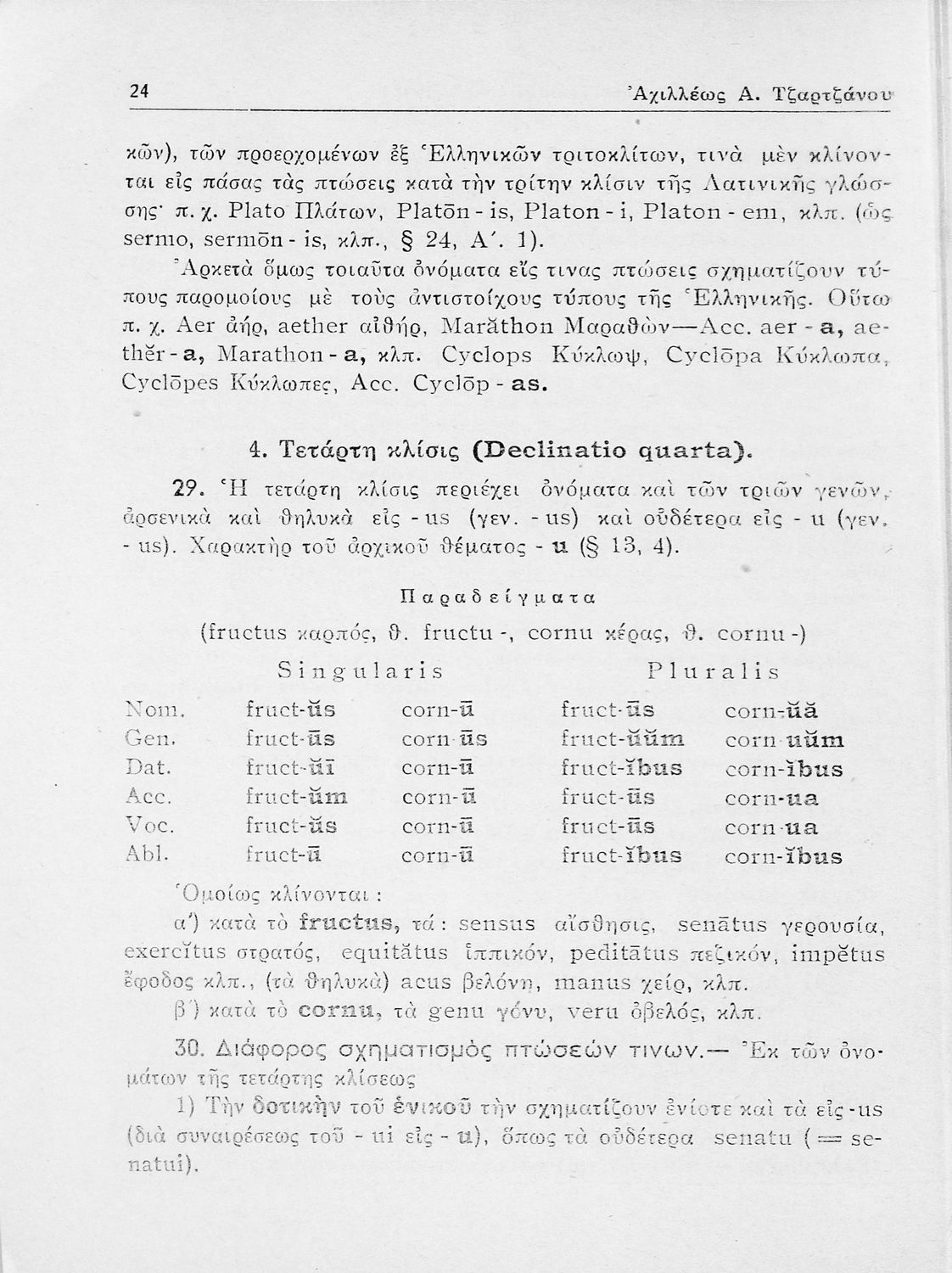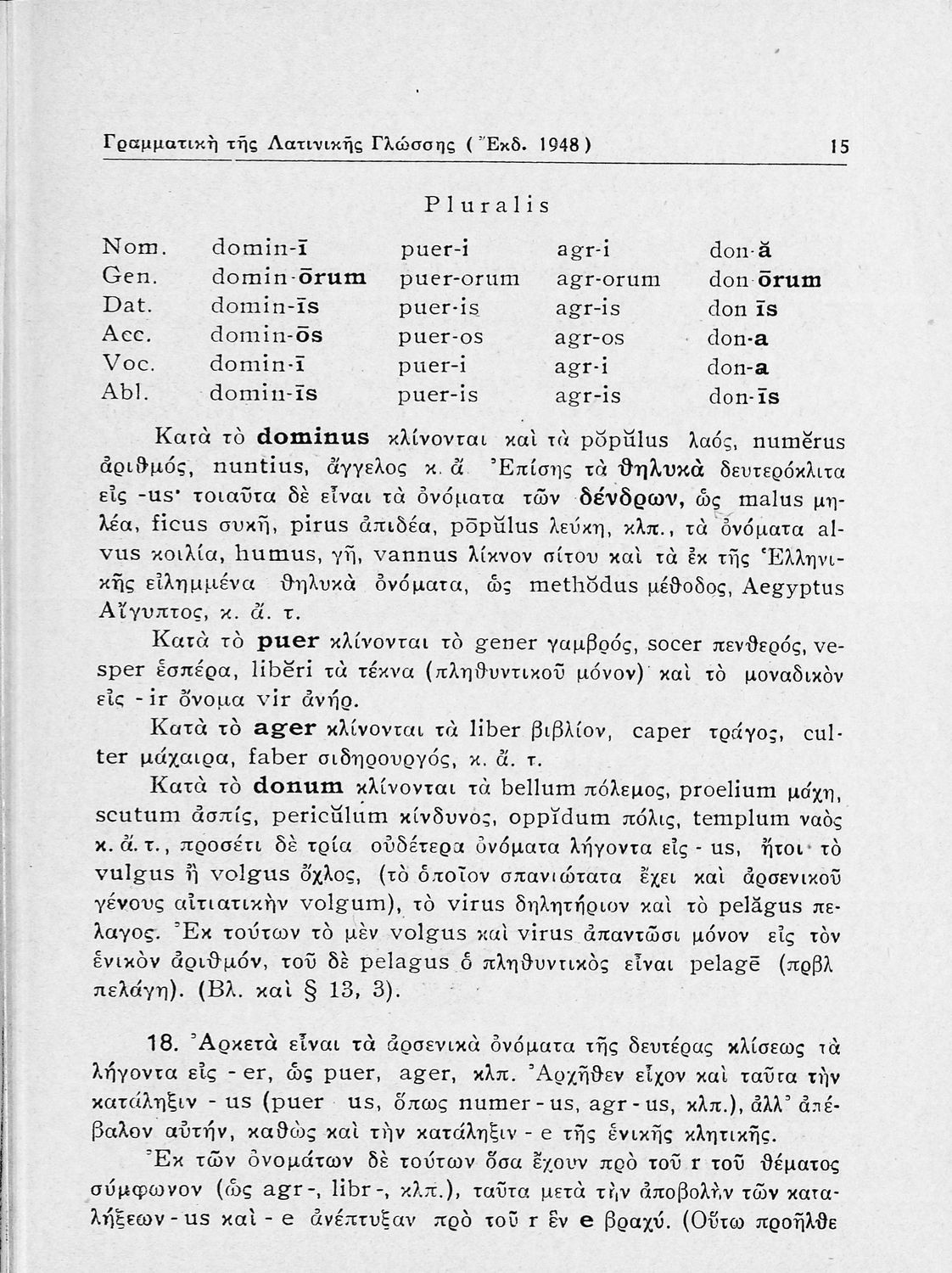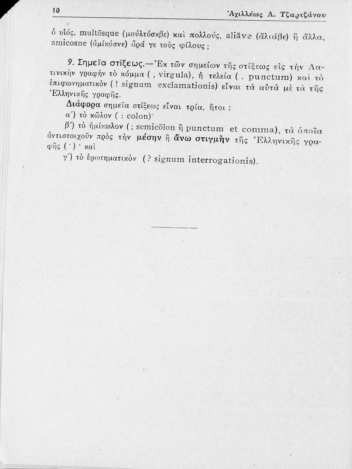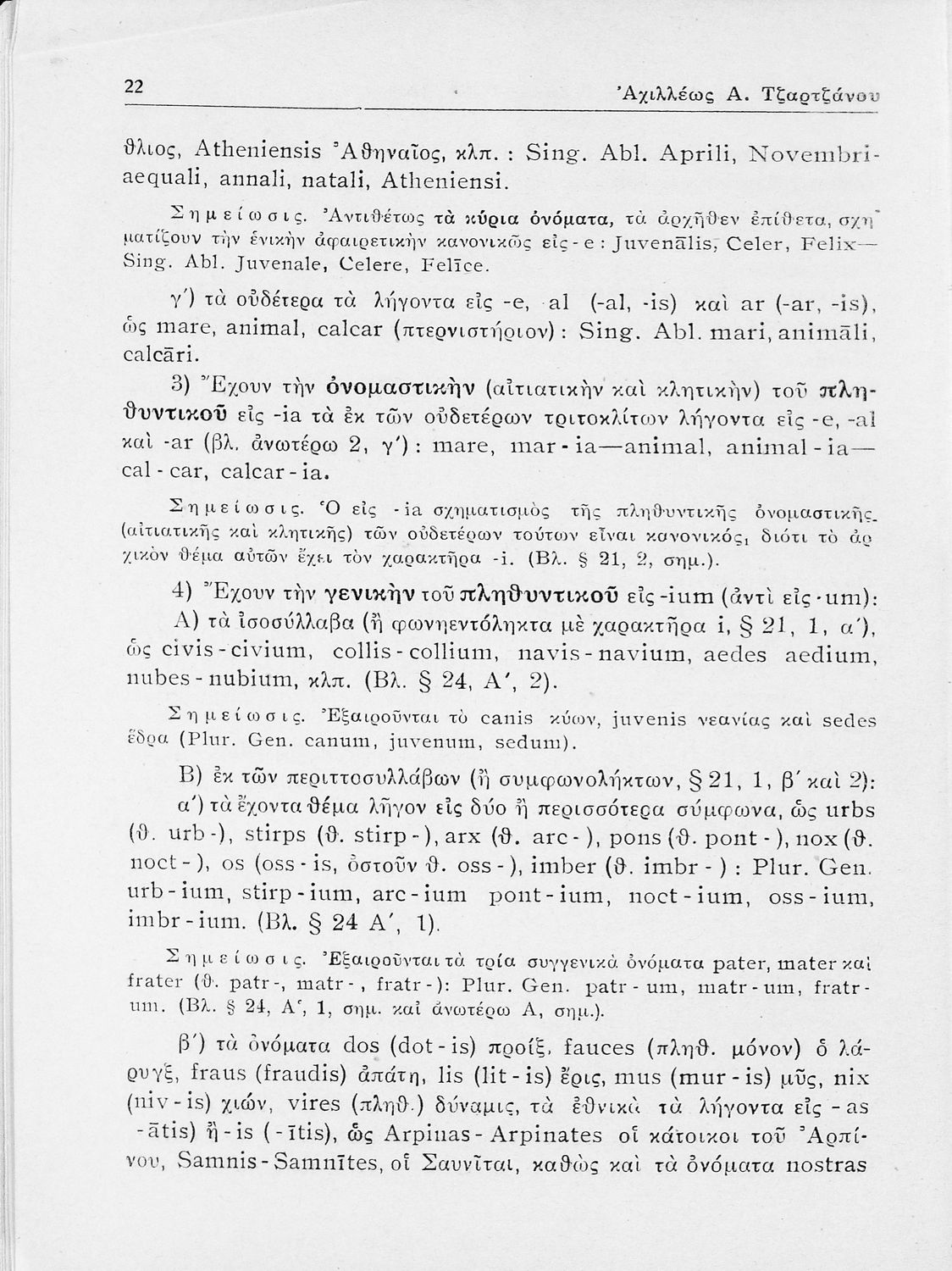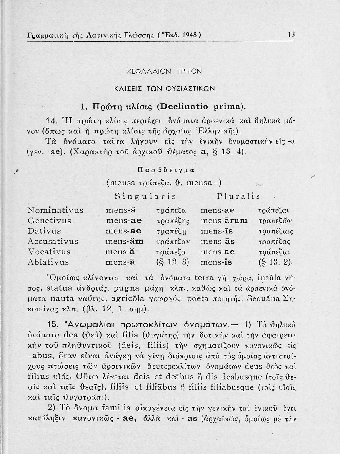 Σχολικό εγχειρίδιο Λατινικών Γυμνασίου που περιλαμβάνει γραμματική και συντακτικό και είναι χωρισμένο σε φθογγολογικό, τυπολογικό και ετυμολογικό μέρος.