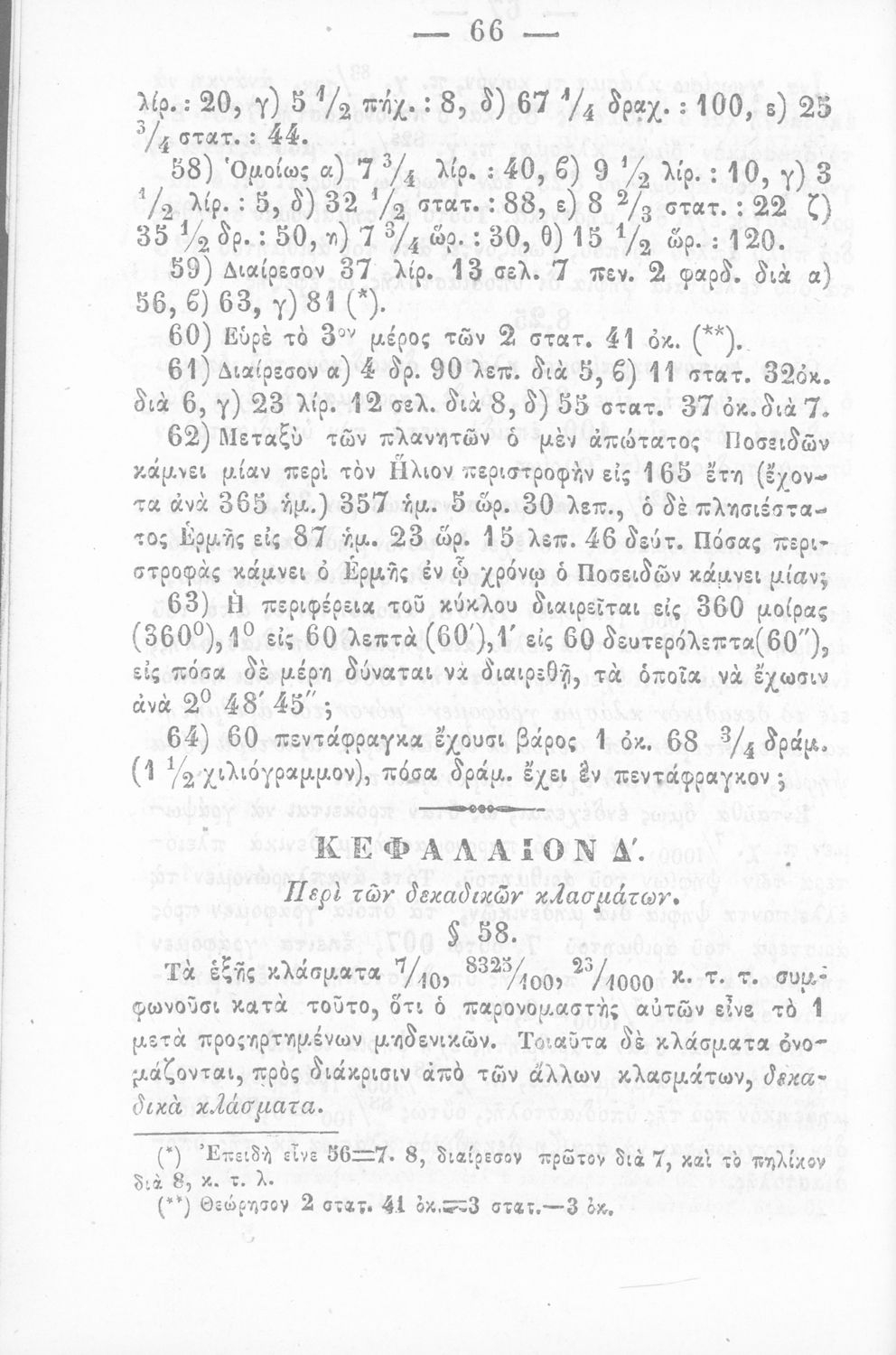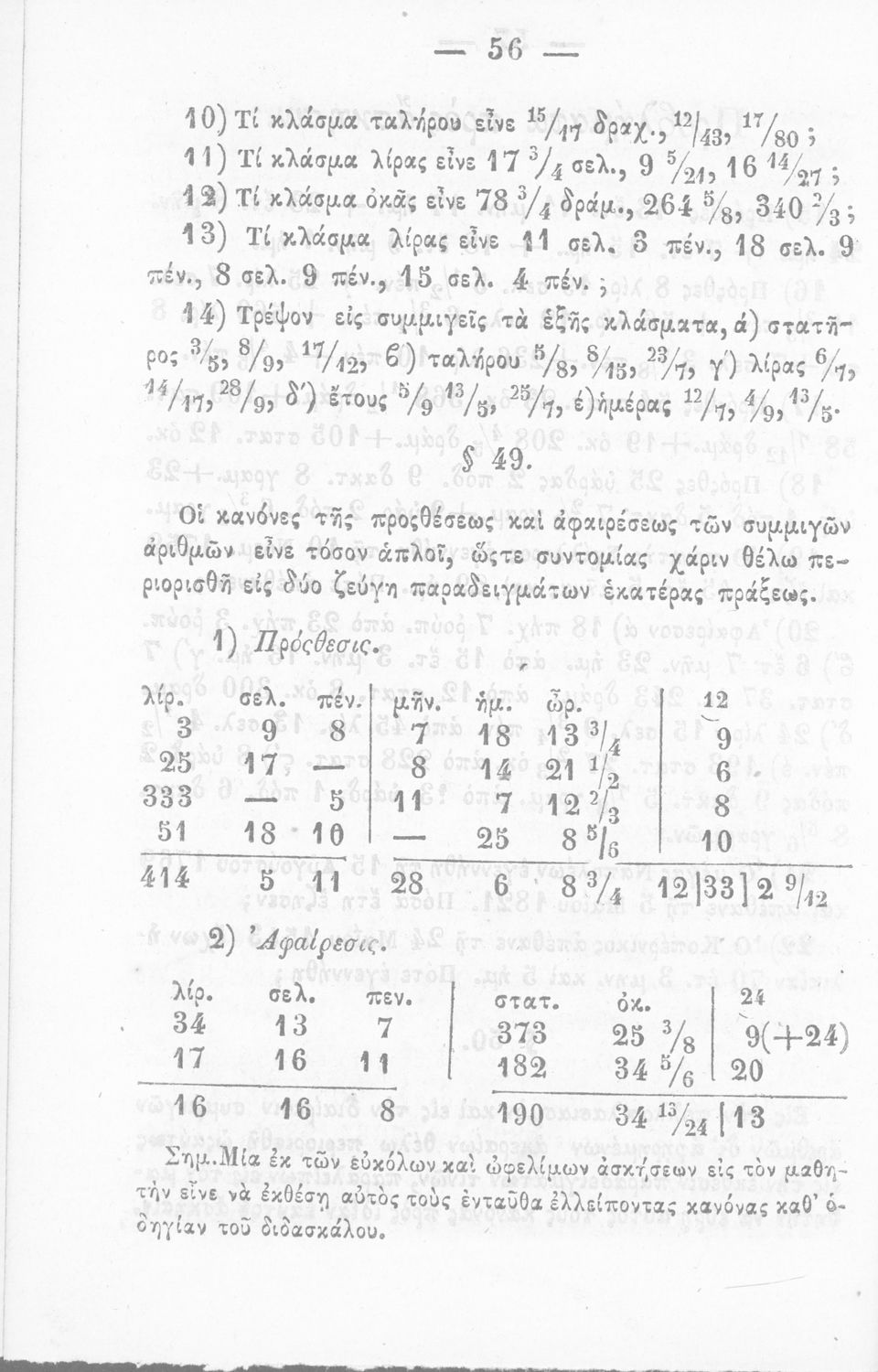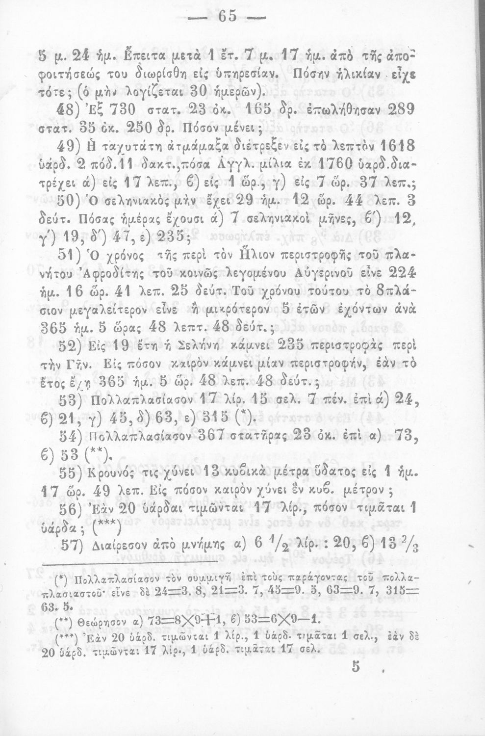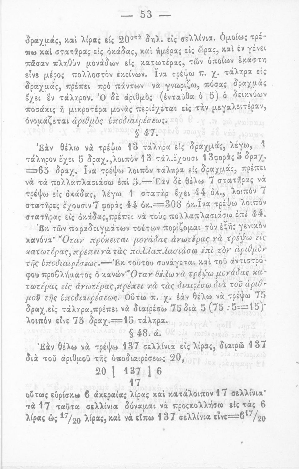 Σχολικό εγχειρίδιο Αριθμητικής που εστιάζει στις αριθμητικές πράξεις και τις εφαρμογές τους. Ο συγγραφέας κρίνει την αναλυτική μέθοδο ως προσφορότερη για την Στοιχειώδη Εκπαίδευση και εκθειάζει τον "από μνήμης λογισμόν" που είχε επιβληθεί από τον κανονισμό των Ελληνικών Σχολείων του 1836.