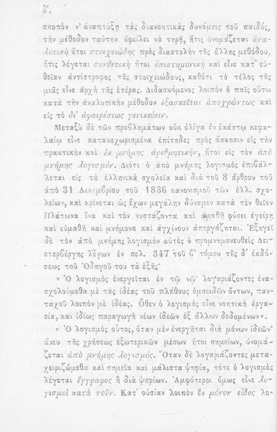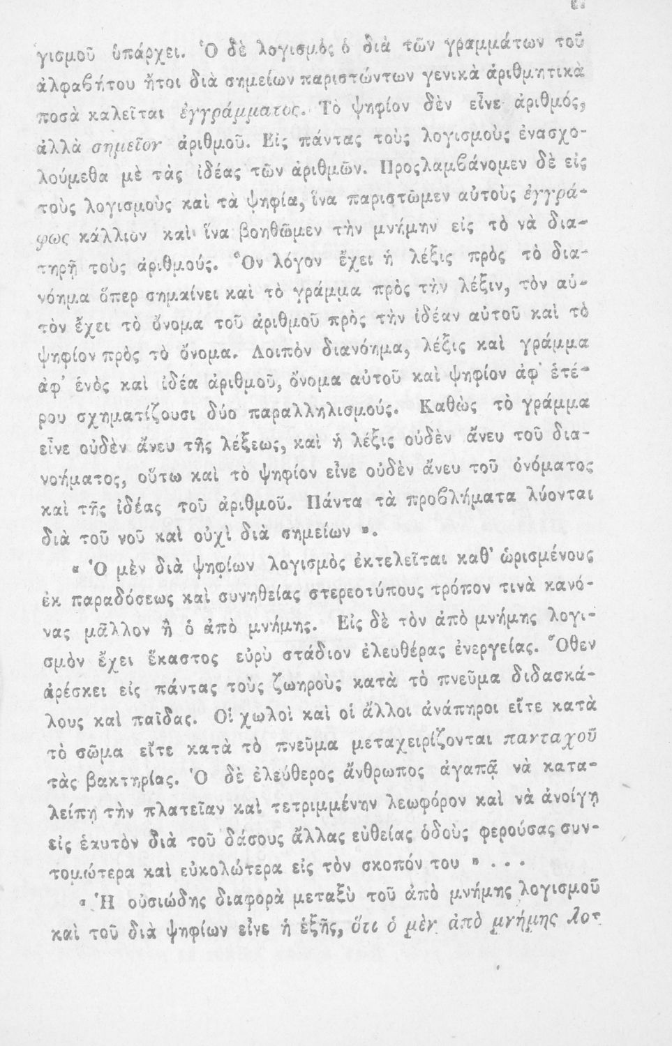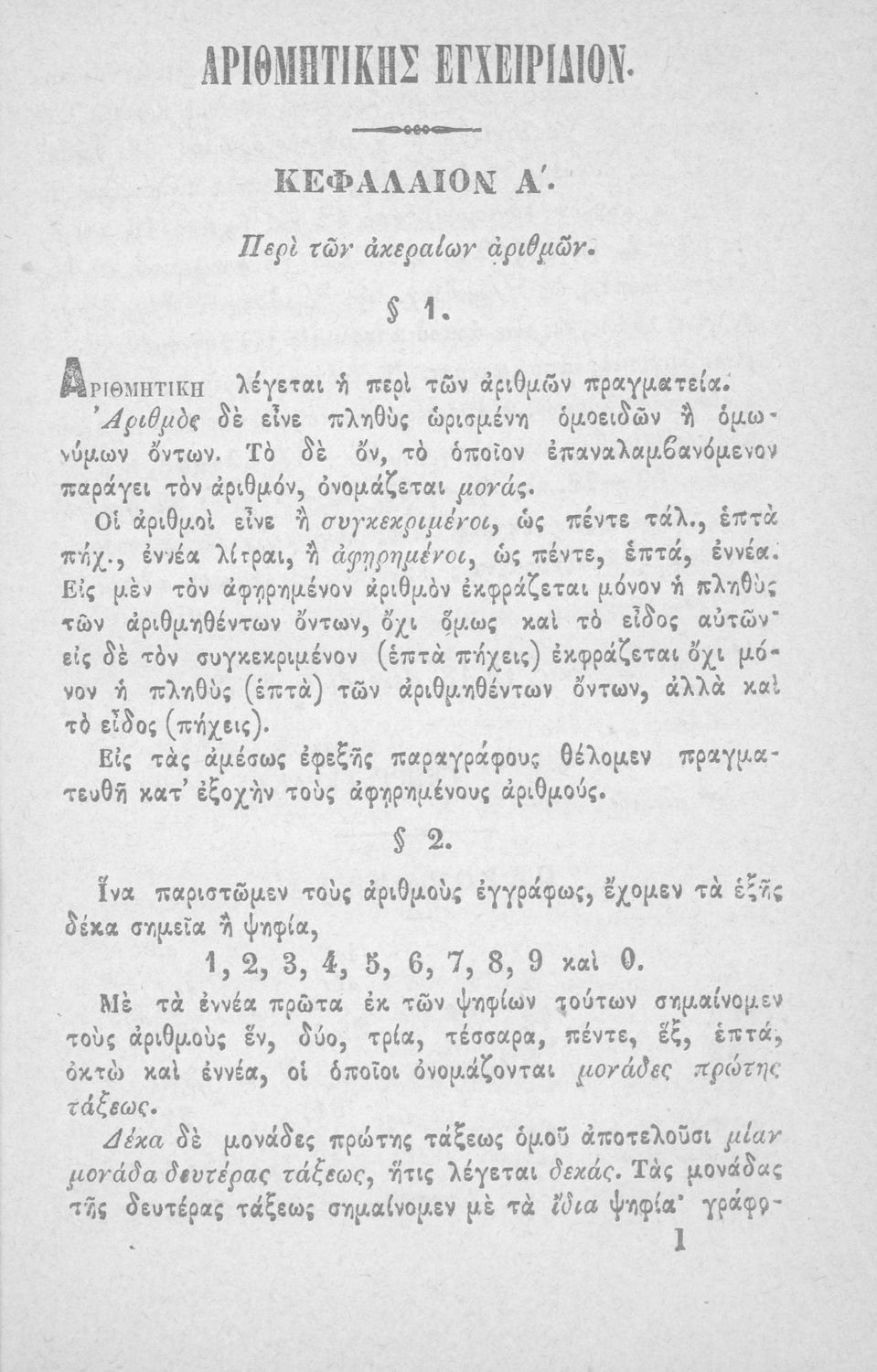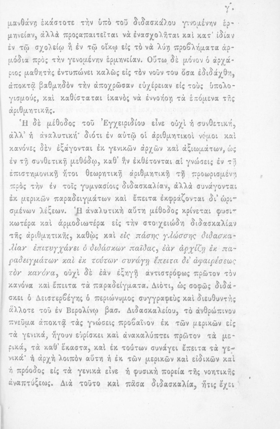 Σχολικό εγχειρίδιο Αριθμητικής που εστιάζει στις αριθμητικές πράξεις και τις εφαρμογές τους. Ο συγγραφέας κρίνει την αναλυτική μέθοδο ως προσφορότερη για την Στοιχειώδη Εκπαίδευση και εκθειάζει τον "από μνήμης λογισμόν" που είχε επιβληθεί από τον κανονισμό των Ελληνικών Σχολείων του 1836.