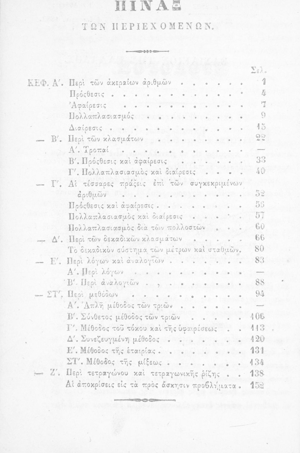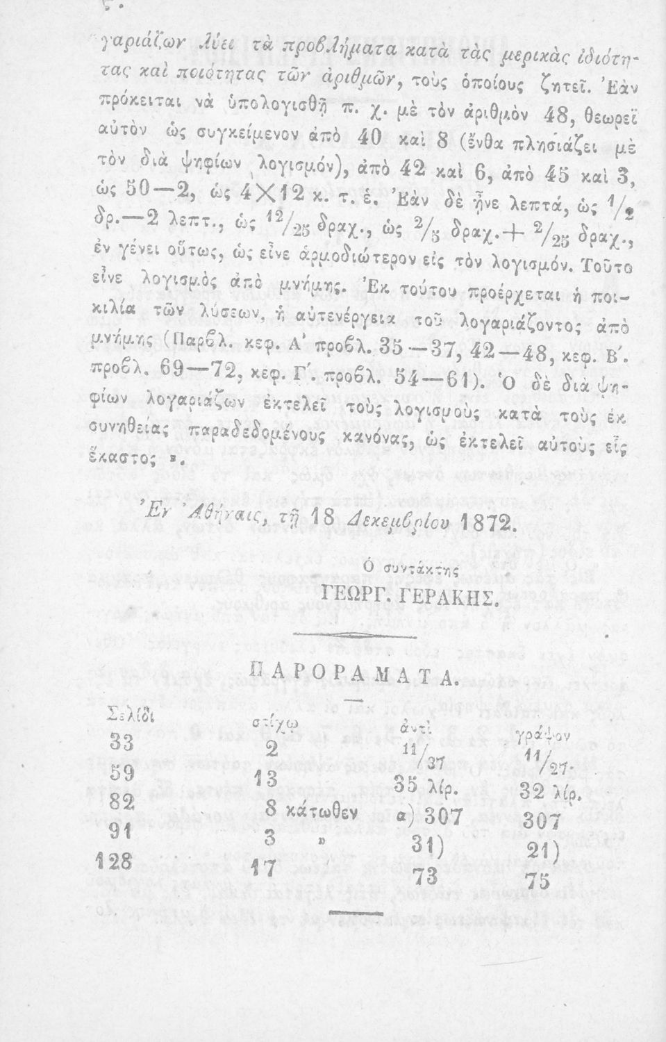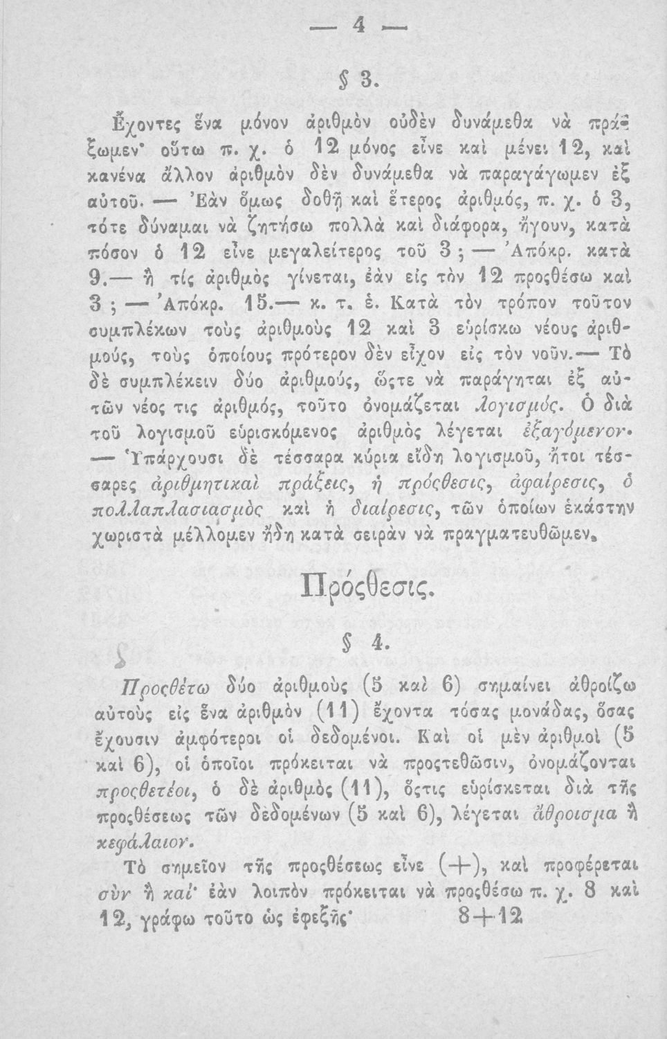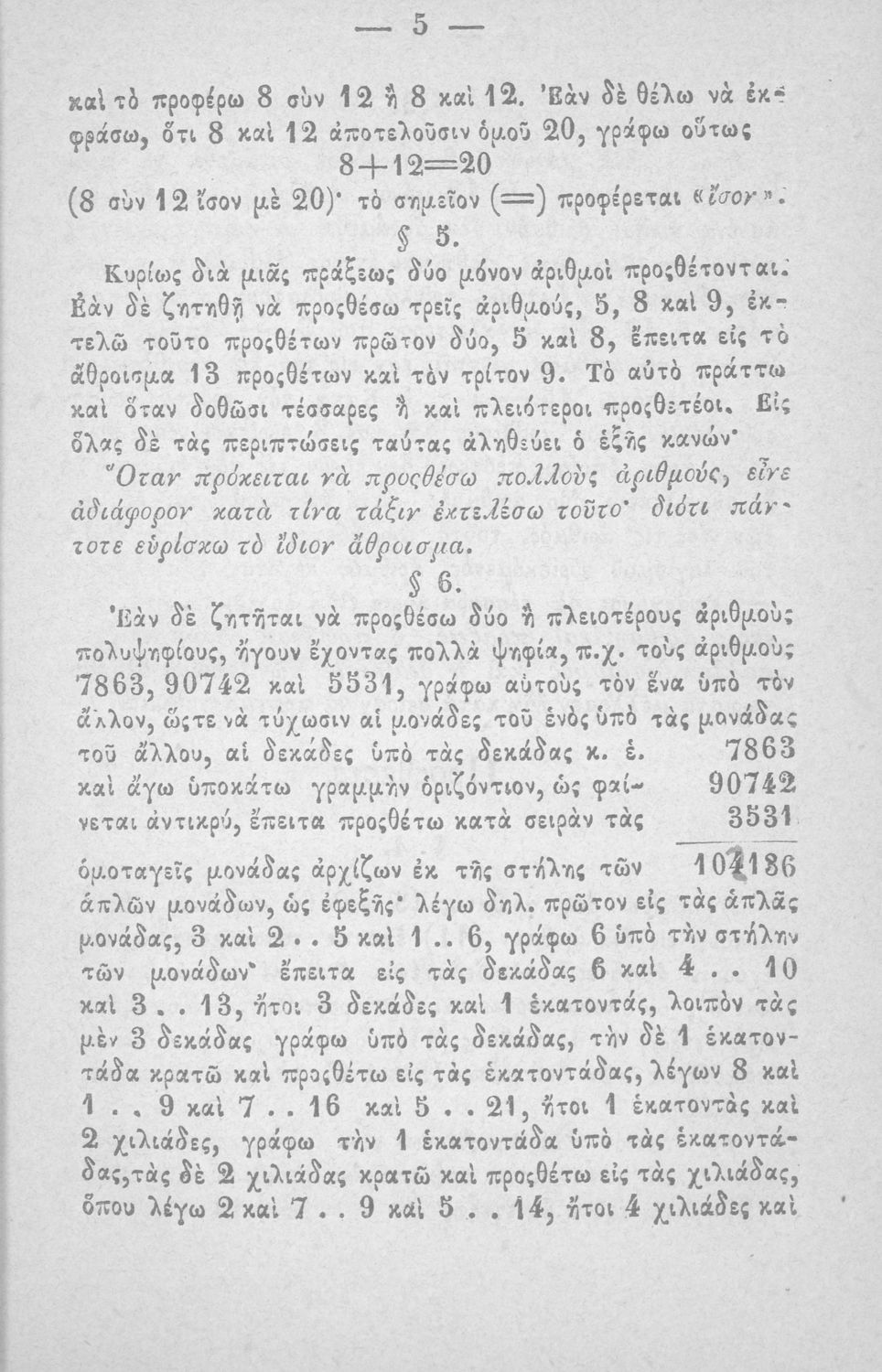 Σχολικό εγχειρίδιο Αριθμητικής που εστιάζει στις αριθμητικές πράξεις και τις εφαρμογές τους. Ο συγγραφέας κρίνει την αναλυτική μέθοδο ως προσφορότερη για την Στοιχειώδη Εκπαίδευση και εκθειάζει τον "από μνήμης λογισμόν" που είχε επιβληθεί από τον κανονισμό των Ελληνικών Σχολείων του 1836.