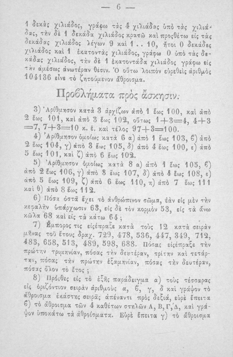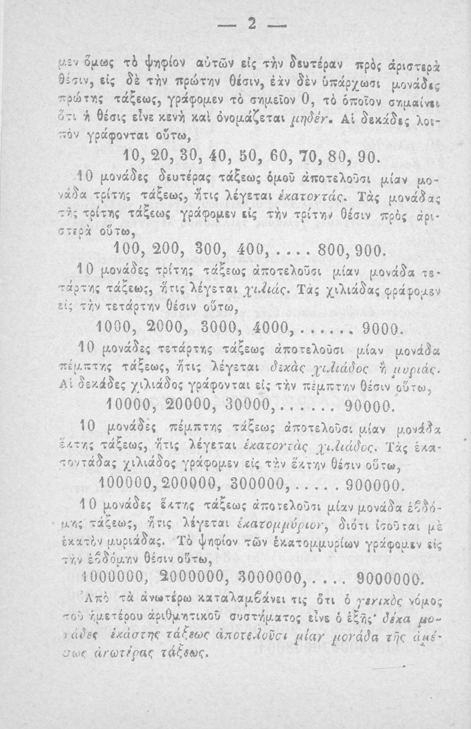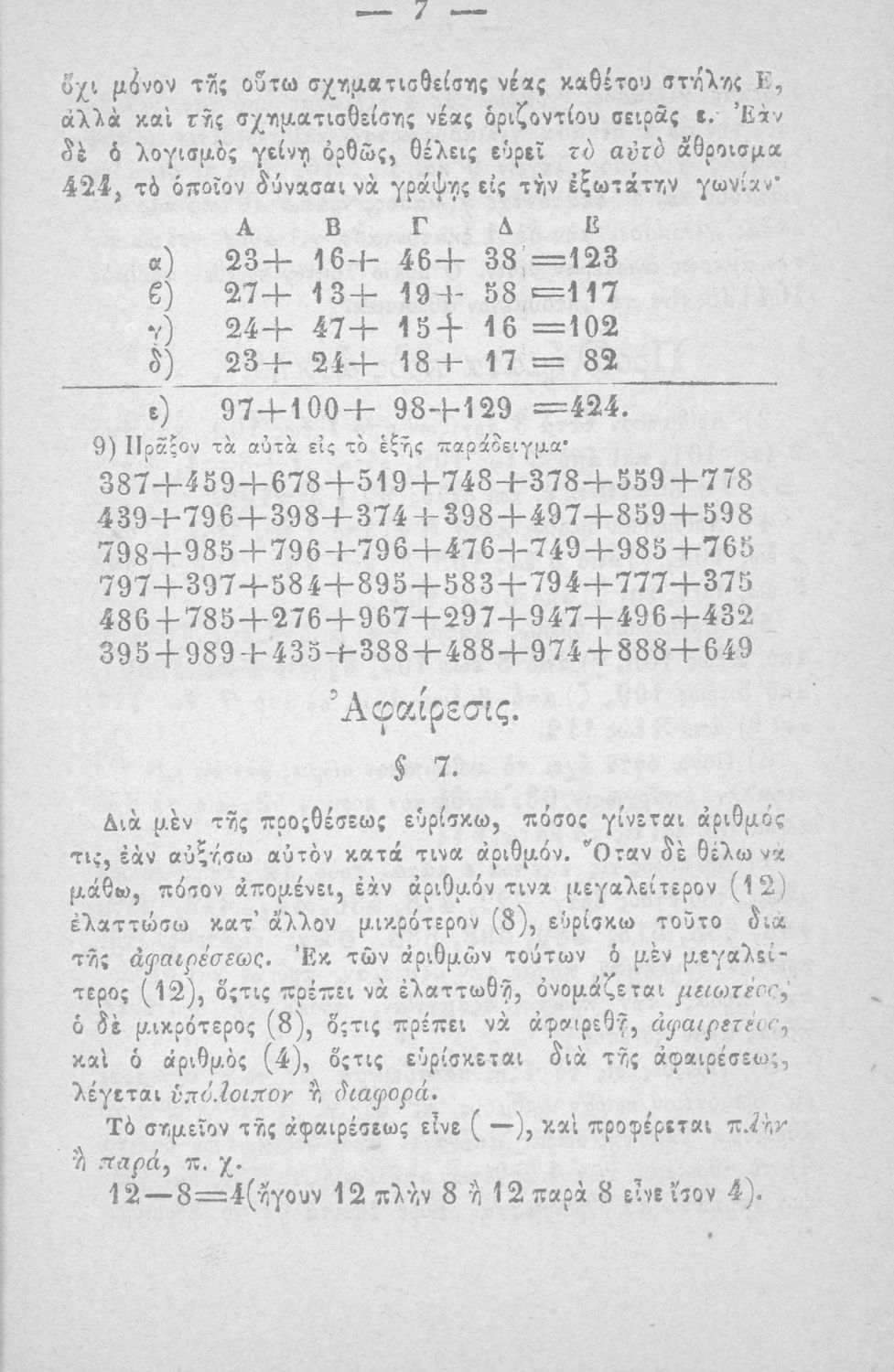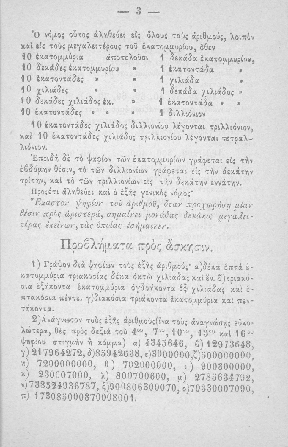 Σχολικό εγχειρίδιο Αριθμητικής που εστιάζει στις αριθμητικές πράξεις και τις εφαρμογές τους. Ο συγγραφέας κρίνει την αναλυτική μέθοδο ως προσφορότερη για την Στοιχειώδη Εκπαίδευση και εκθειάζει τον "από μνήμης λογισμόν" που είχε επιβληθεί από τον κανονισμό των Ελληνικών Σχολείων του 1836.