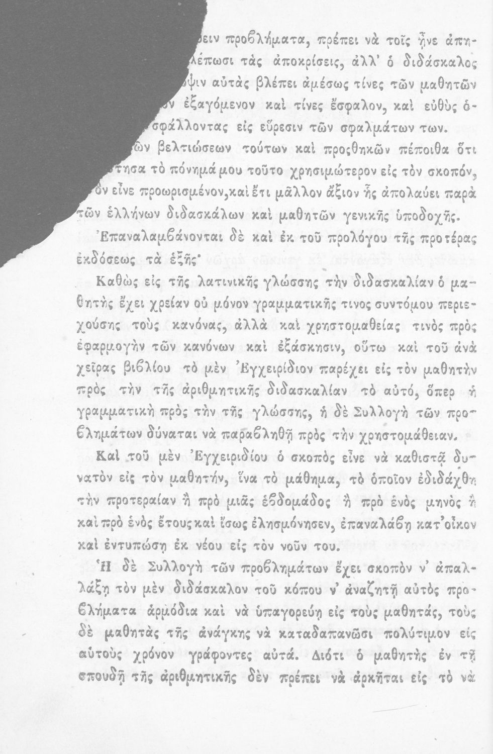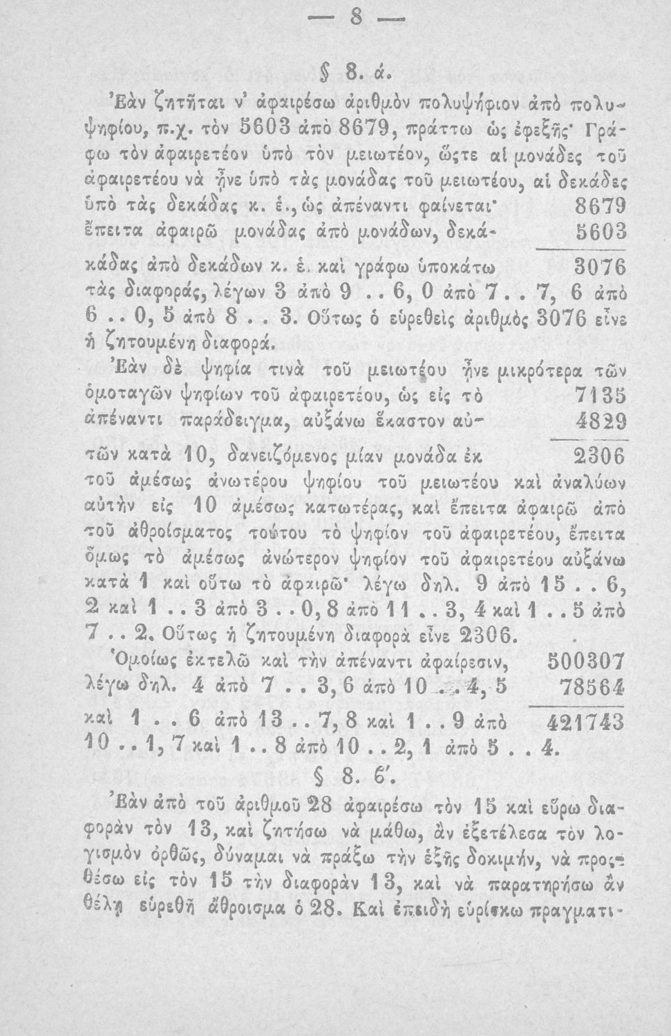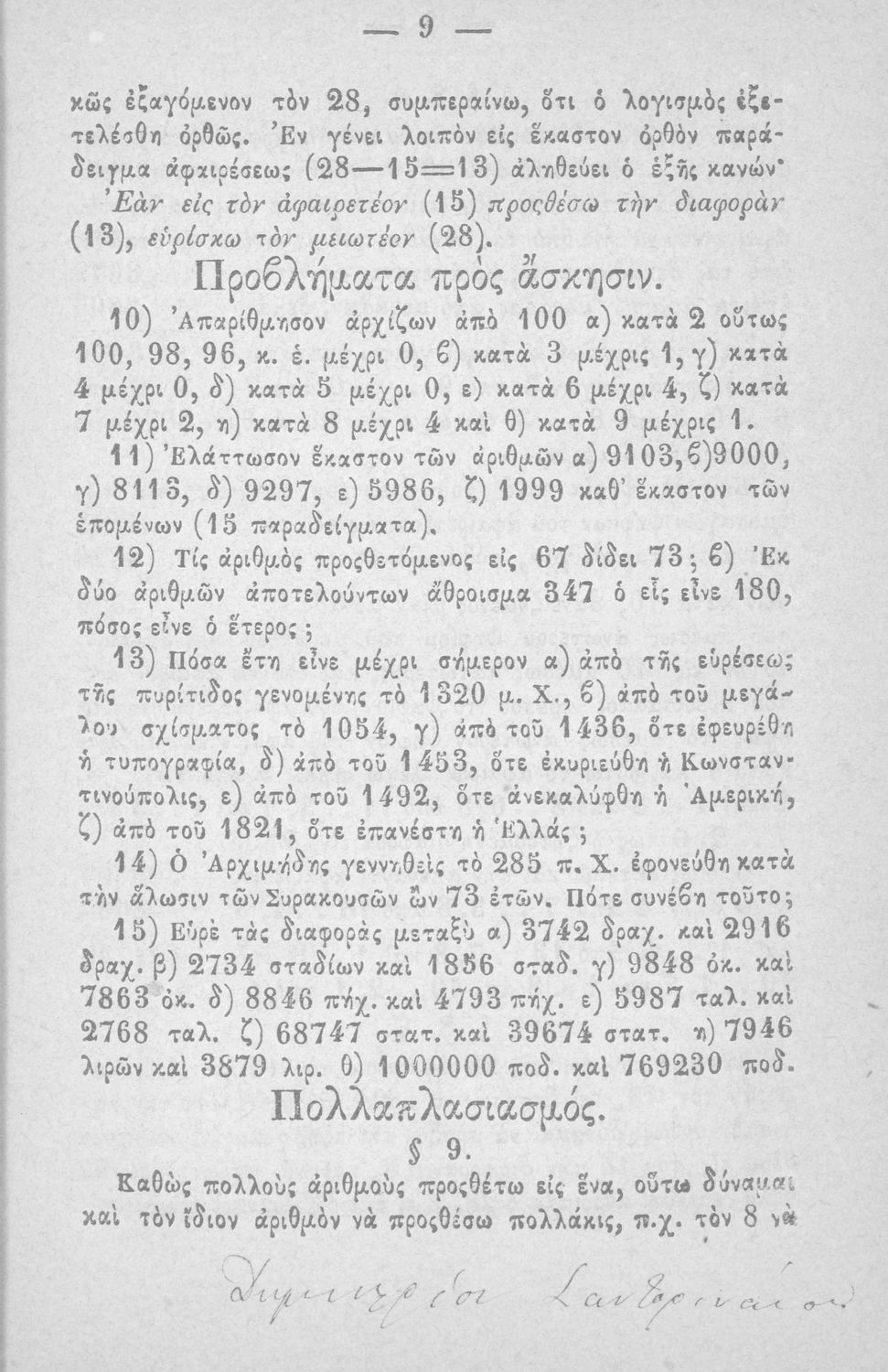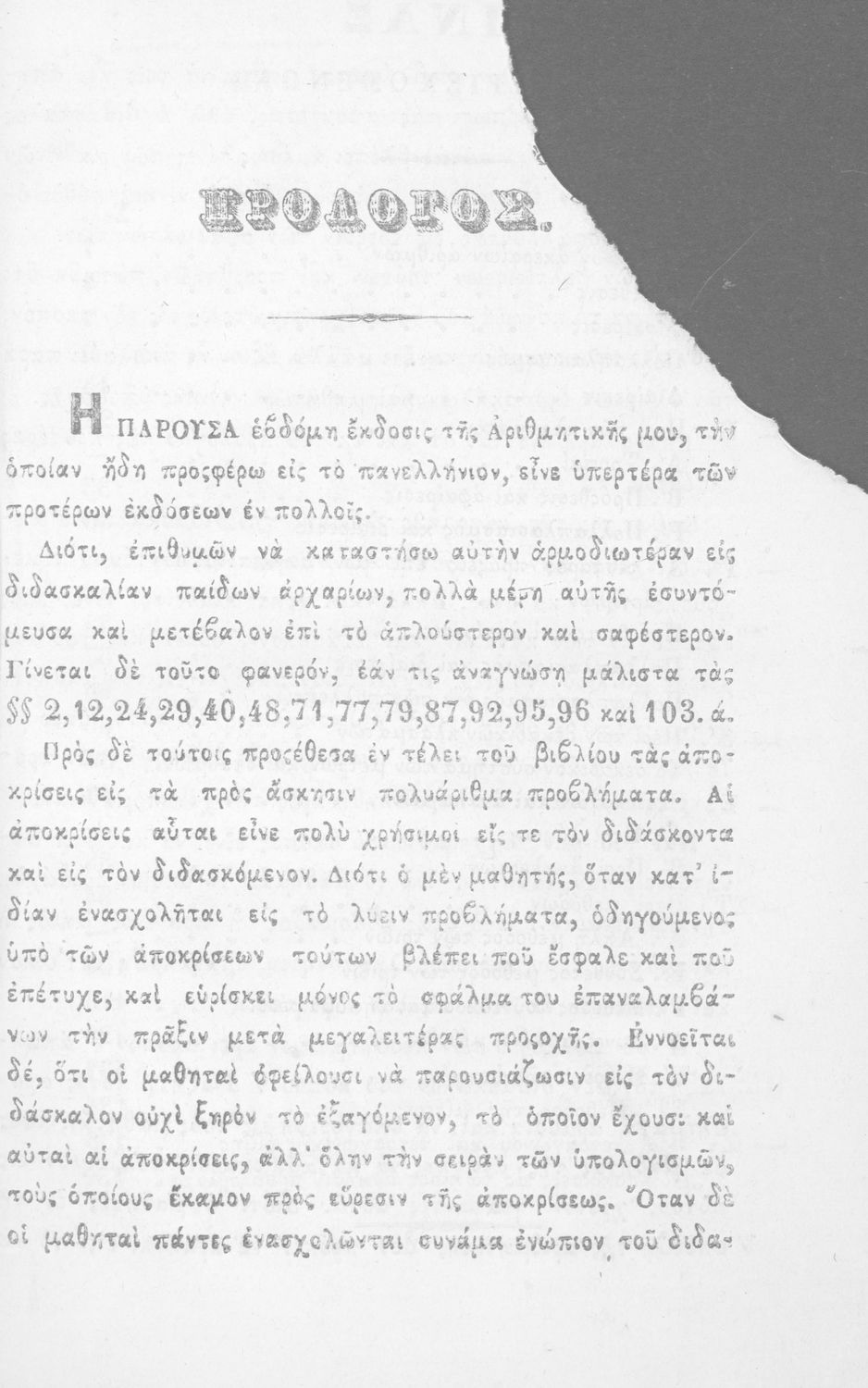 Σχολικό εγχειρίδιο Αριθμητικής που εστιάζει στις αριθμητικές πράξεις και τις εφαρμογές τους. Ο συγγραφέας κρίνει την αναλυτική μέθοδο ως προσφορότερη για την Στοιχειώδη Εκπαίδευση και εκθειάζει τον "από μνήμης λογισμόν" που είχε επιβληθεί από τον κανονισμό των Ελληνικών Σχολείων του 1836.