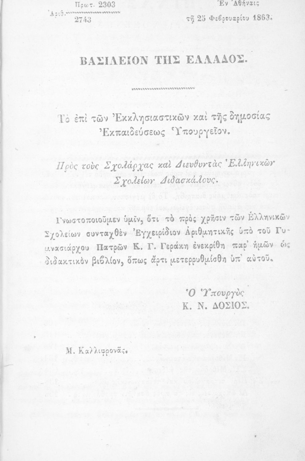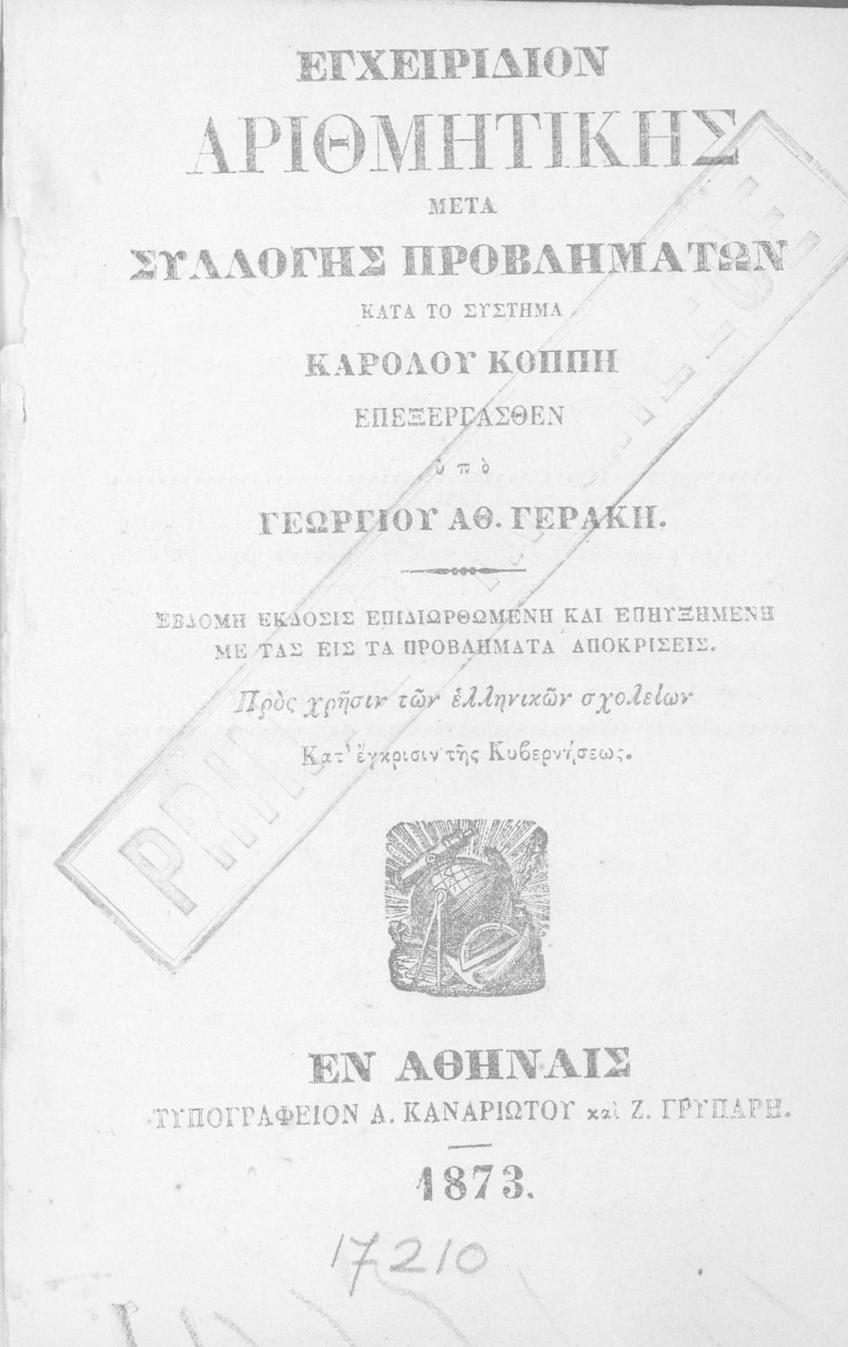 Εκδότης: Α. Καναρινής και Ζ. Γρυπάρης Έτος έκδοσης: 1873 Τόπος έκδοσης: Αθήνα Έκδοση: 7η Υπουργική απόφαση / Σύμβαση: 2303/25-2-1863 Έτος έγκρισης: 1863 |