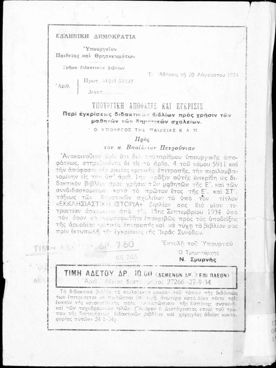 Υπουργική απόφαση / Σύμβαση: 51231/20-8-1934