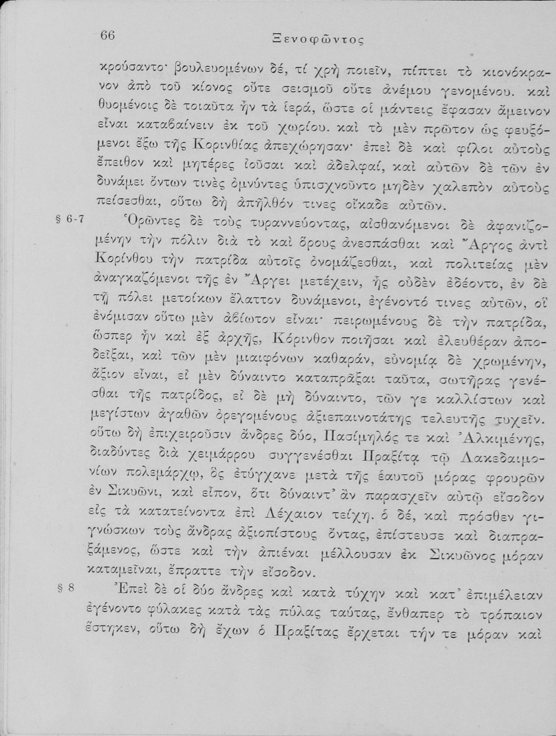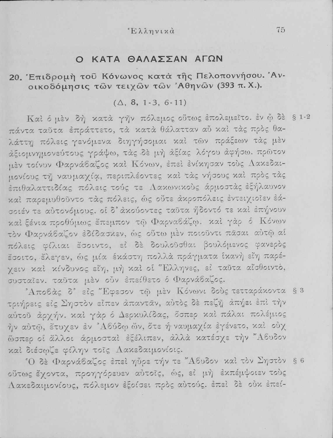 Σχολικό εγχειρίδιο Αρχαίων Ελληνικών Β΄ Γυμνασίου που περιλαμβάνει εισαγωγή στα Ελληνικά του Ξενοφώντα, το 3ο και το 4ο βιβλίο από τα Ελληνικά, ερμηνευτικές σημειώσεις και χωρογραφικό πίνακα της περιοχής.