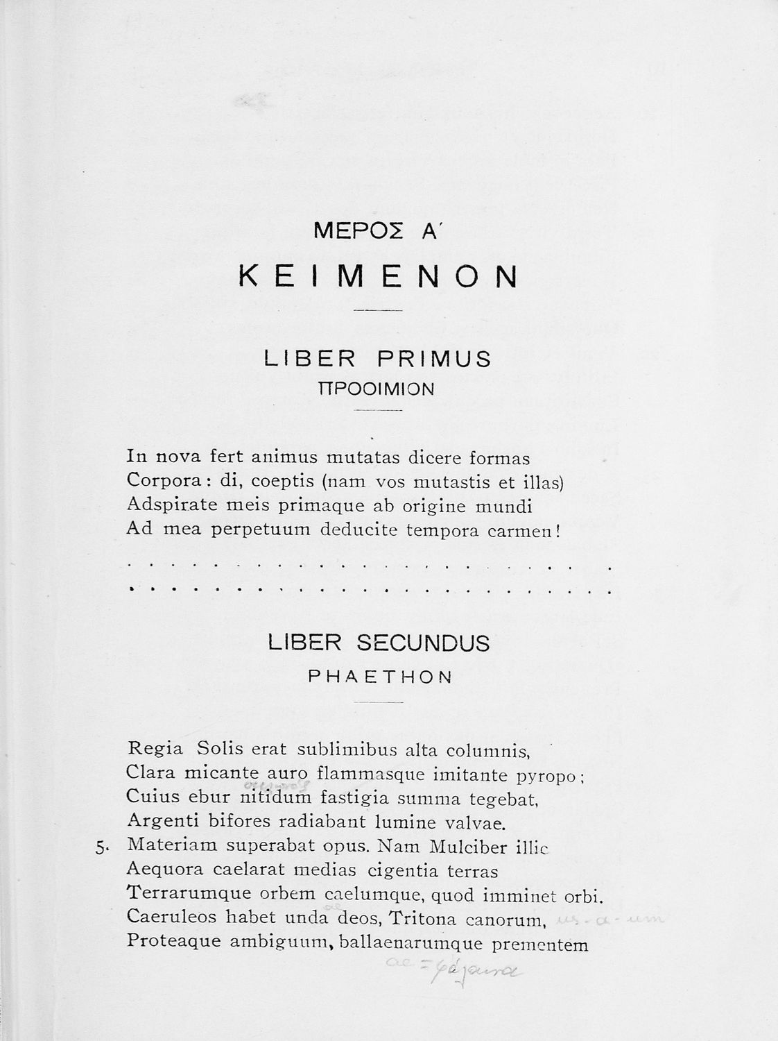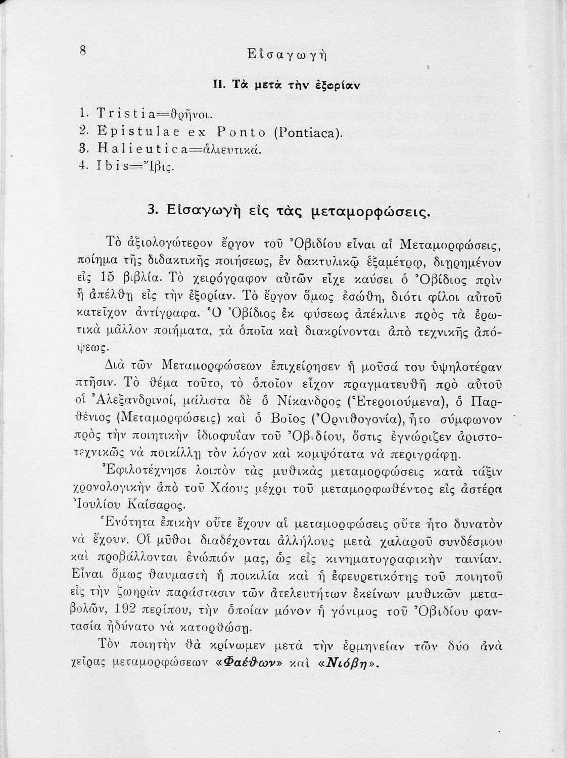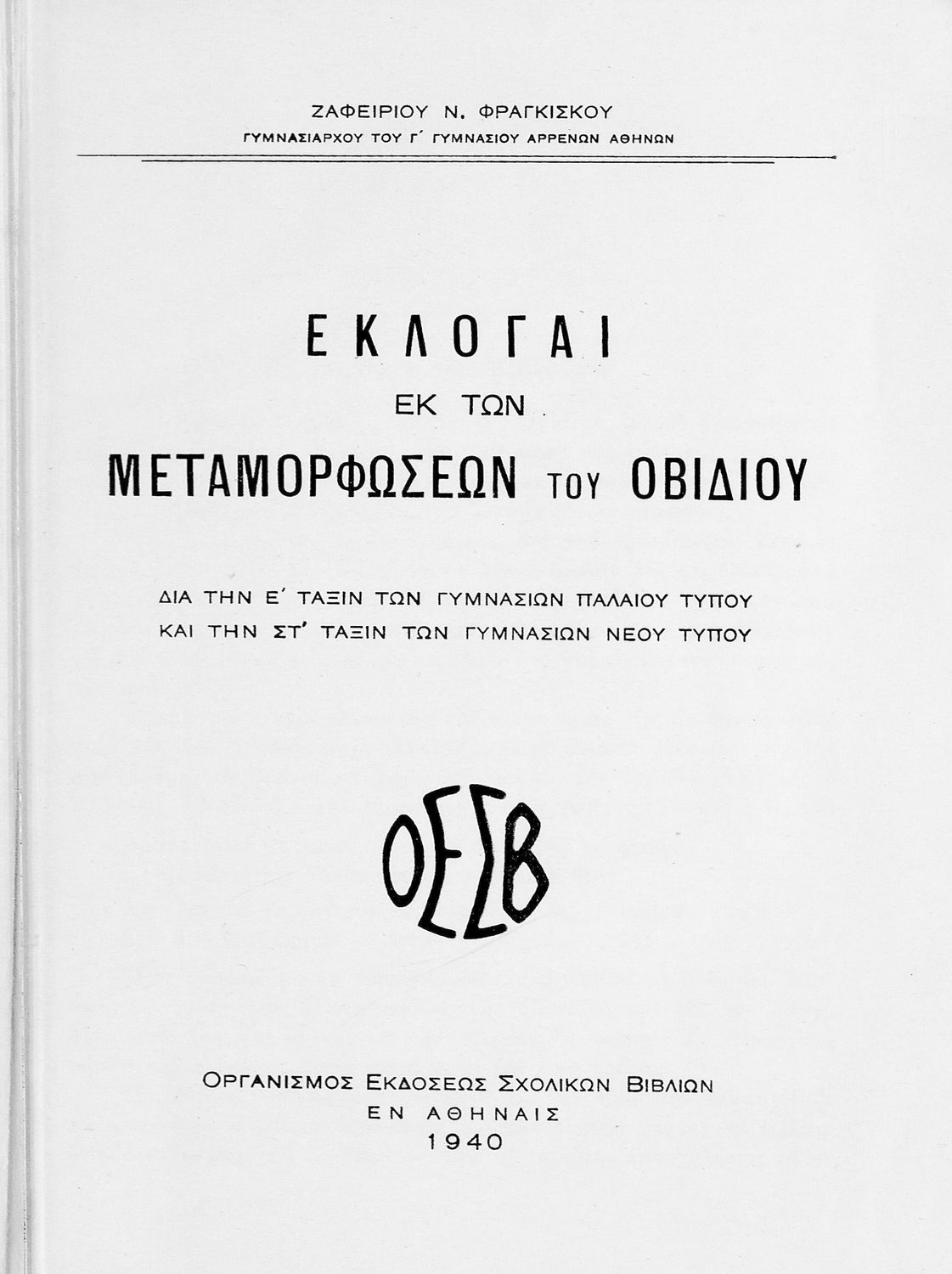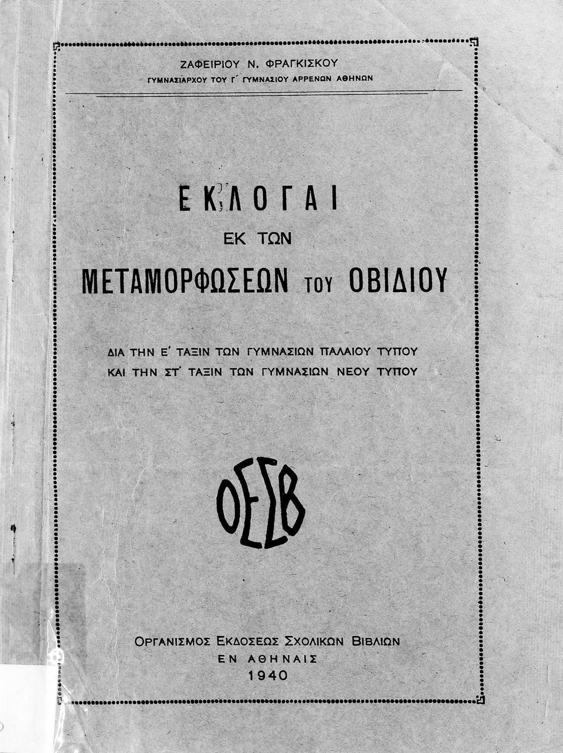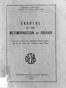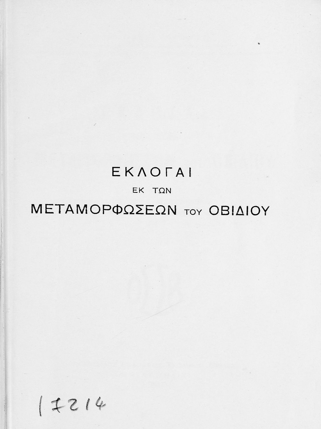 Σχολικό εγχειρίδιο Λατινικών για την Ε΄ Γυμνασίου παλαιού τύπου και την ΣΤ΄ Γυμνασίου νέου τύπου που περιέχει βιογραφικό σημείωμα του Οβίδιου, εισαγωγικά σχόλια, αποσπάσματα από τις Μεταμορφώσεις και ερμηνευτικές σημειώσεις.